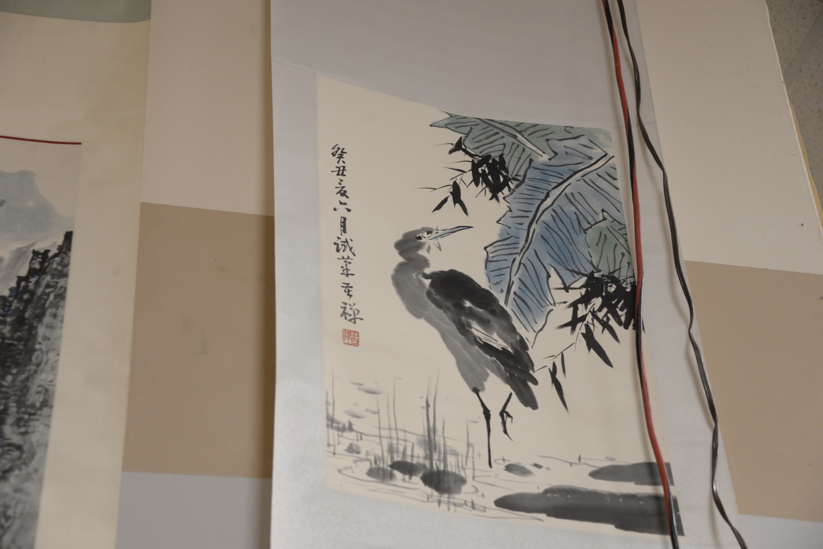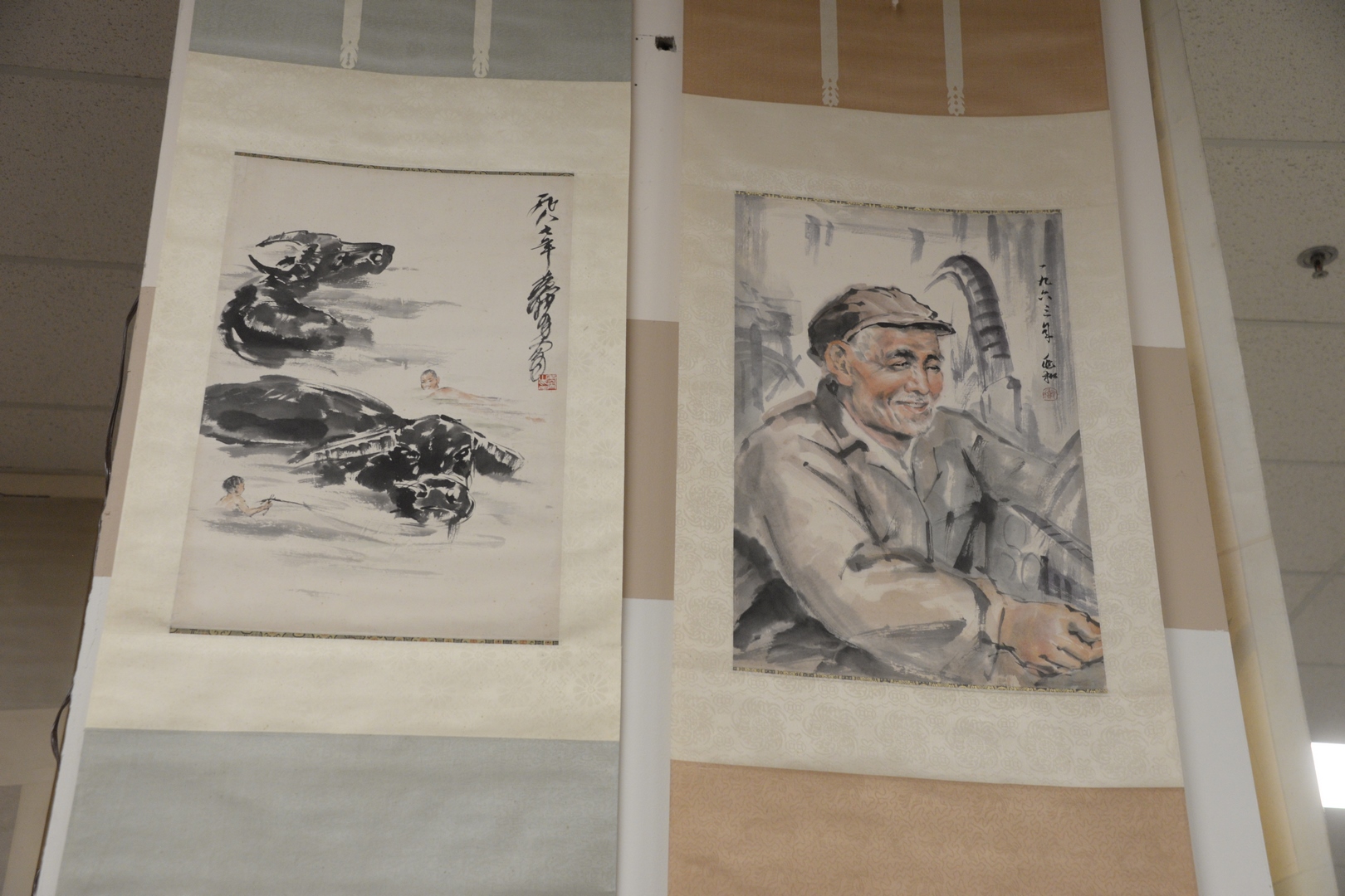 Five Oriental scroll watercolors crane 27 x 17, man 27 x 17, two boys swimming with water buffalo 27 x 17, grasshopper and dragonfly 40 x 12, and landscape 27 x 17.