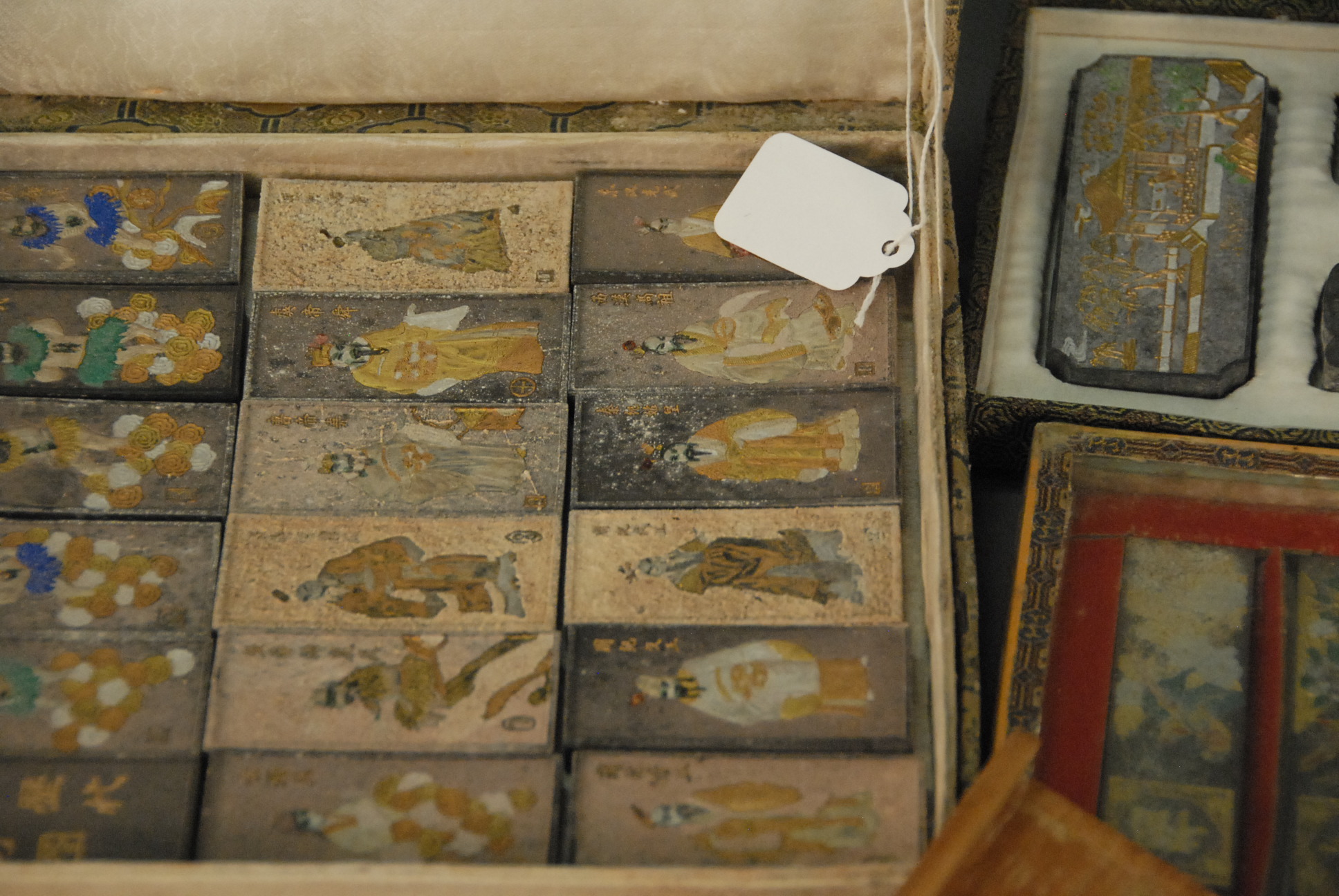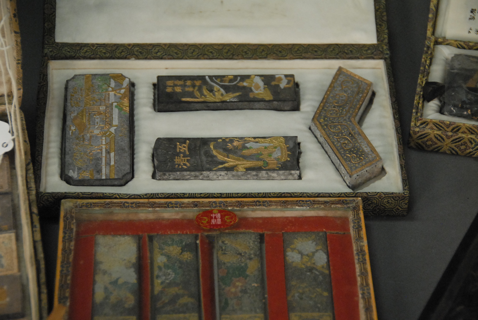 Lot 581: Group lot to include lark ink stone and cover decorated with carved dragon 4 x 8, several groups of writing articles including: small steatite chop of artist/owner seal, 3in. with brocade box two inks in brocade boxes and wooden artist box with b