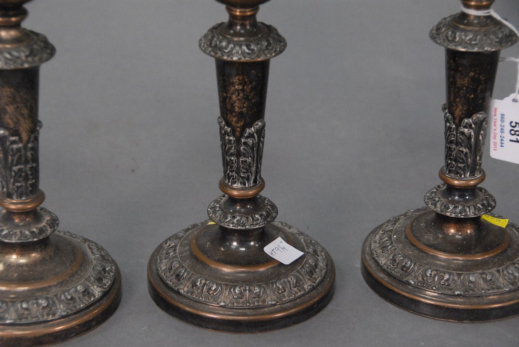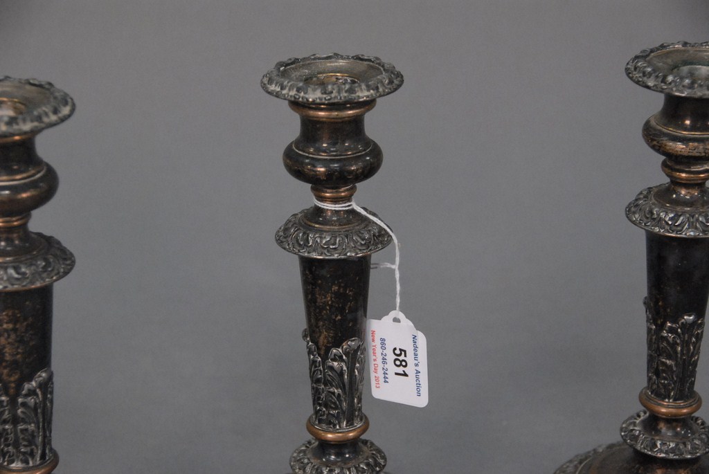Lot 581: Set of four Sheffield silverplated candlesticks with round bases. ht. 9 1/2in. Provenance: From prominent Woodbridge, Connecticu…