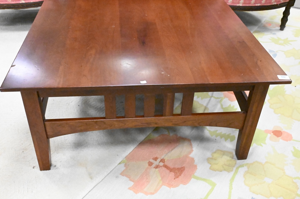 Ethan Allen Cherry Coffee Table, height 17 1/2 inches, top 37 1/2″ x 37 1/2″.