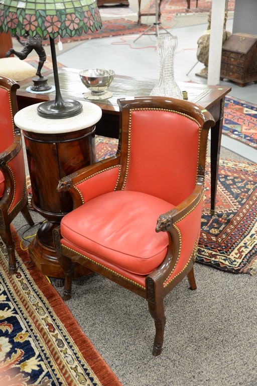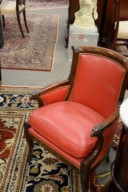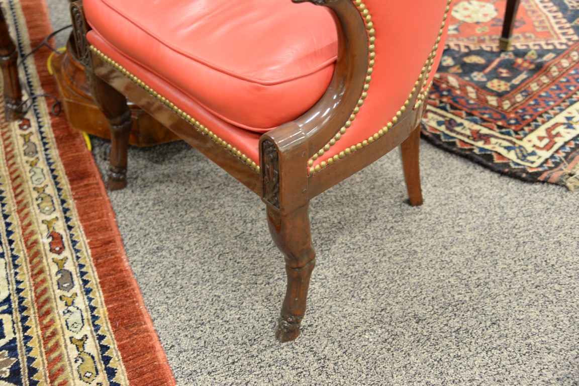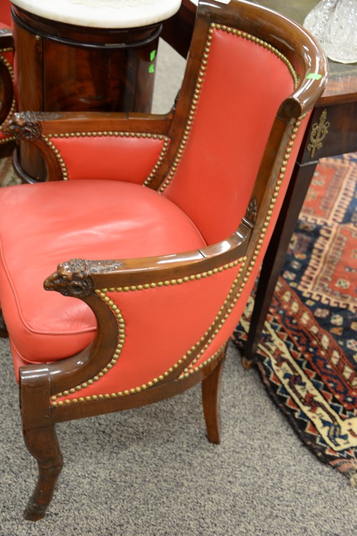 Pair of mahogany fauteuil, each with rounded backs and carved ram’s head hand supports set on animal legs with hoof feet, each fauteuil with soft red leather and brass tacks, signed Jacob on frame, probably 19th century. ht. 34in., wd. 22in.