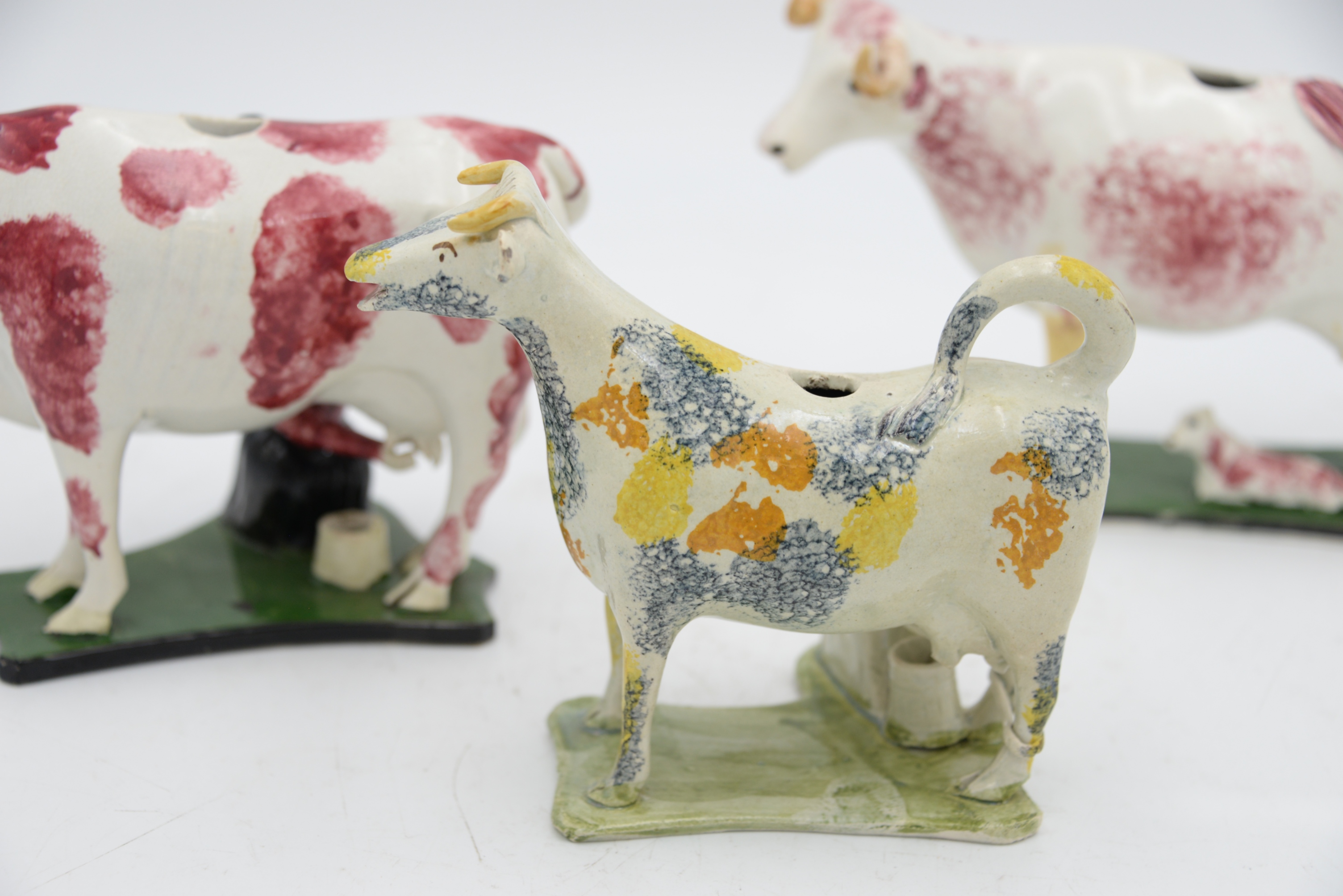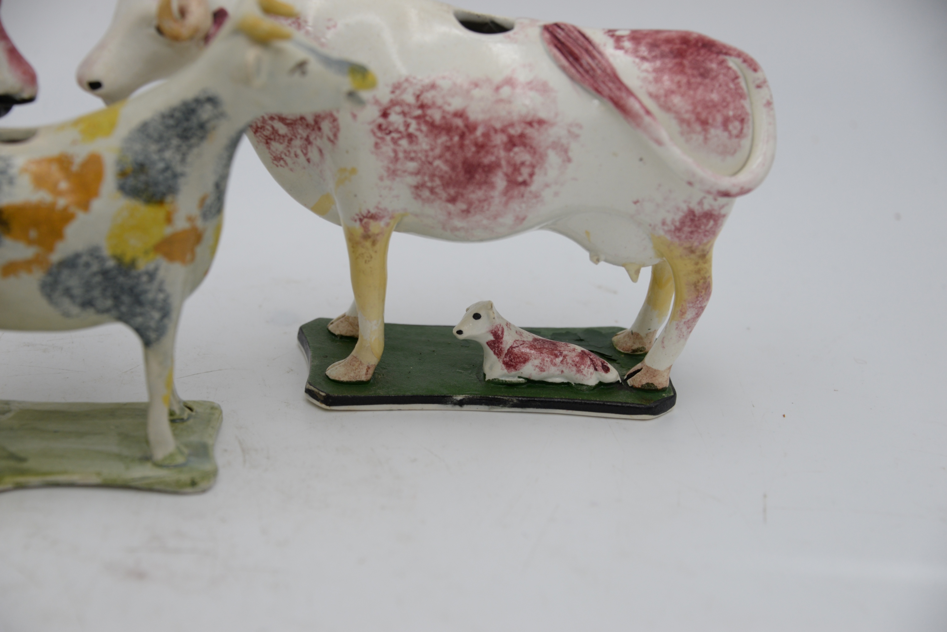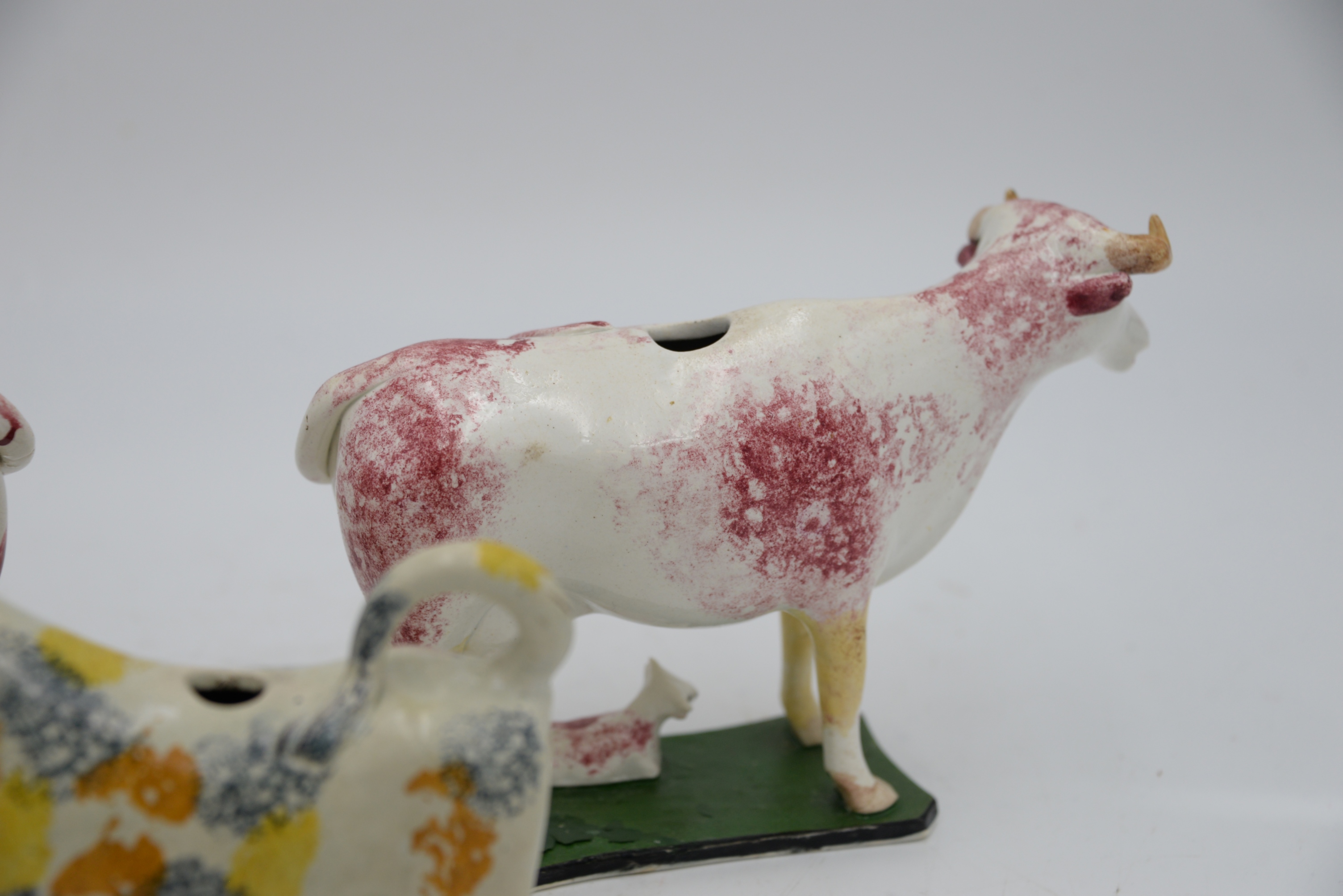 Three Piece Grouping of English Staffordshire Pearlware Cow Creamers, to include one maroon and white spotted cow and milkmaid (repairs on ears and horns), height 5 1/2 inches; one maroon and white spotted cow and calf (repairs on horns, legs and utter), height 5 1/4 inches; one blue, yellow and orange spotted cow with milkmaid (repairs on horns), height 5 1/4 inches.