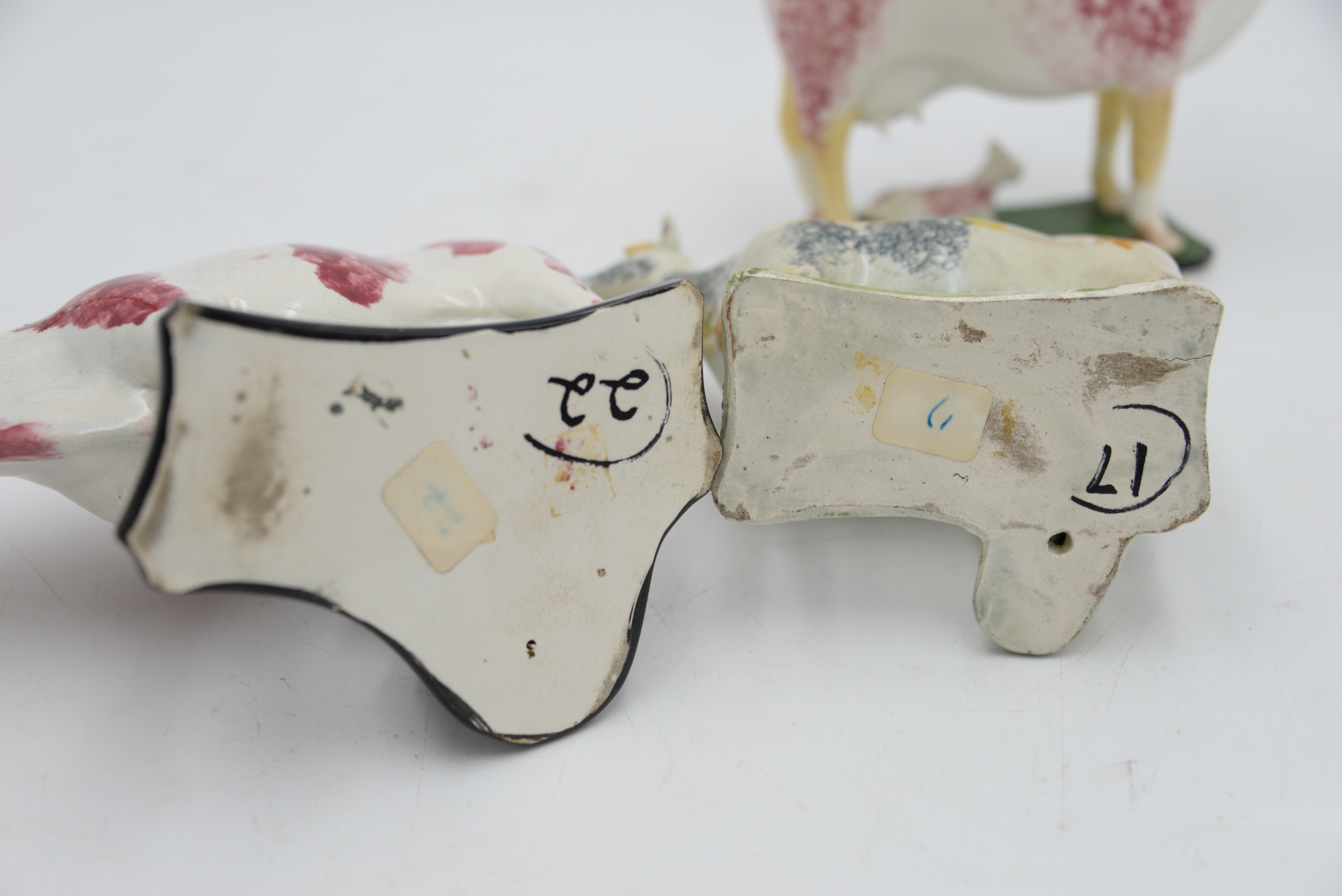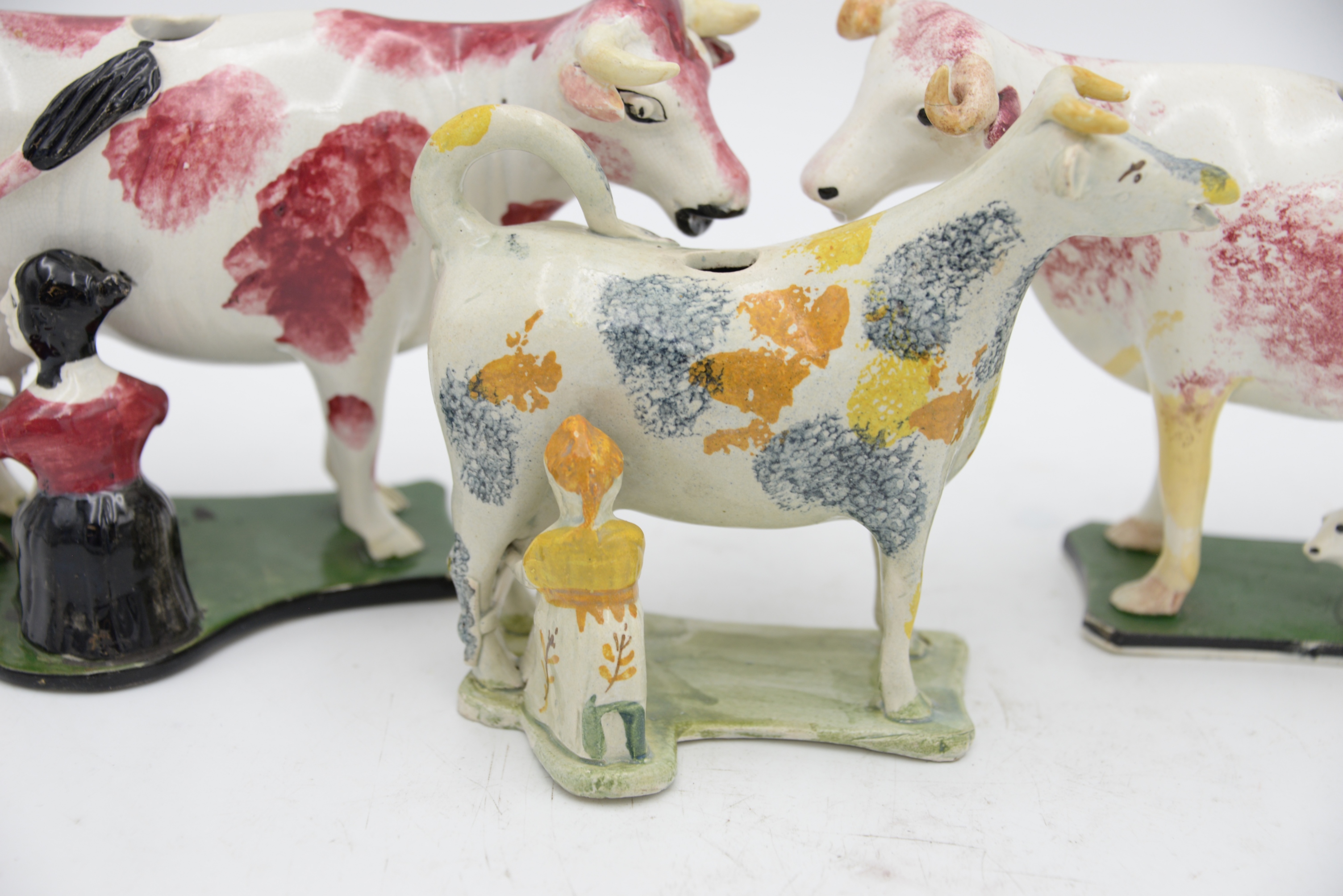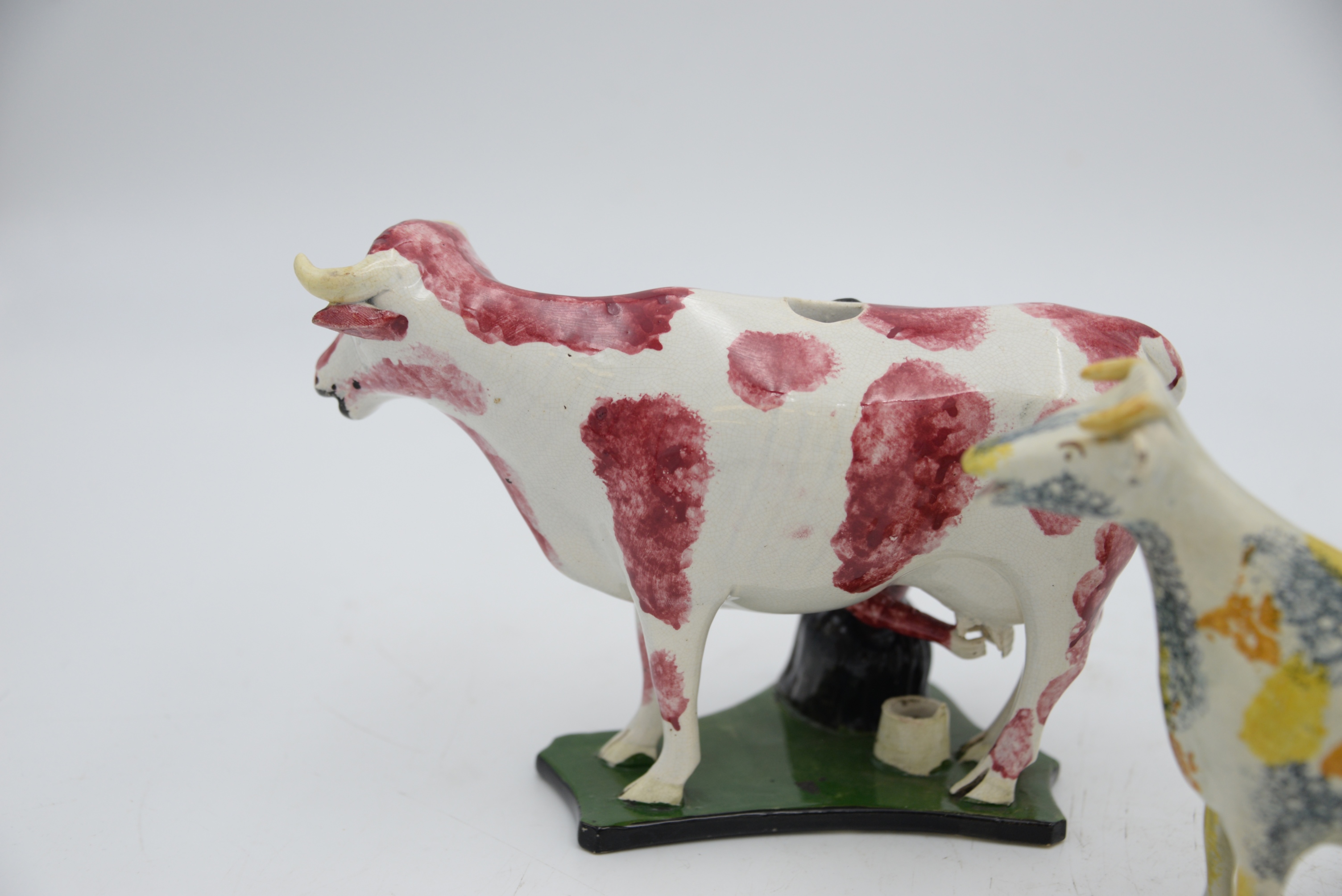 Three Piece Grouping of English Staffordshire Pearlware Cow Creamers, to include one maroon and white spotted cow and milkmaid (repairs on ears and horns), height 5 1/2 inches; one maroon and white spotted cow and calf (repairs on horns, legs and utter), height 5 1/4 inches; one blue, yellow and orange spotted cow with milkmaid (repairs on horns), height 5 1/4 inches.