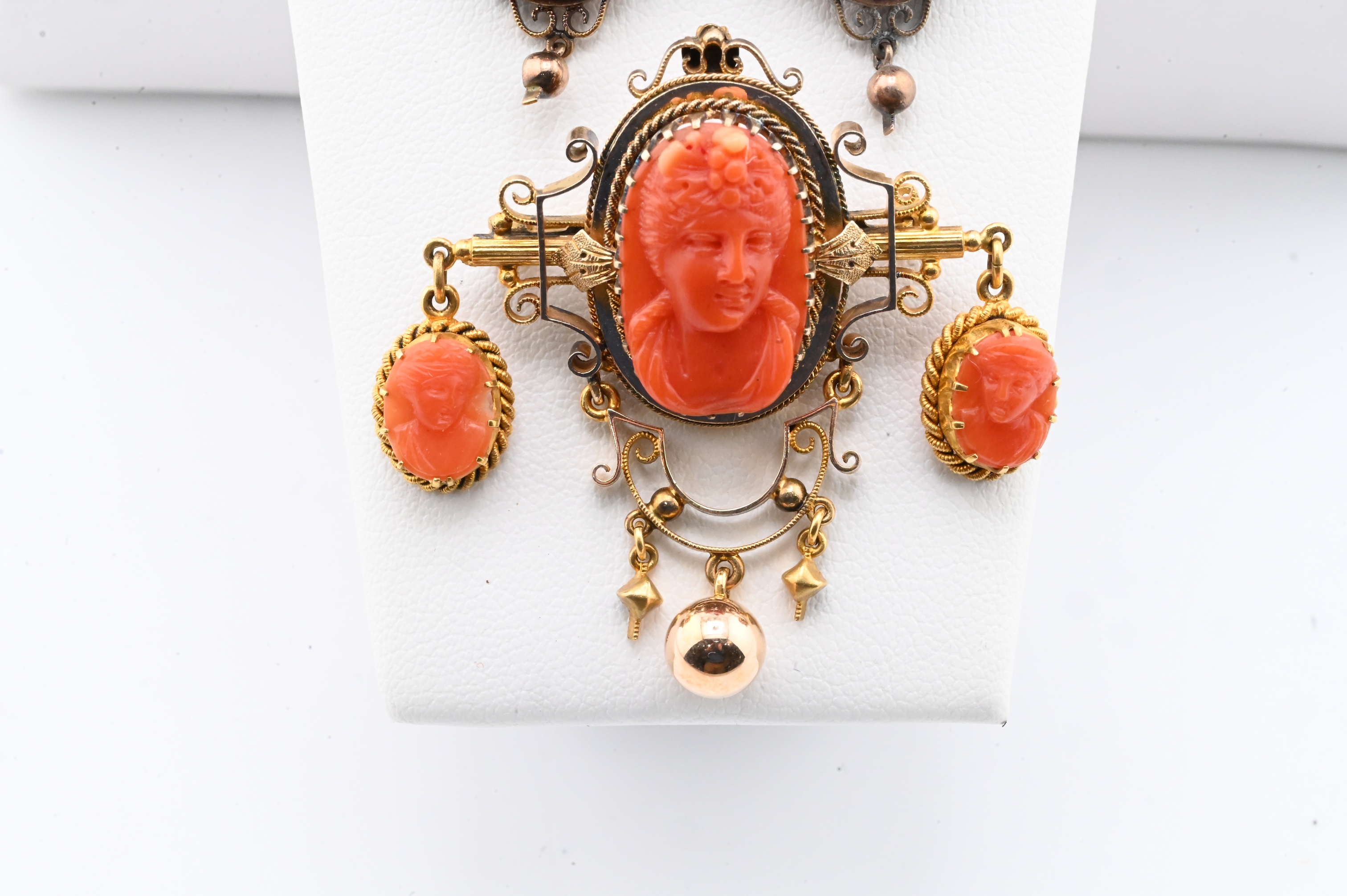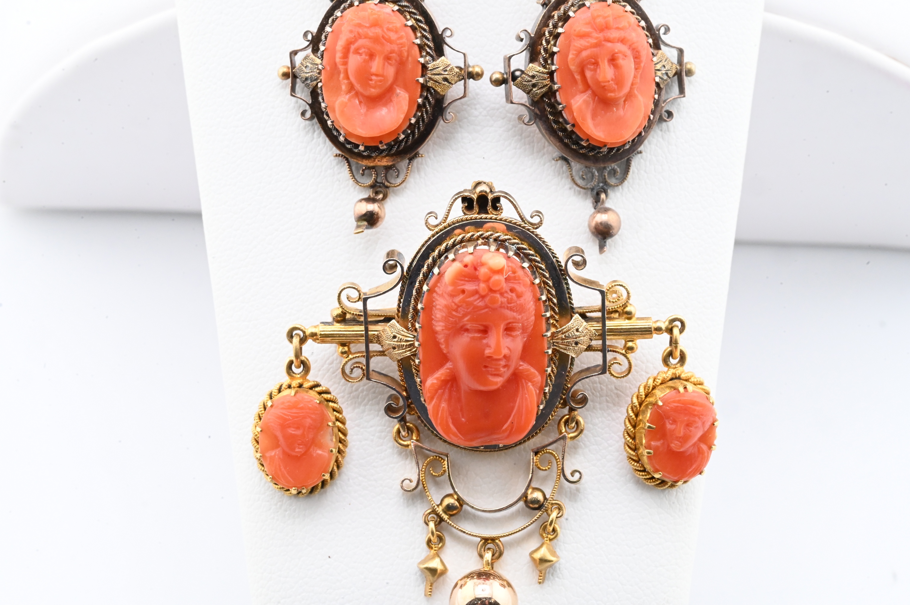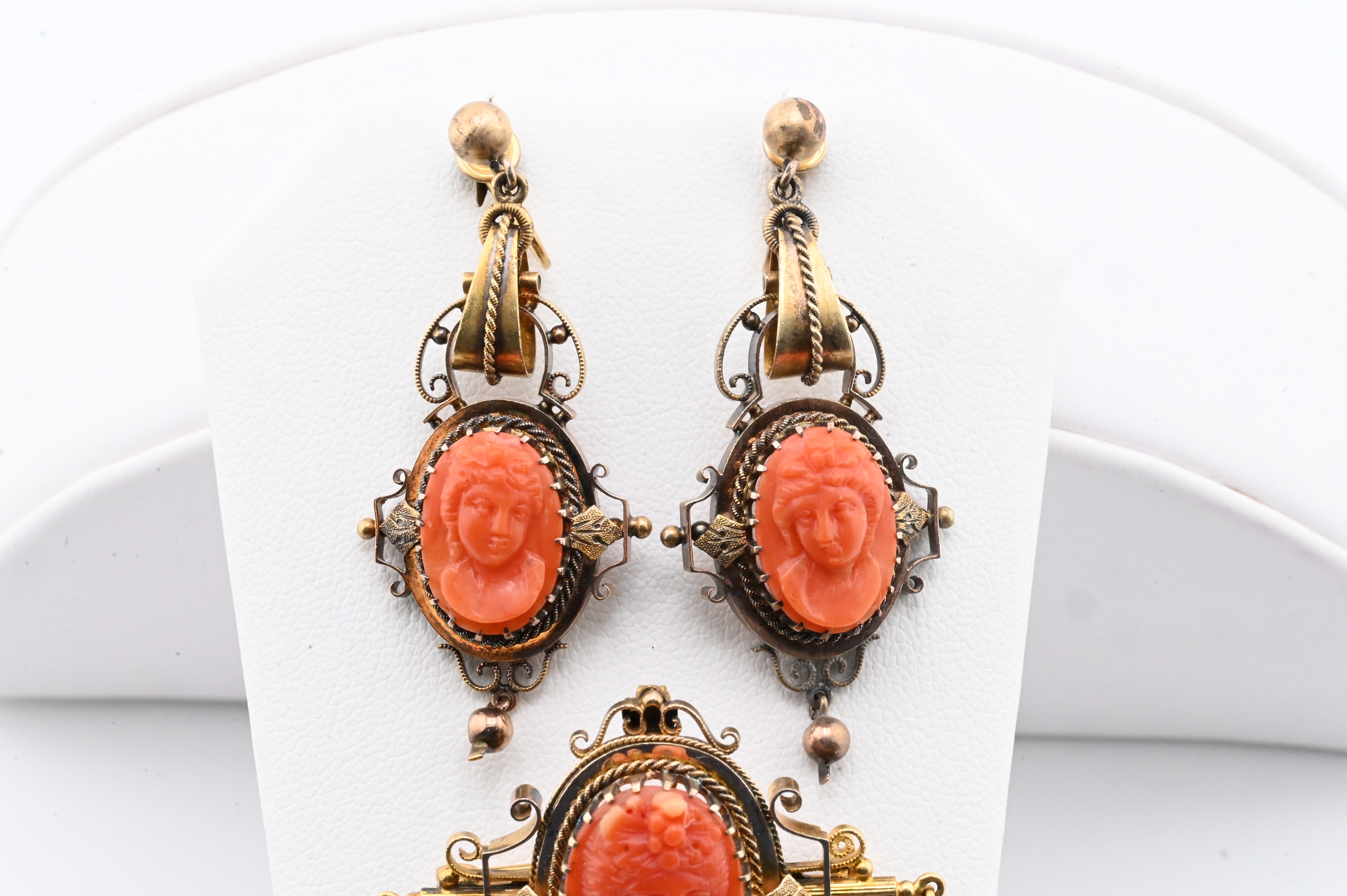 3 Piece Victorian 14K Gold and Coral Cameo Set