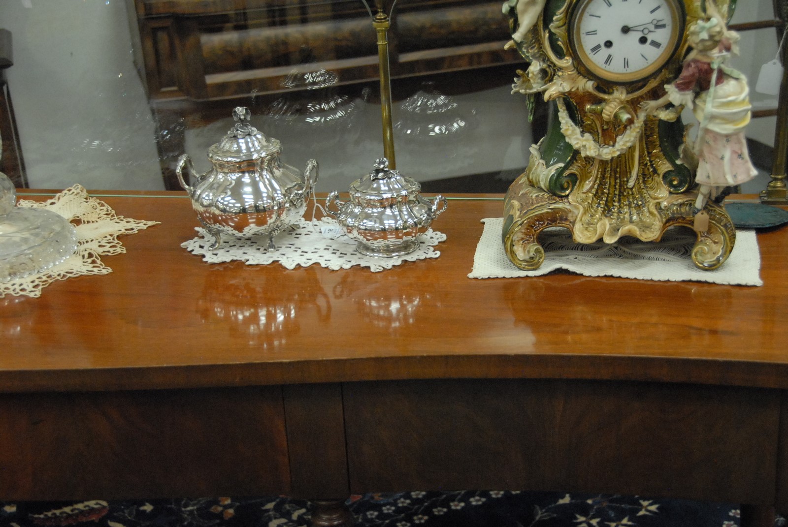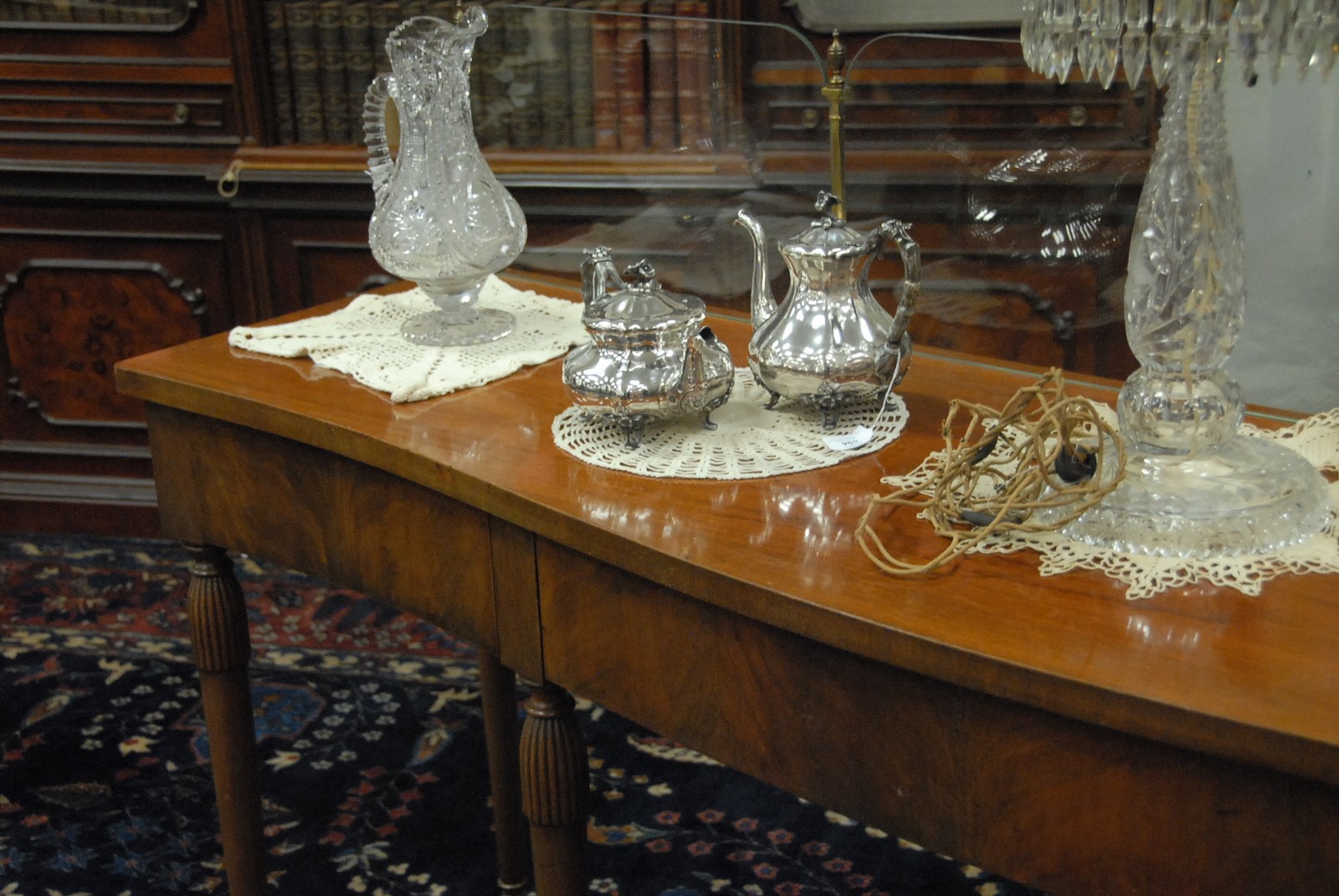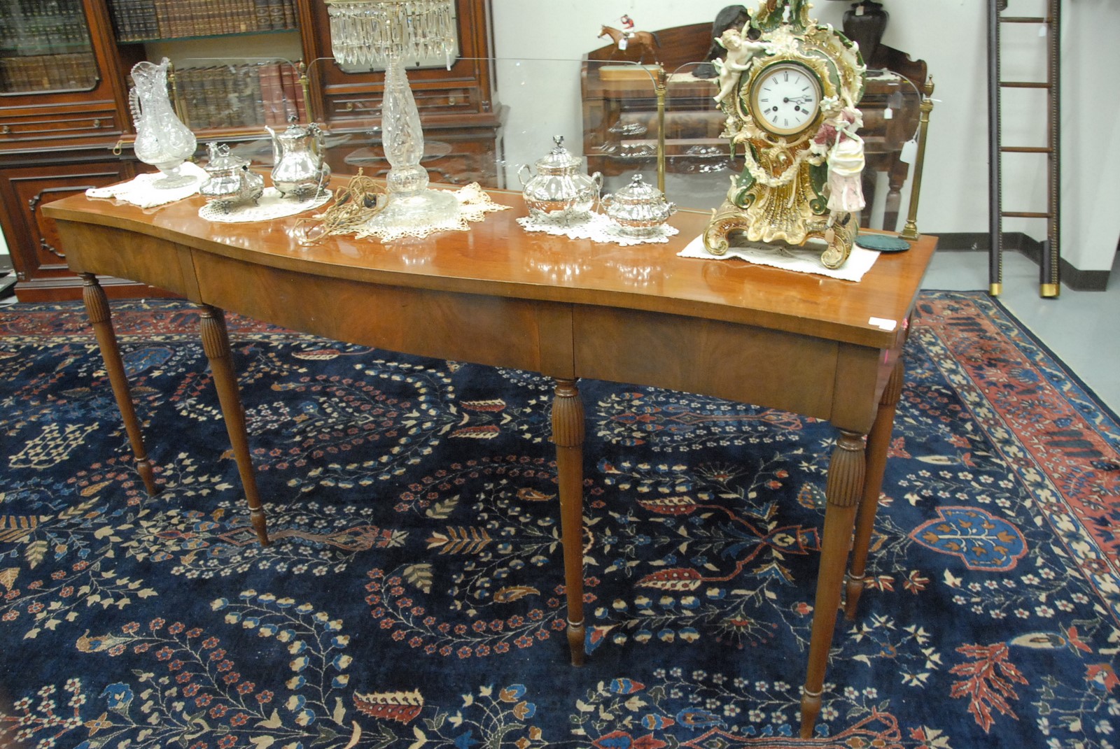 Lot 583: Custom mahogany sideboard having four brass posts with glass inserts. ht. 37 in., wd. 84 in., dp. 20in.
