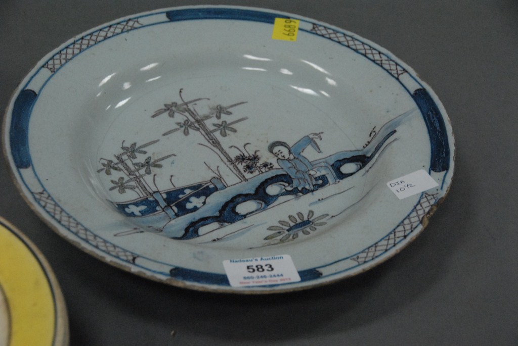 Group of twelve plates including four Creil-Montereau porcelain plates circa 1820’s depicting victories of Napoleon. dia. 8 1/4in., six faience creil plates with yellow borders with different transfer printed lyrics of children’s songs, and two early English or Dutch plates. Provenance: From prominent Woodbridge, Connecticut family collection.