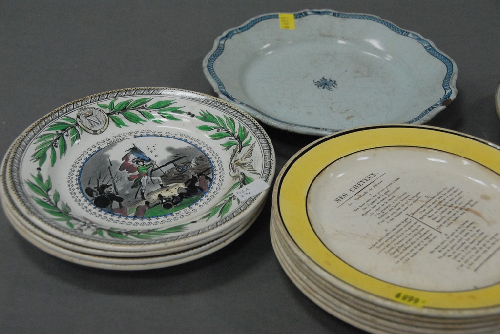Lot 583: Group of twelve plates including four Creil-Montereau porcelain plates circa 1820s depicting victories of Napoleon. dia. 8 1/4in.,….