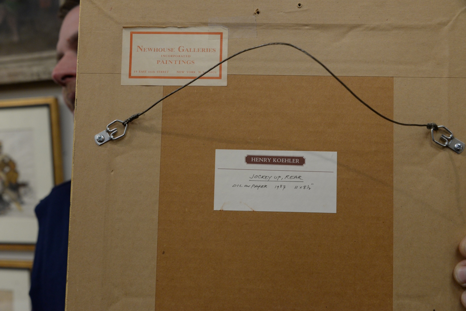 Henry Hoehler American, 1927 – 2018 Jockey Up, Rear, 1987 oil on paper, mixed media signed, titled and dated Henry Koehler lower right on artist’s label adhered to verso sight size: 10 1/2 x 7 1/2 Provenance: Newhouse Galleries, New York: The Estate of Gloria Schiff, 630 Park Avenue, New York