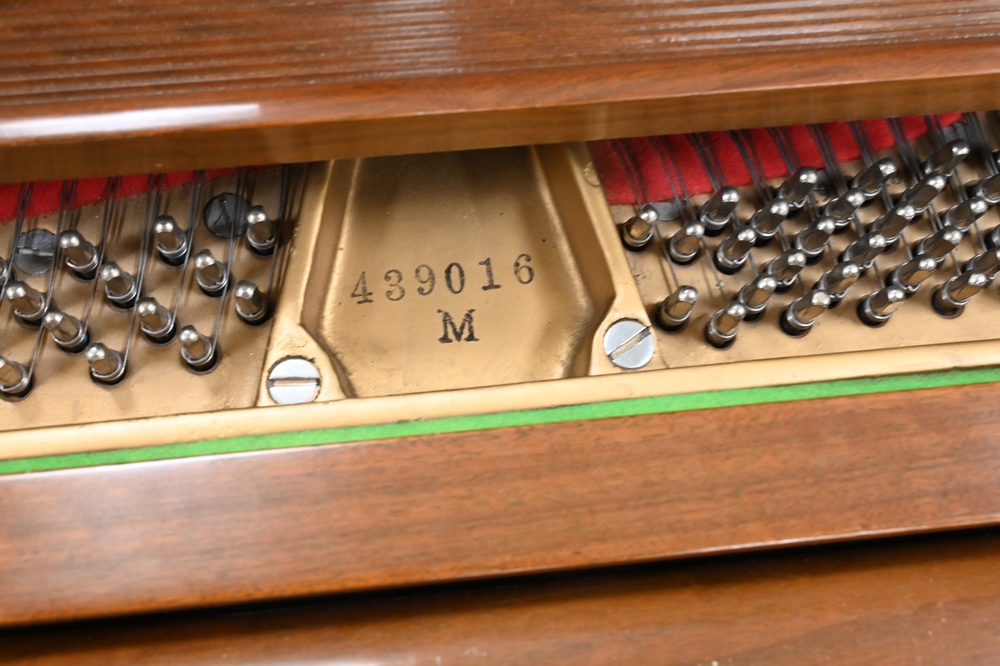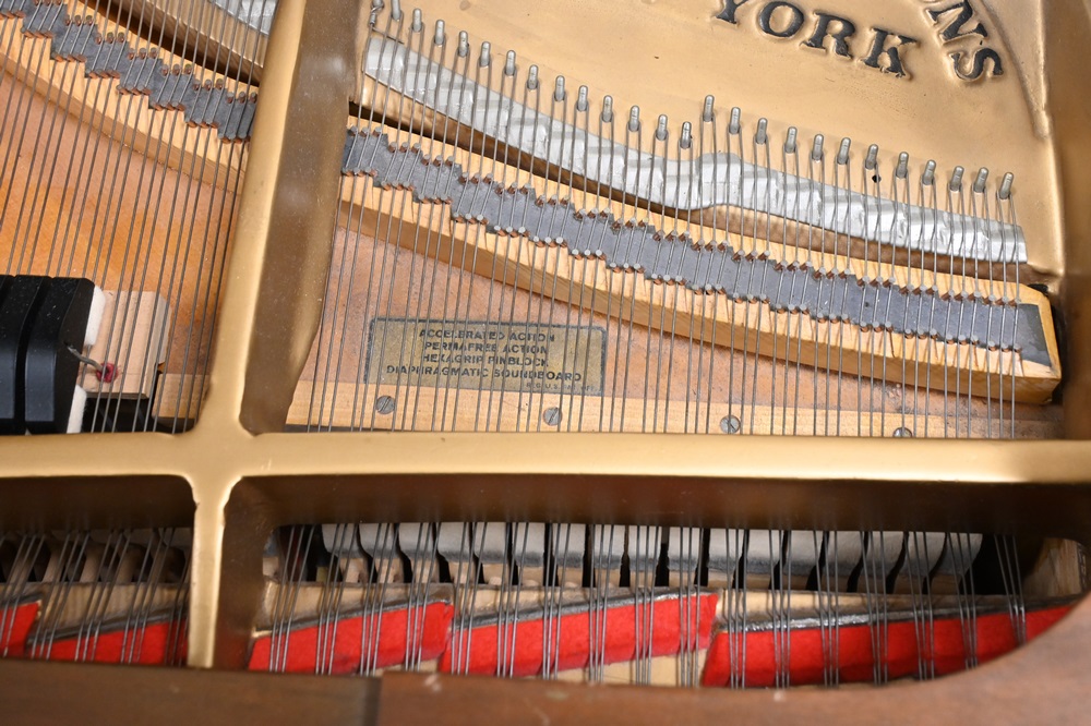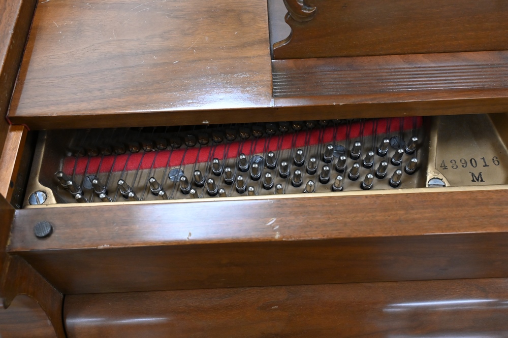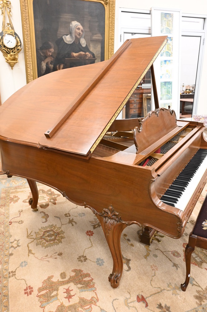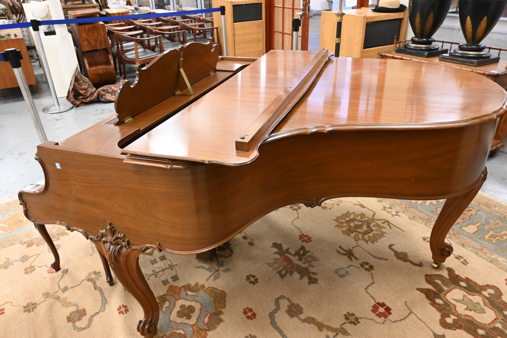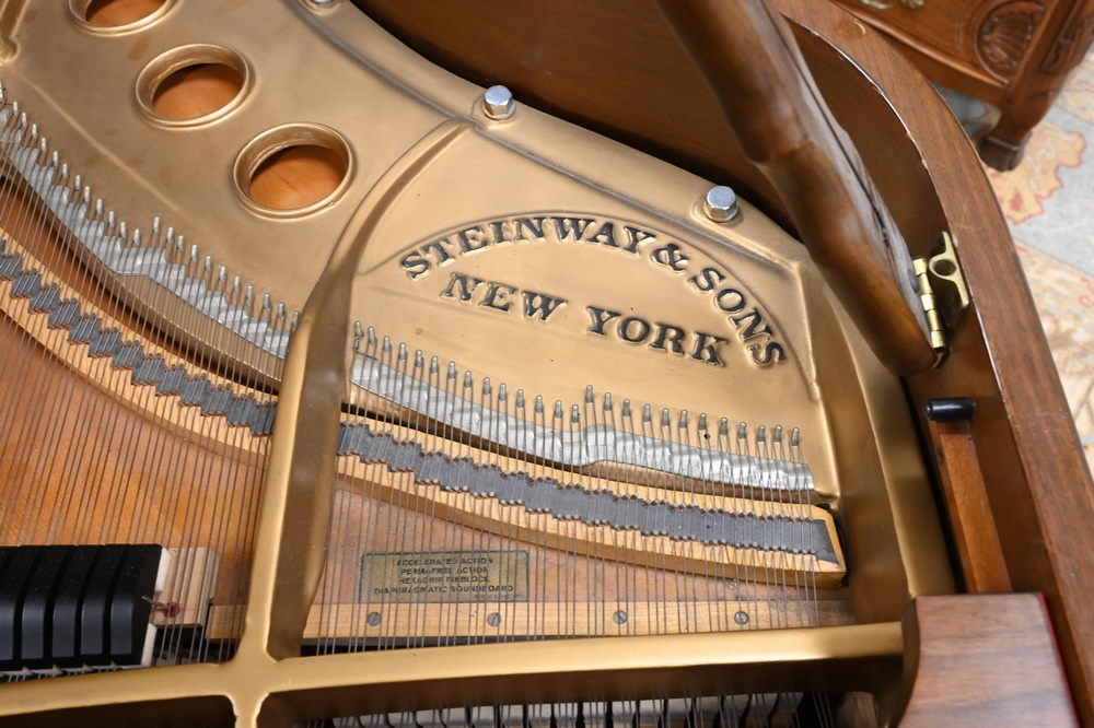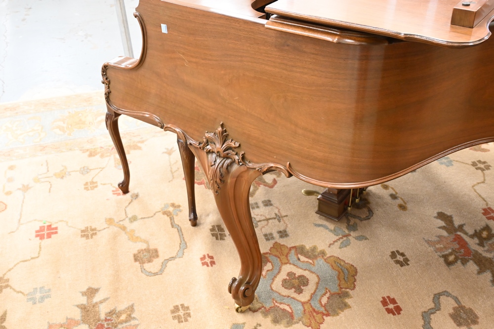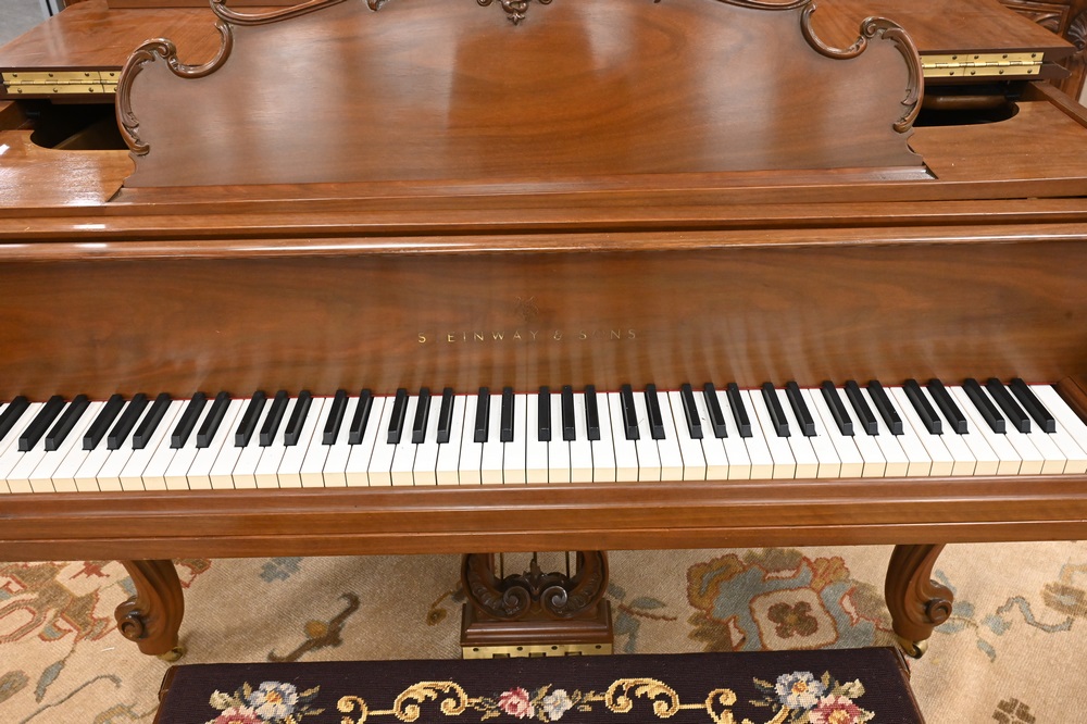 Lot 584: Steinway Walnut Baby Grand Piano, set on carved cabriole legs, along with needlepoint top bench, model #439016, length 66 inches.