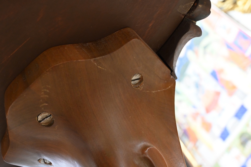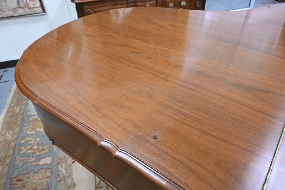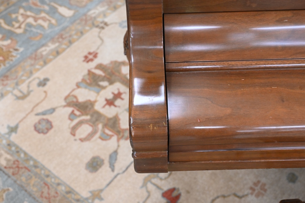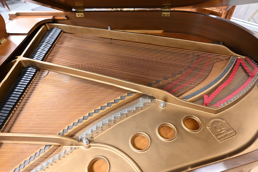 Steinway Walnut Baby Grand Piano, set on carved cabriole legs, along with needlepoint top bench, model #439016, length 66 inches.