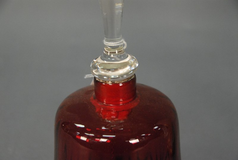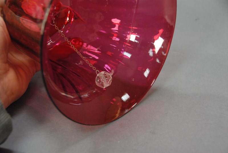 Cranberry glass bell with clear handle. ht. 12 1/2in.
