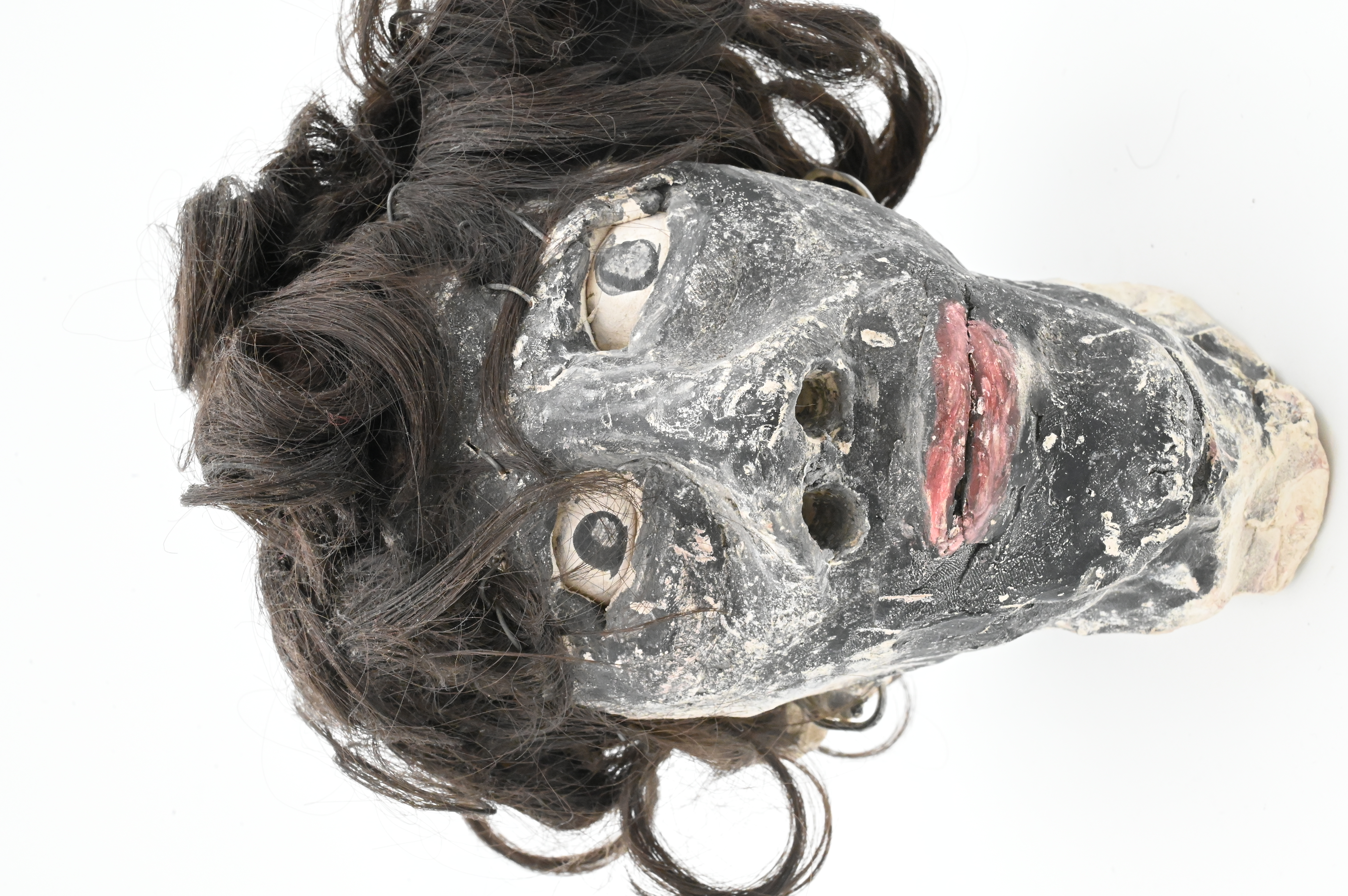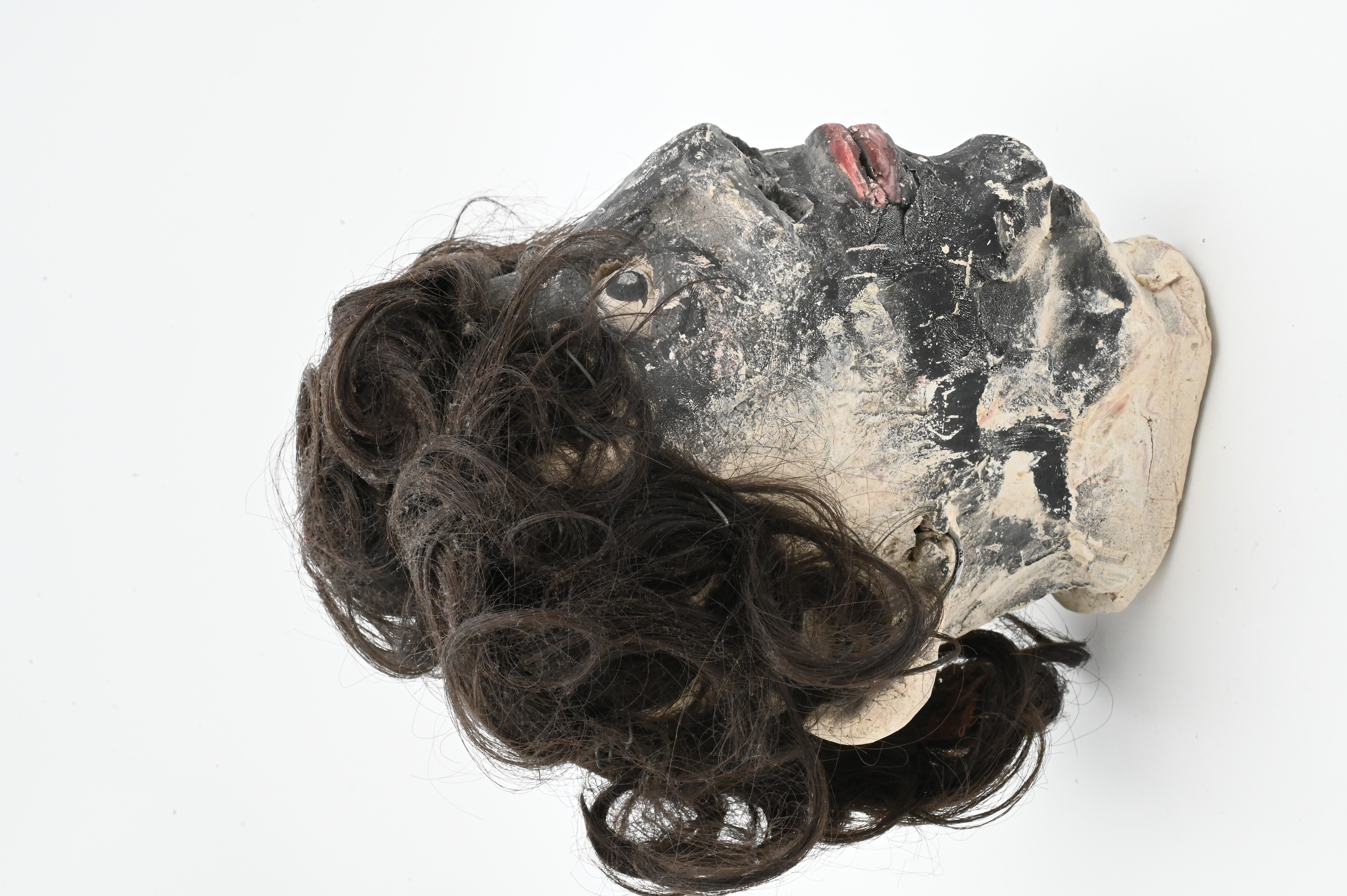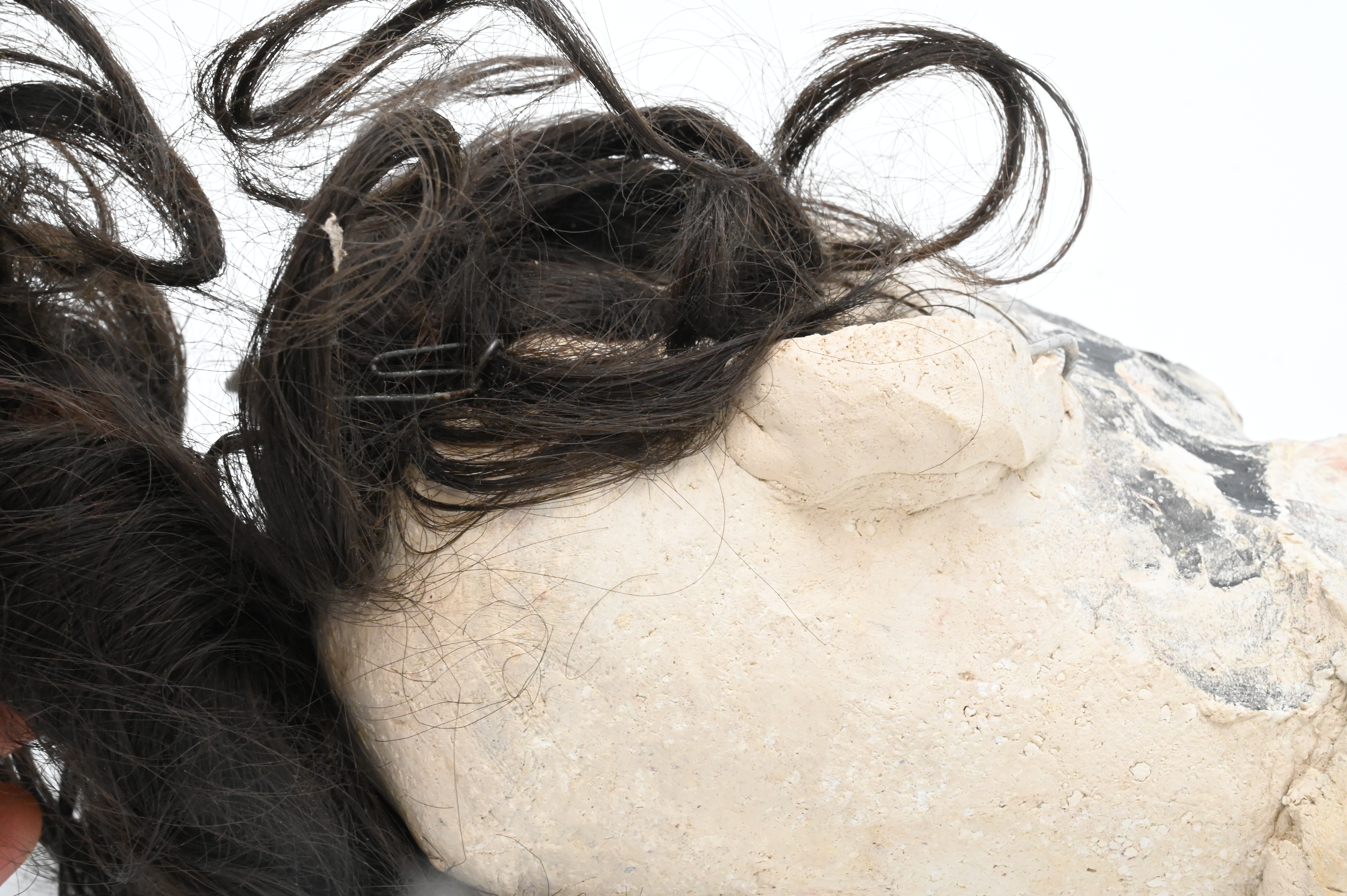 woman’s head with wig, having can opener earrings; paint, clay, wire and hair sculpture