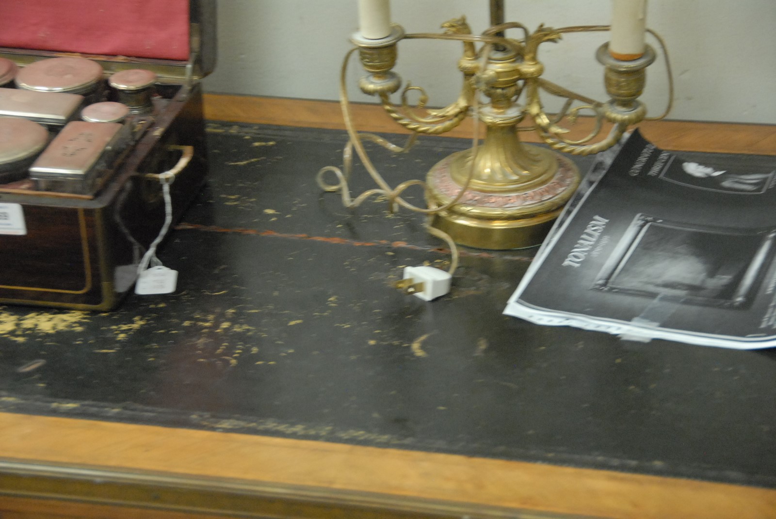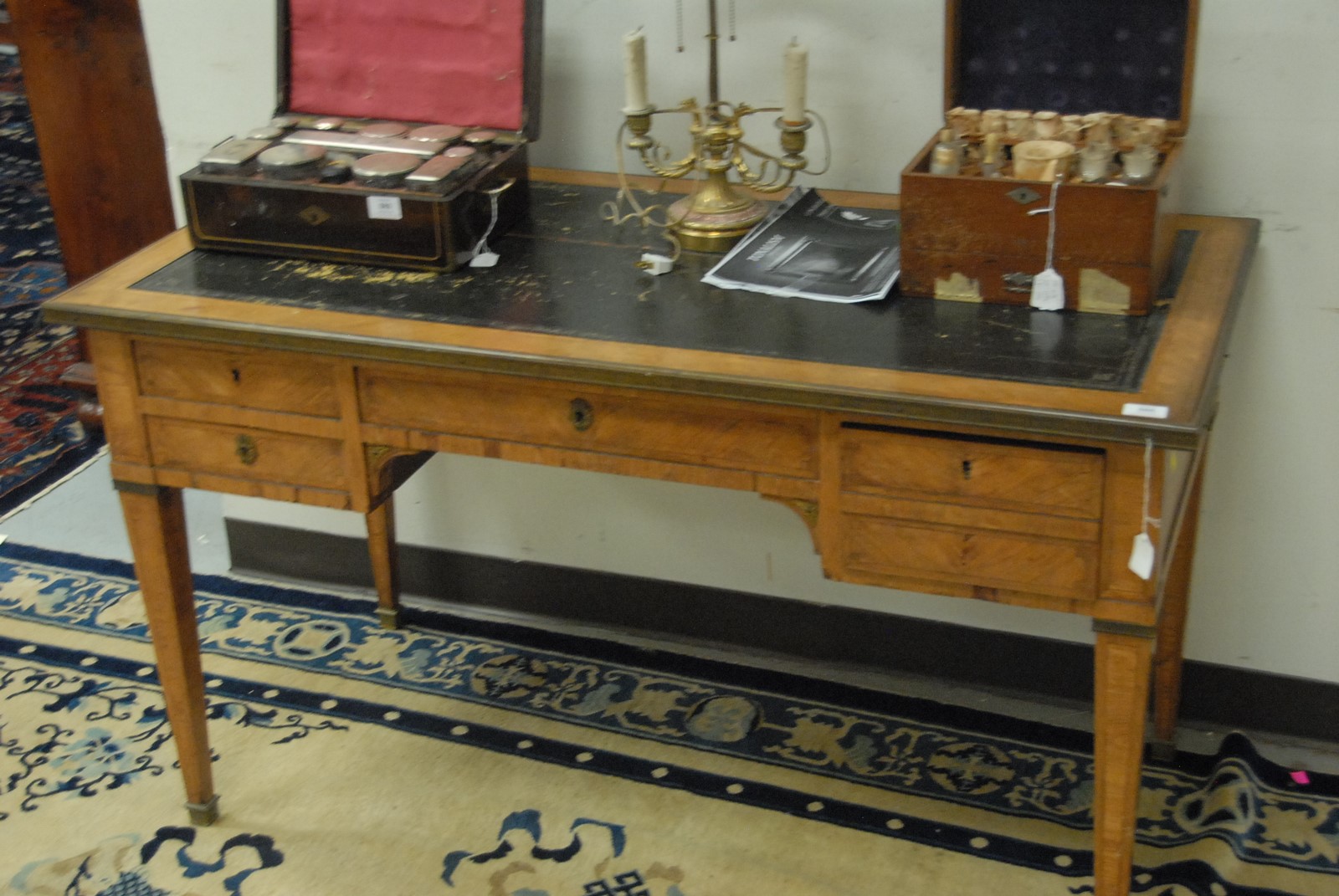 Lot 585: Louis XVI style writing desk with leather top over center drawer flanked by two drawer, 19th century crack in leather veneer chips. ht. 29 in. wd. 47 1/2 in. dp. 24 3/4 in.