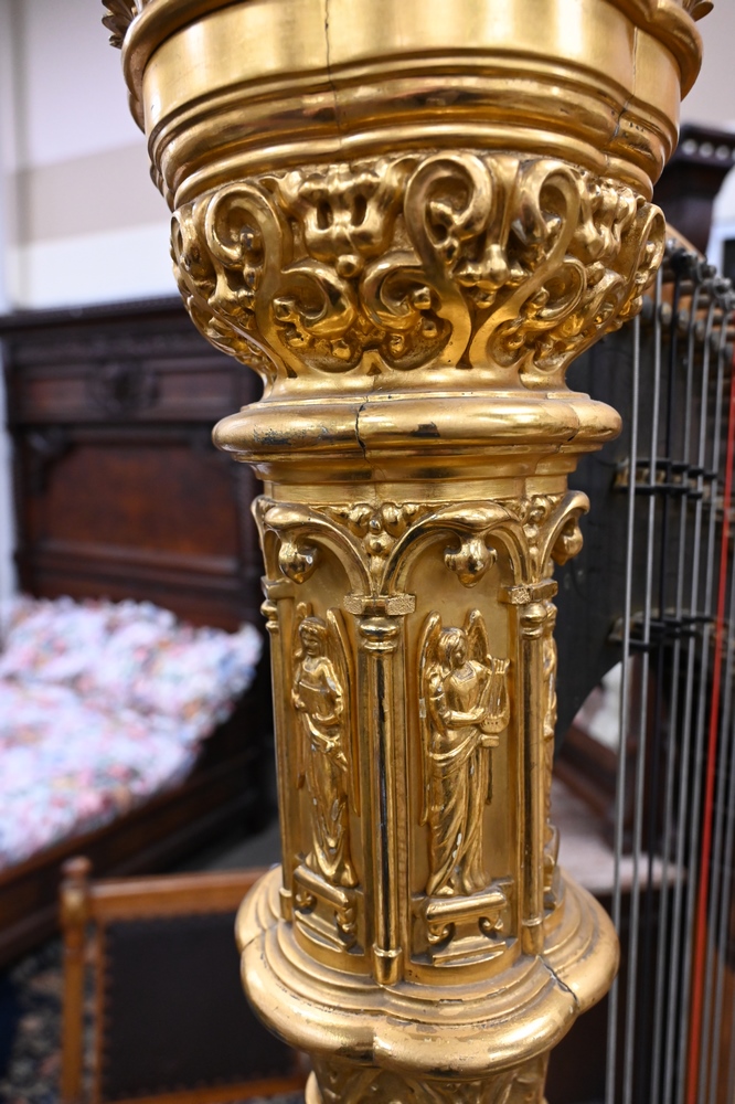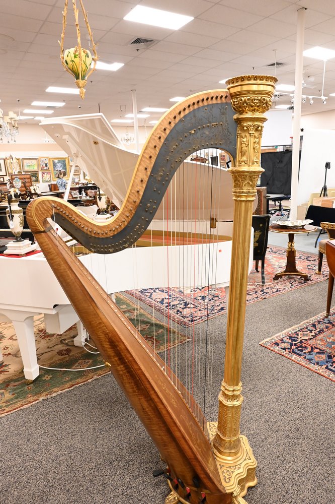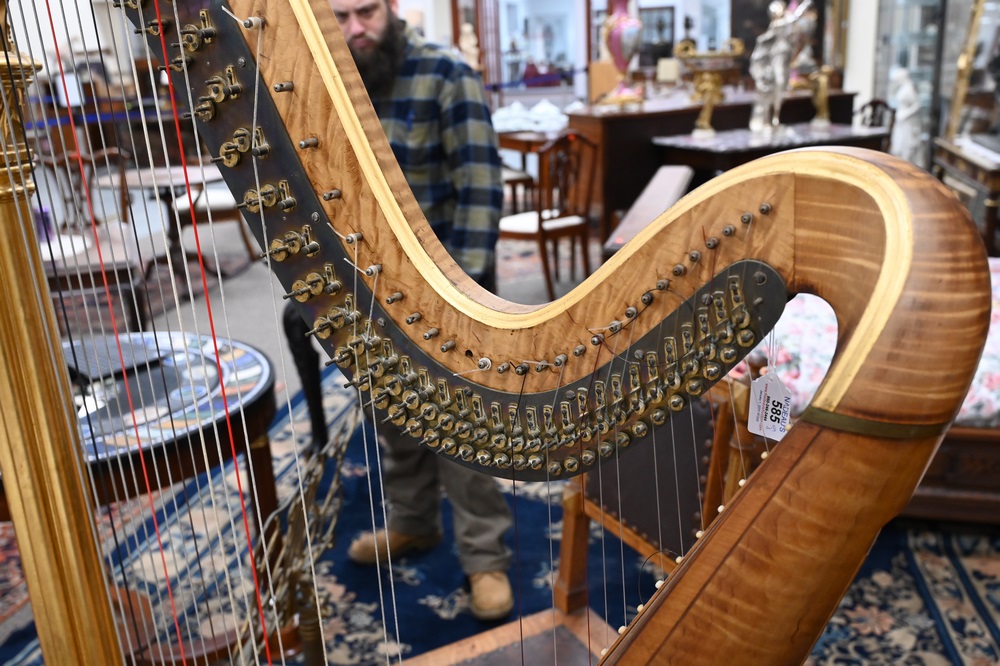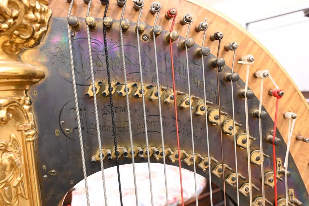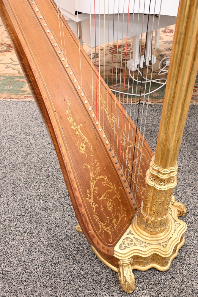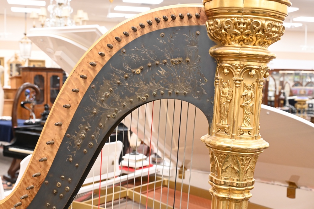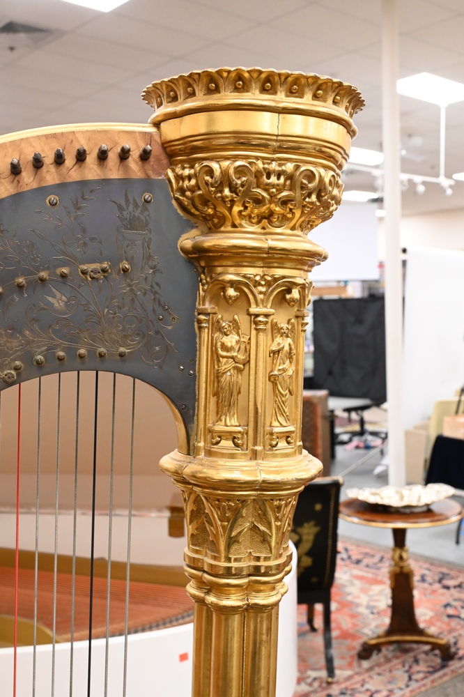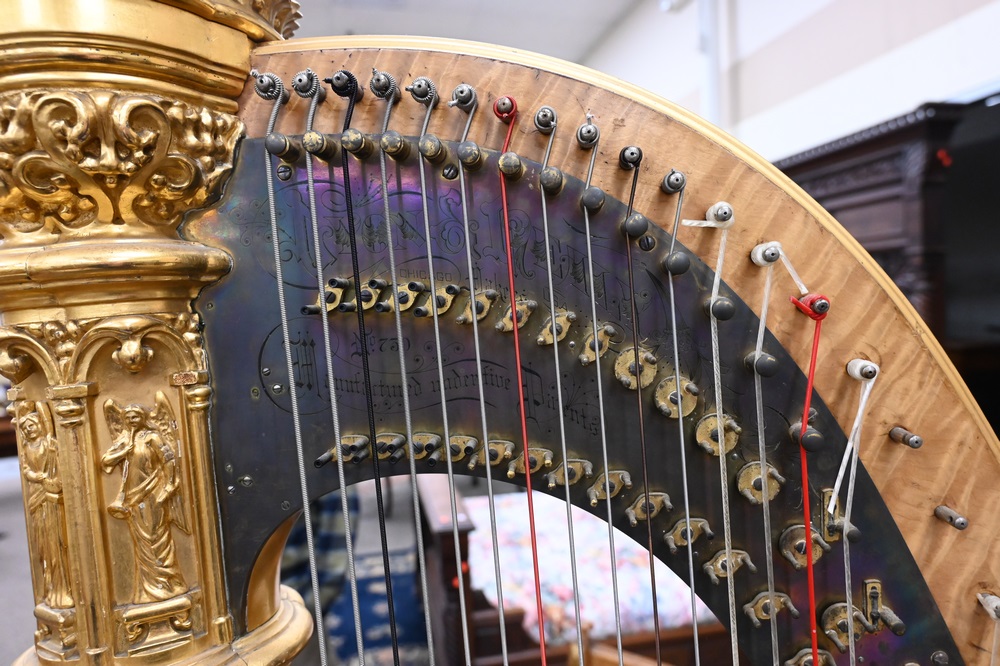 Lot 585: Lyon & Healy, #730, figured maple and gilt decorated harp, post having carved and gilt decorated winged figures, with custom cover,…