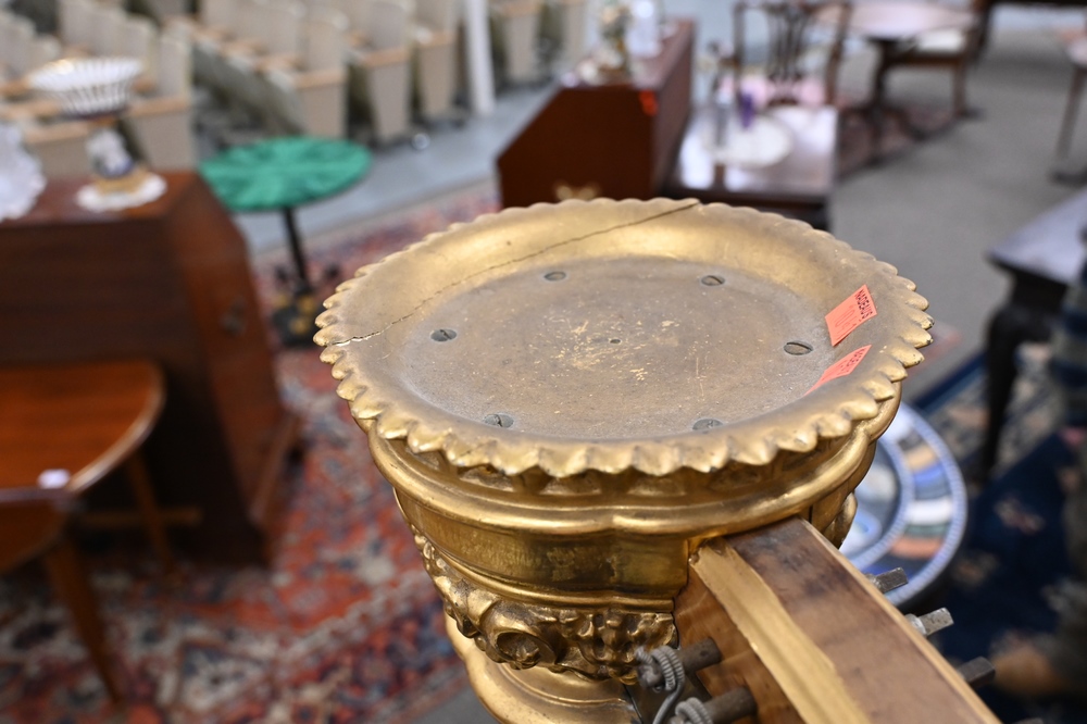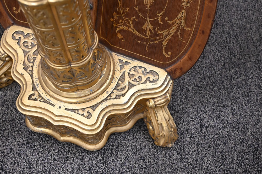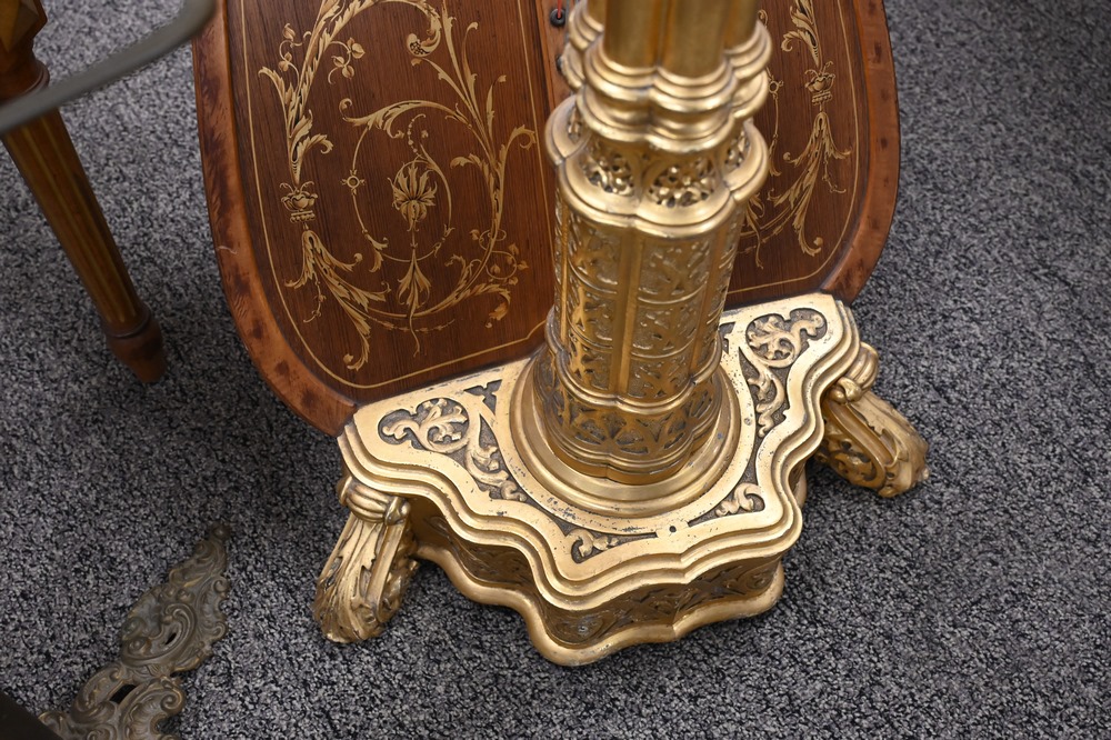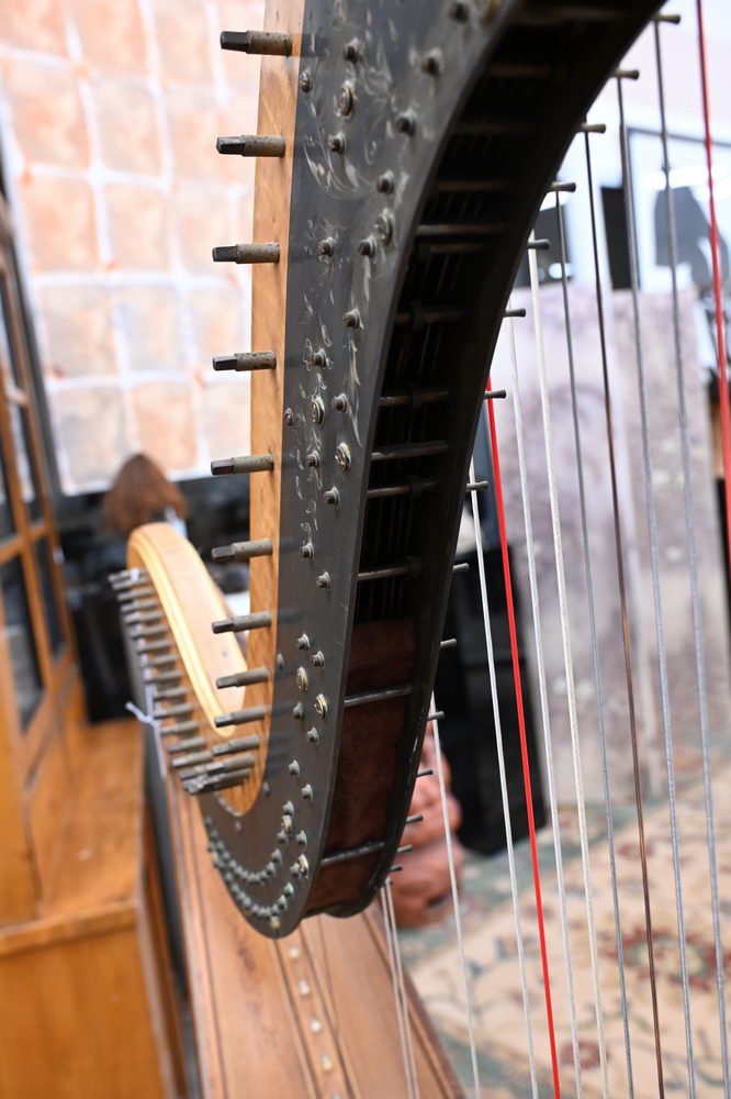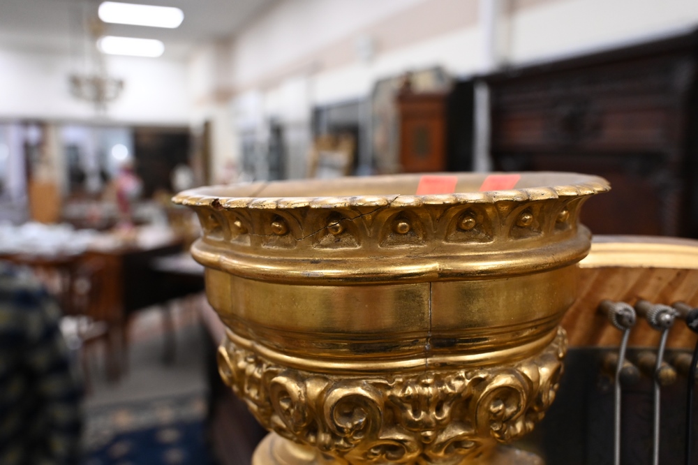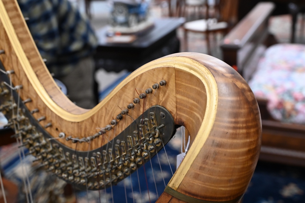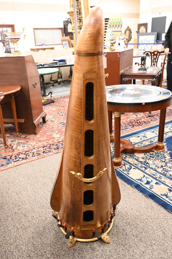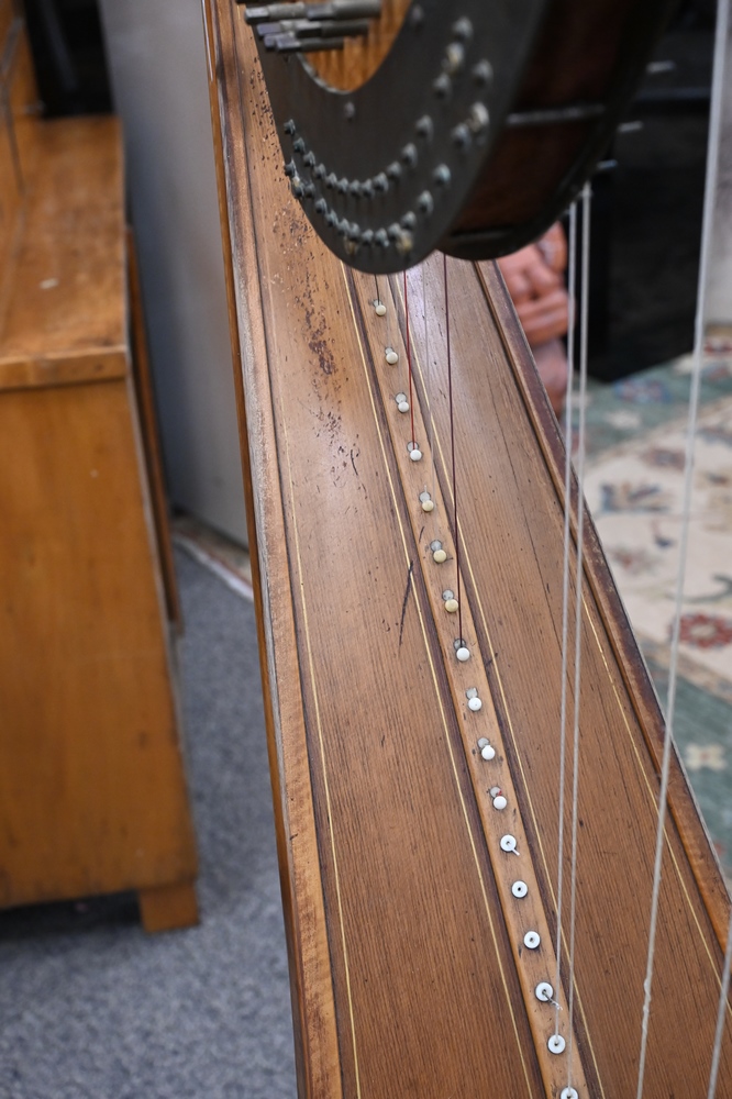 Lot 585: Lyon & Healy, #730, figured maple and gilt decorated harp, post having carved and gilt decorated winged figures, with custom cover,…