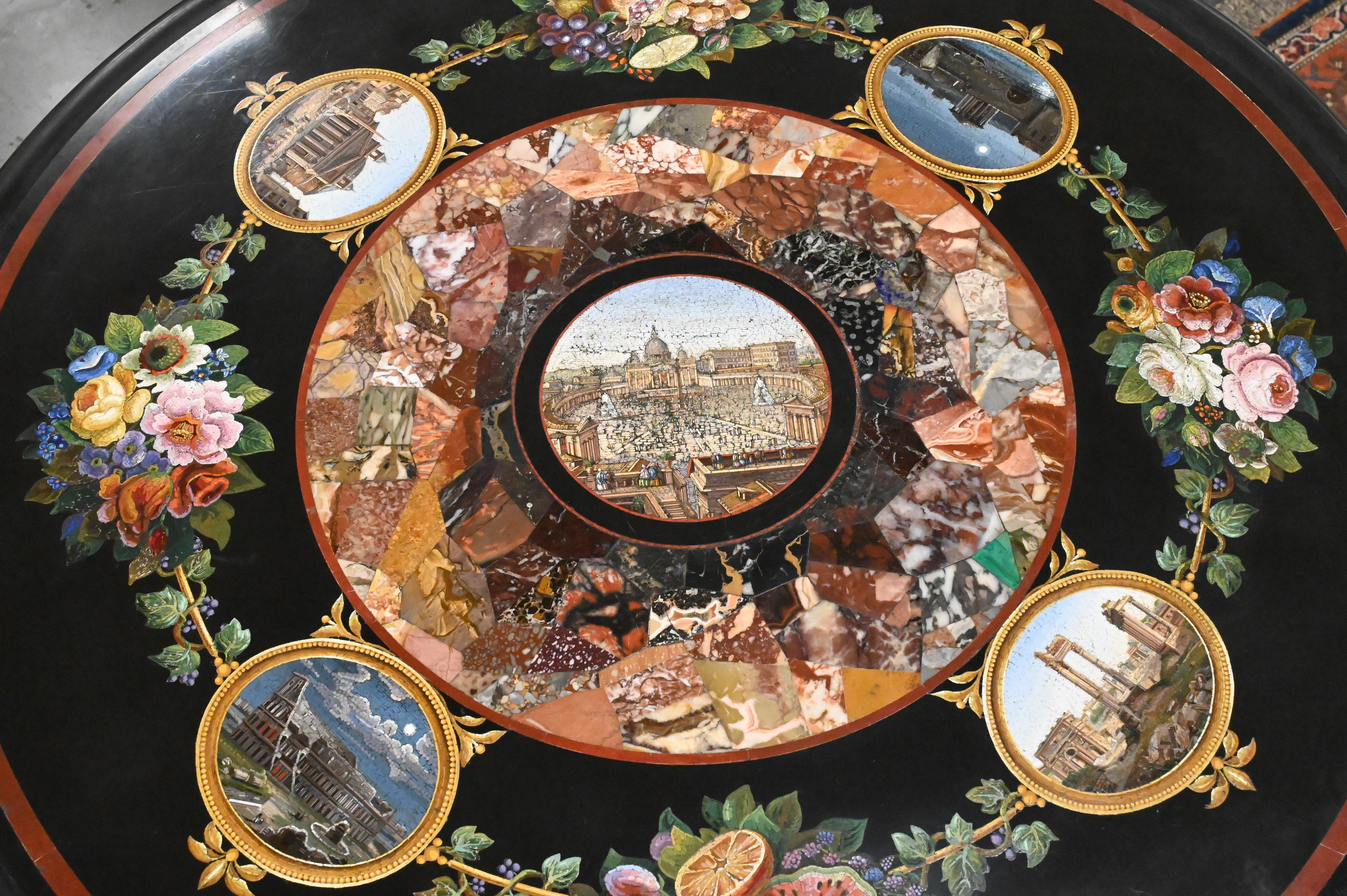 having Roman scenes including the Vatican and the Coliseum, on carved and giltwood base mounted with three putti, having glass top