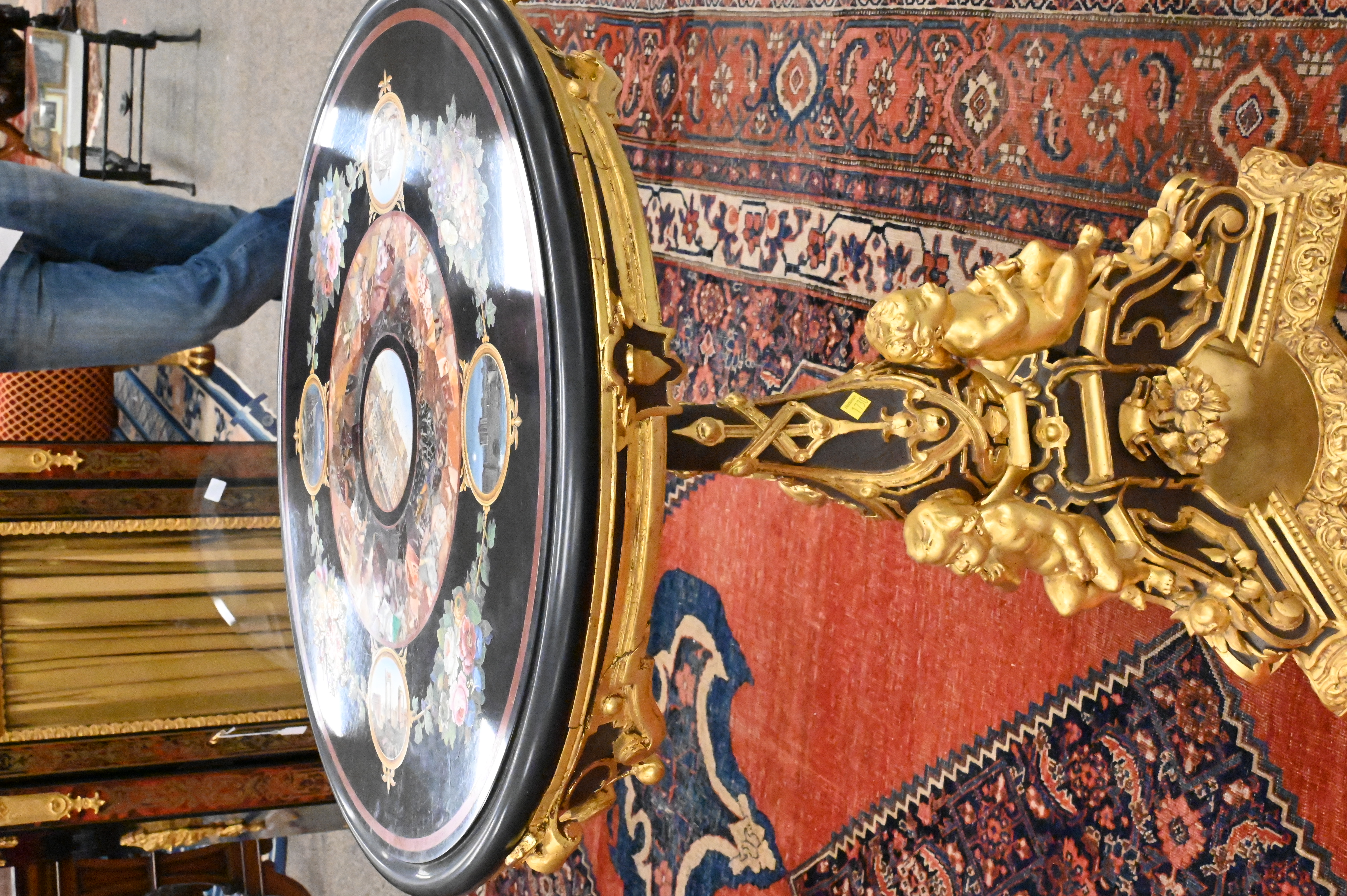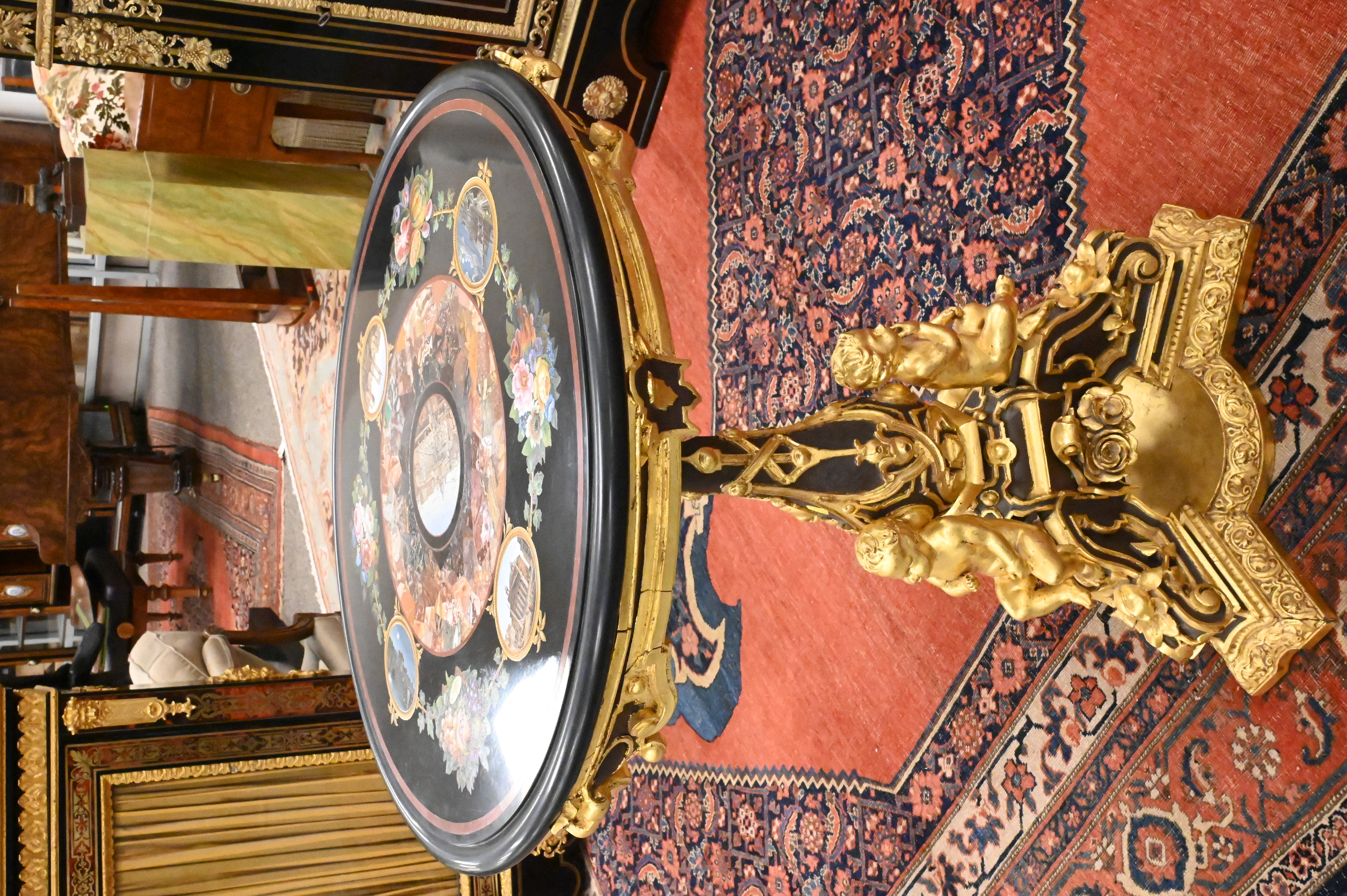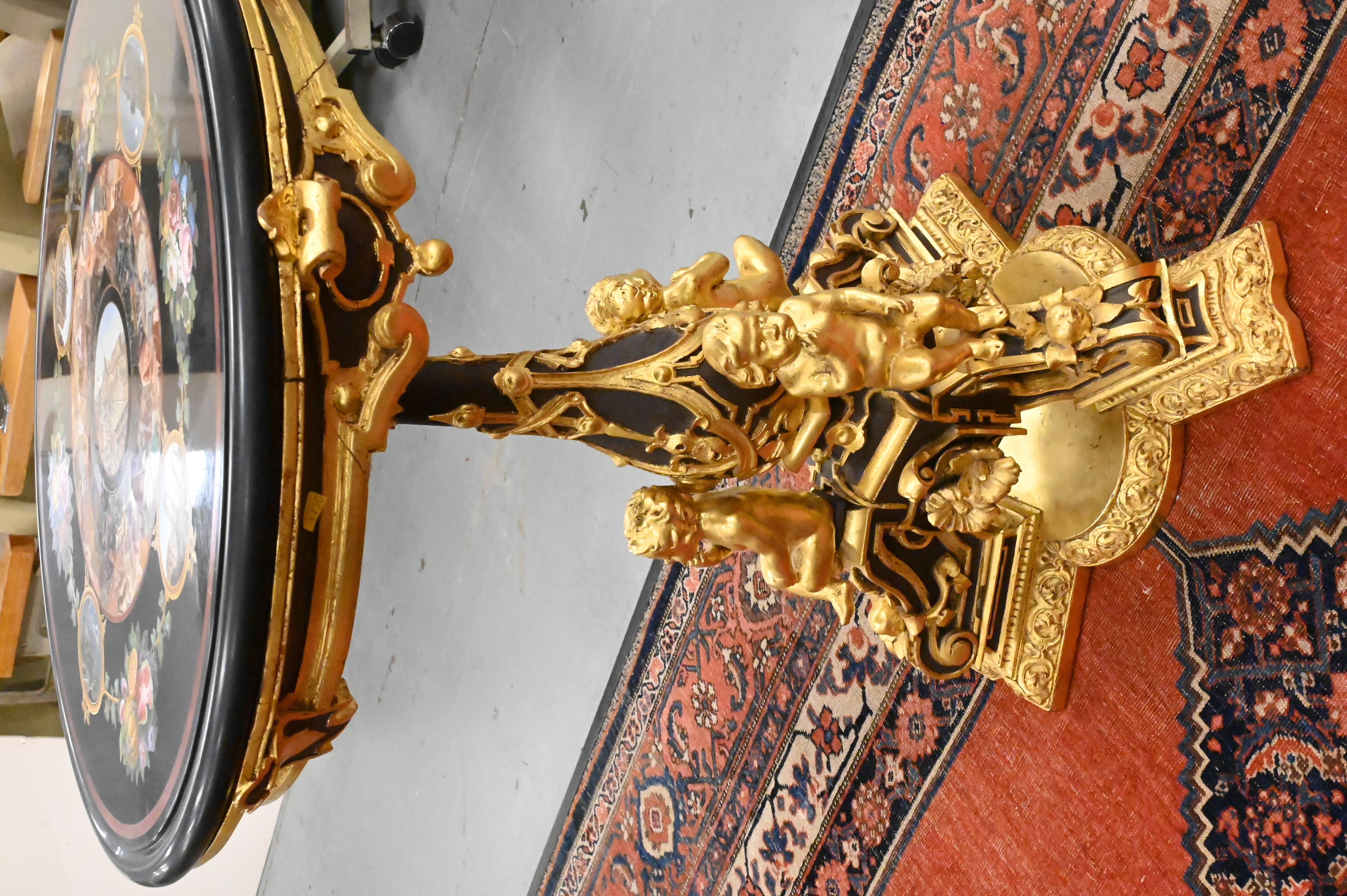 Condition: presents well, light scratching to mosaic surface, cracks to skirt, one putti repaired at seat with a 1/2 inch of wood missing from seat
