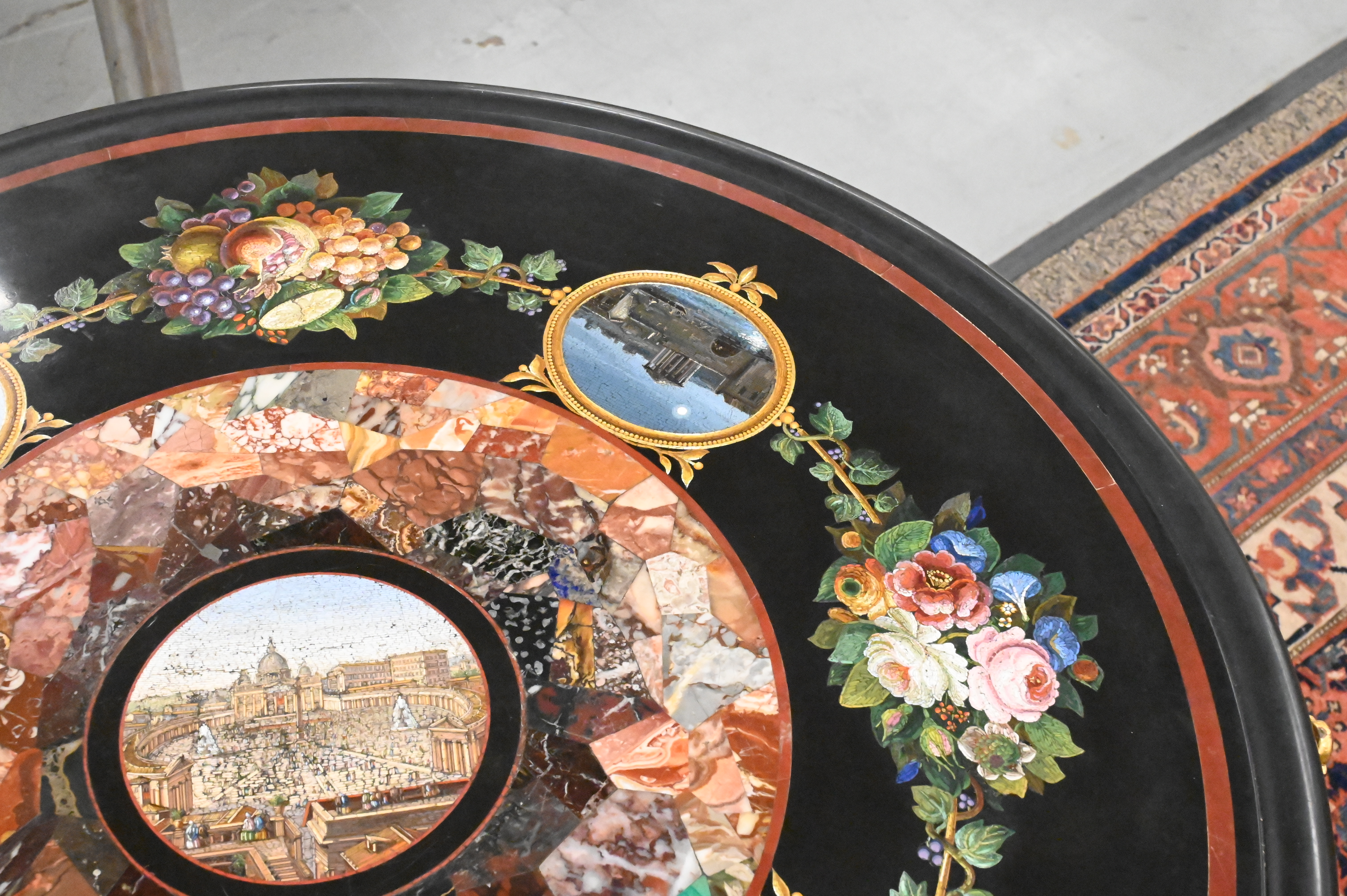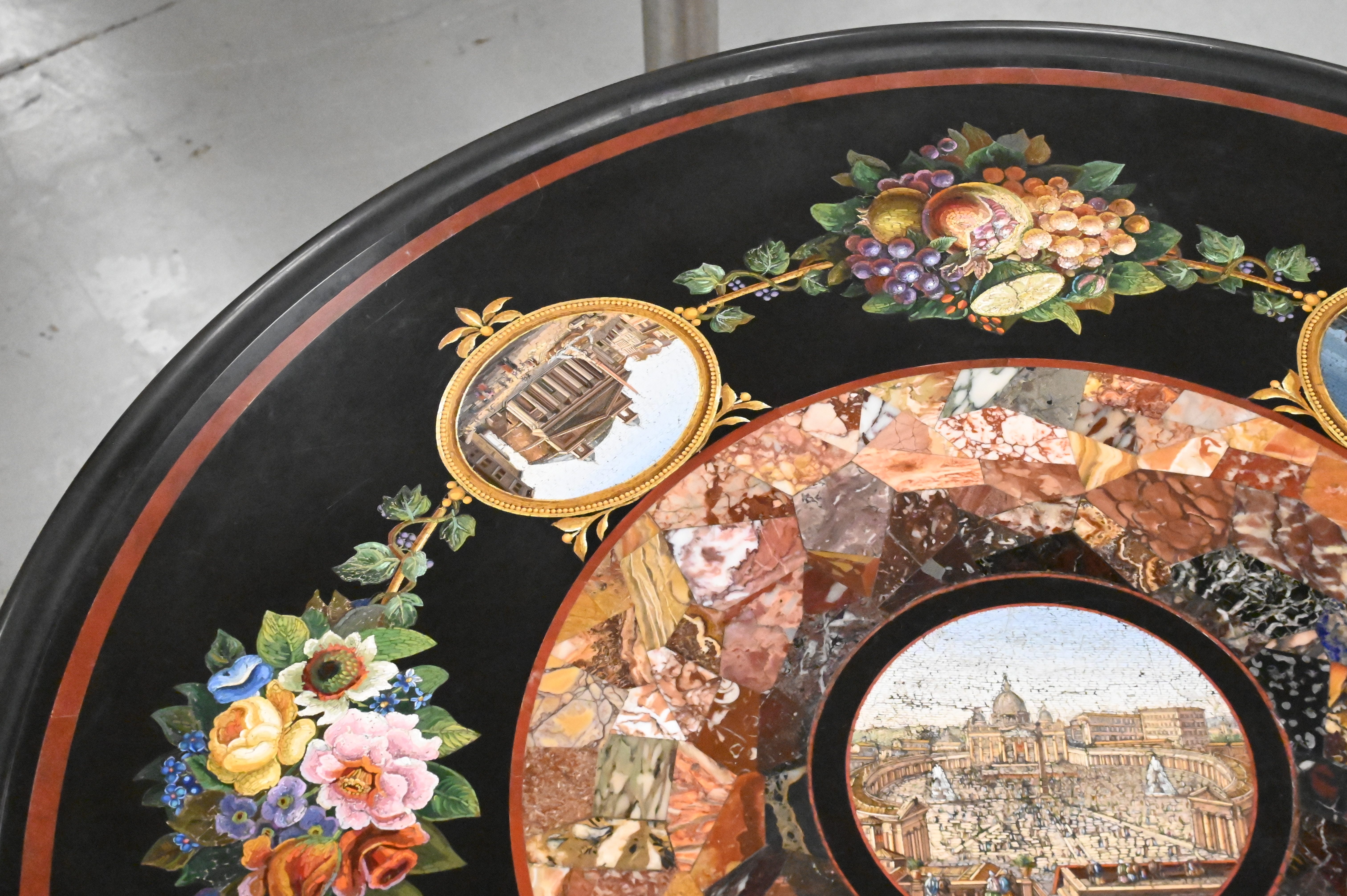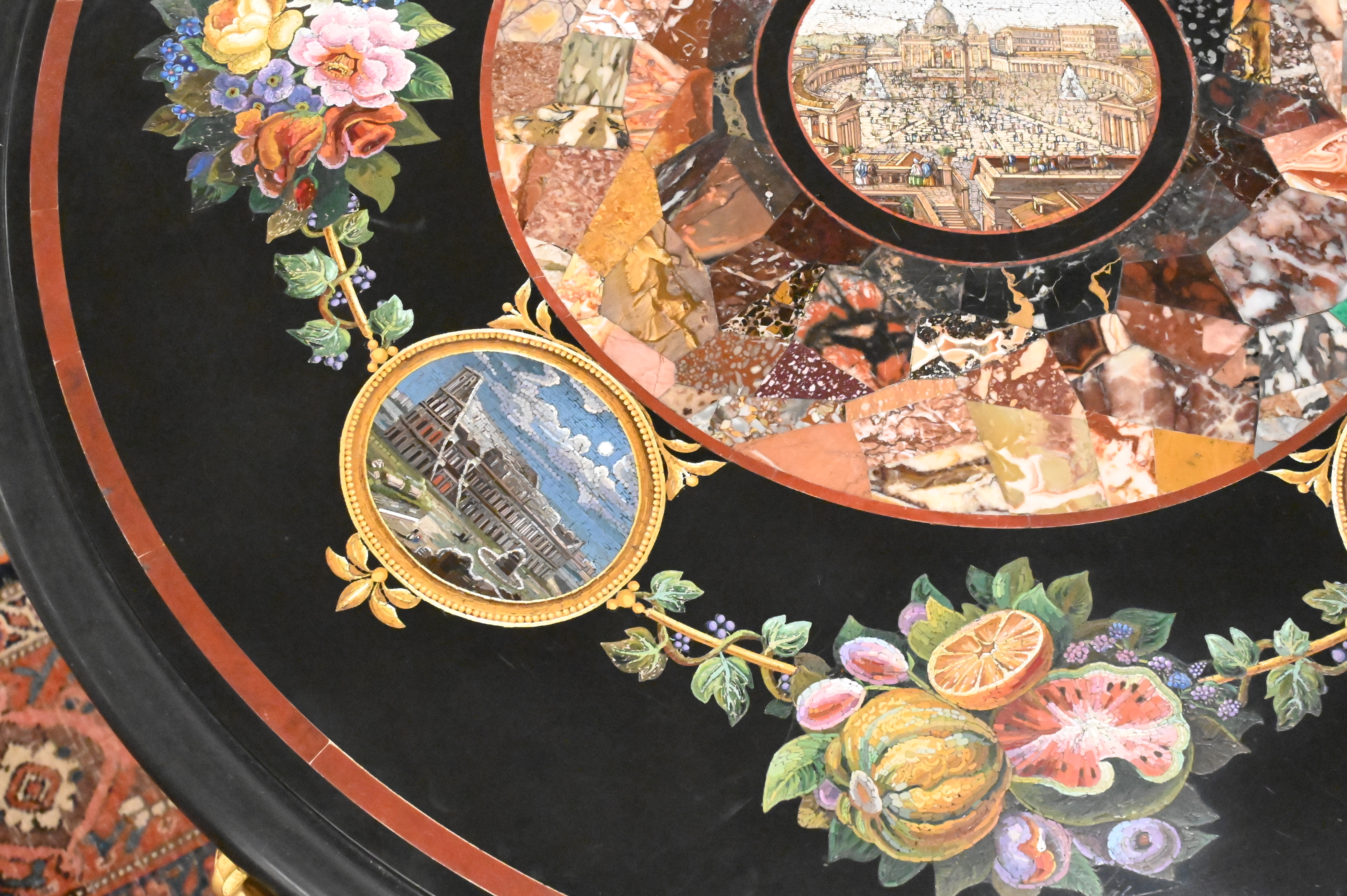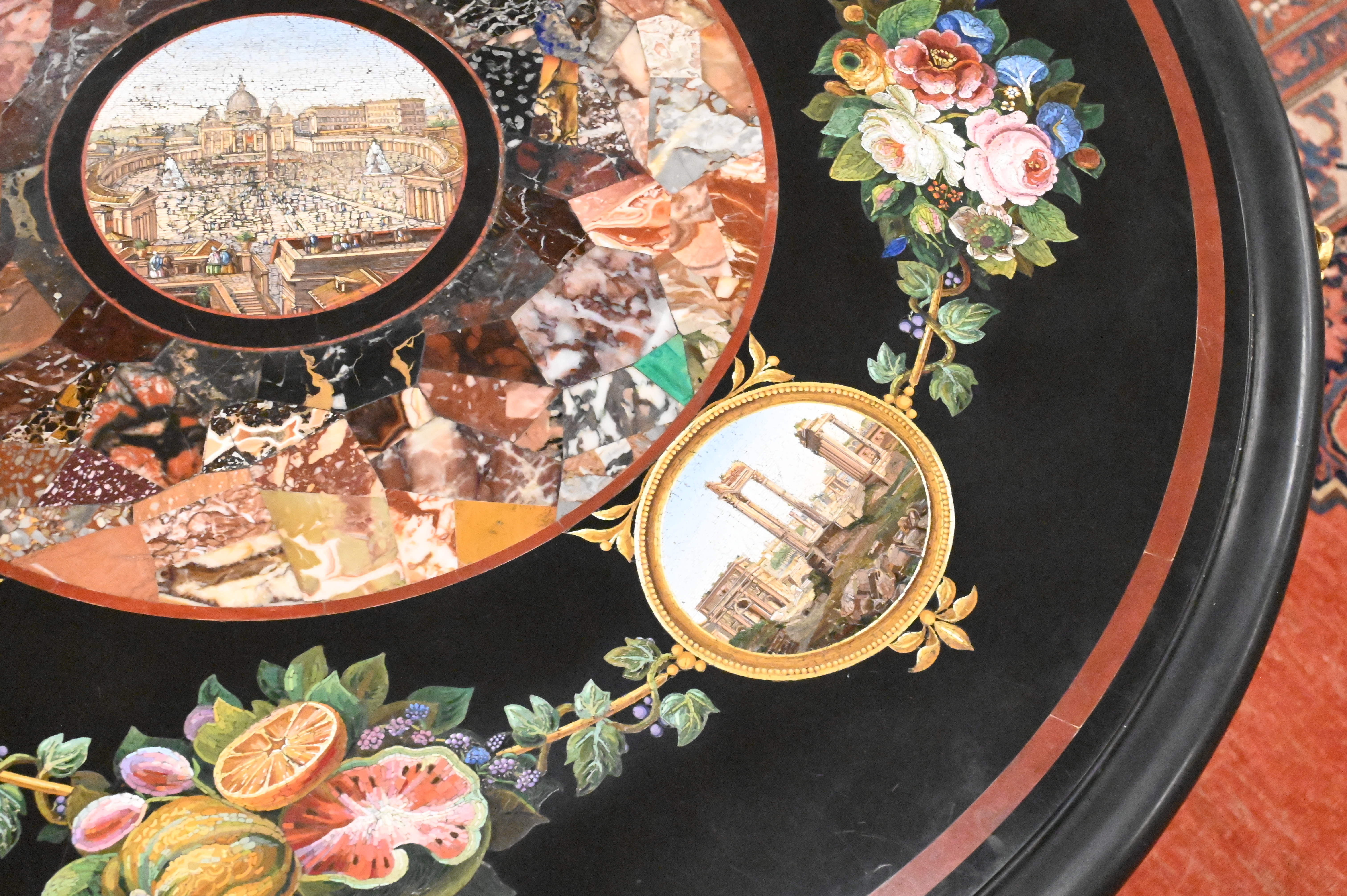 Condition: presents well, light scratching to mosaic surface, cracks to skirt, one putti repaired at seat with a 1/2 inch of wood missing from seat
