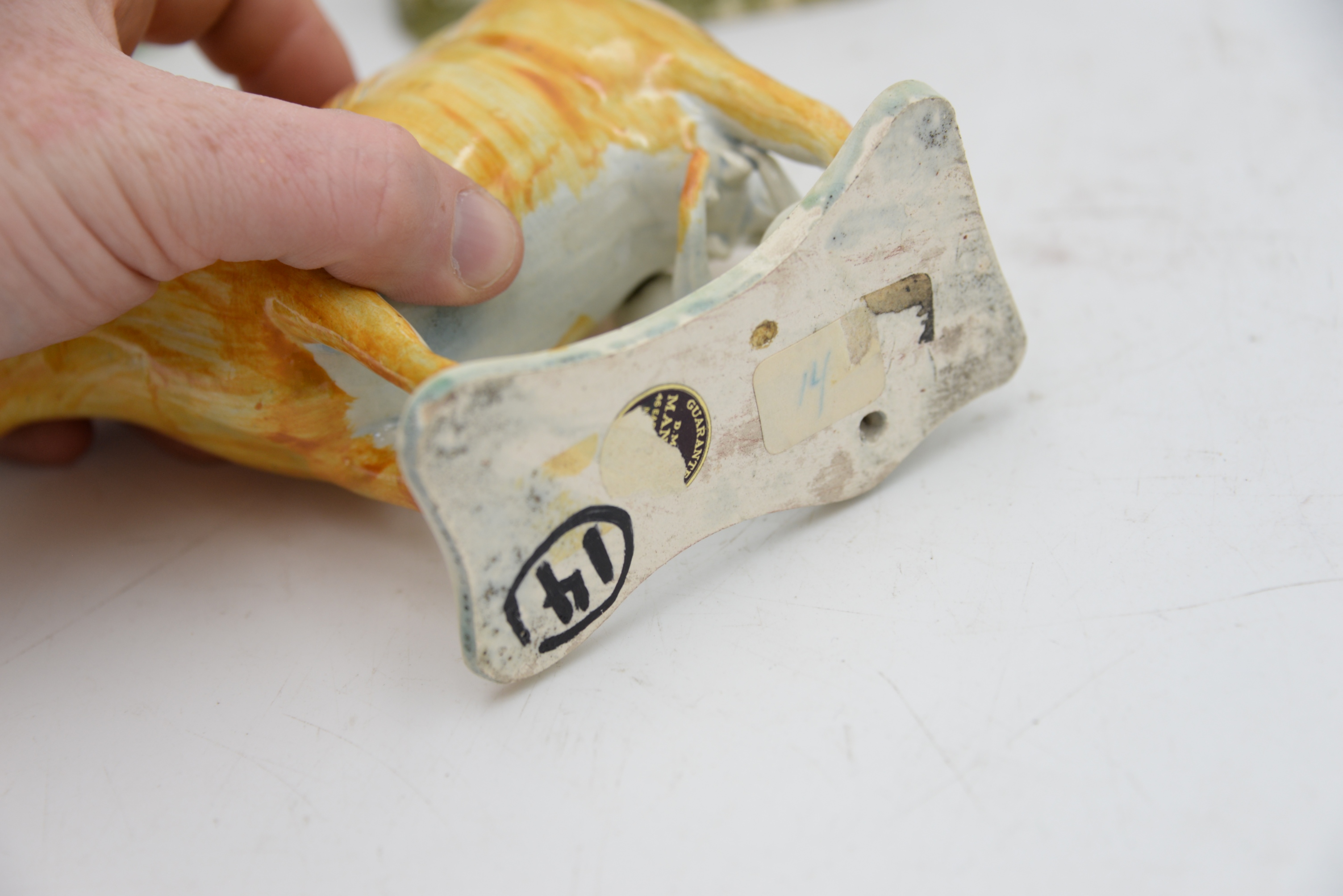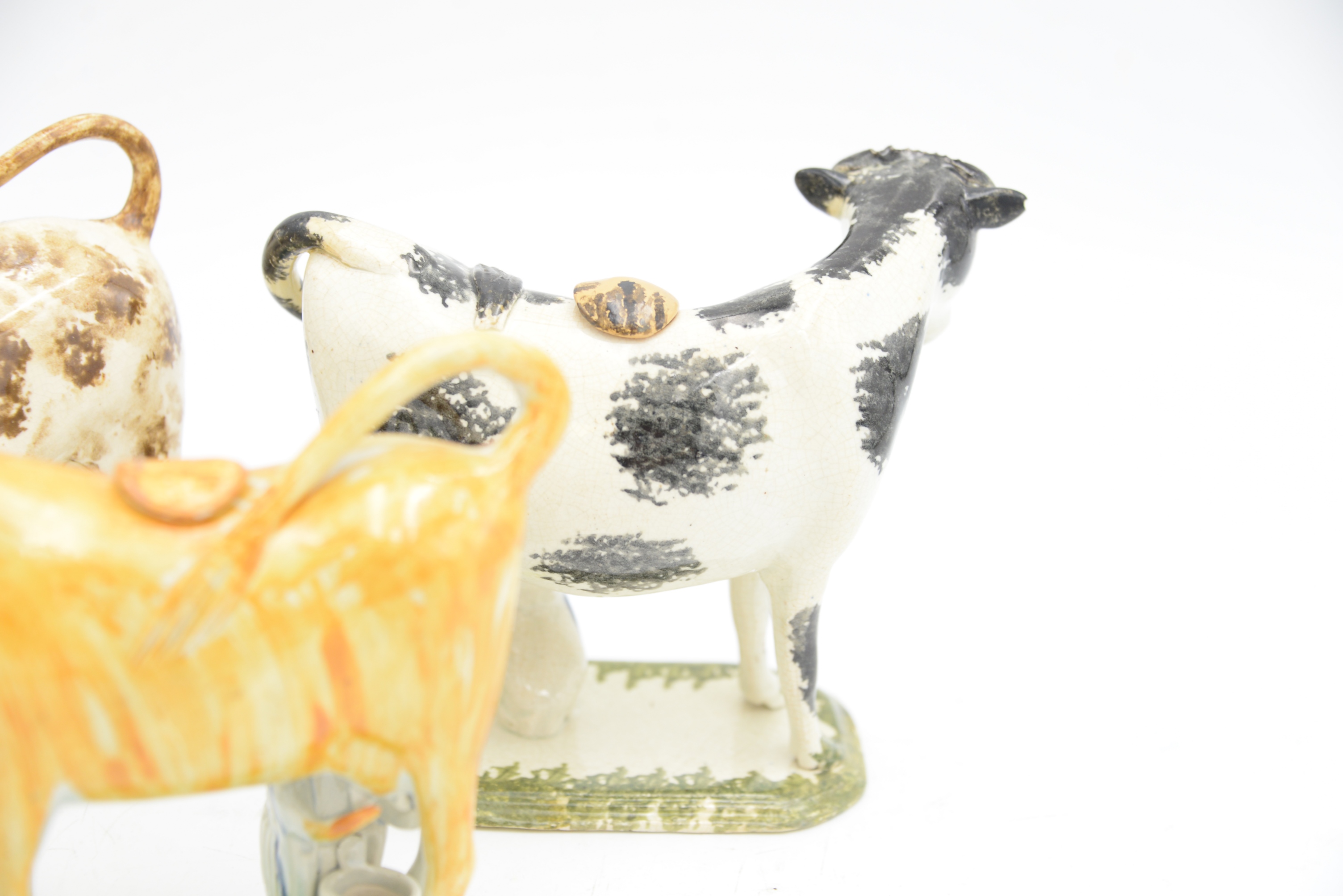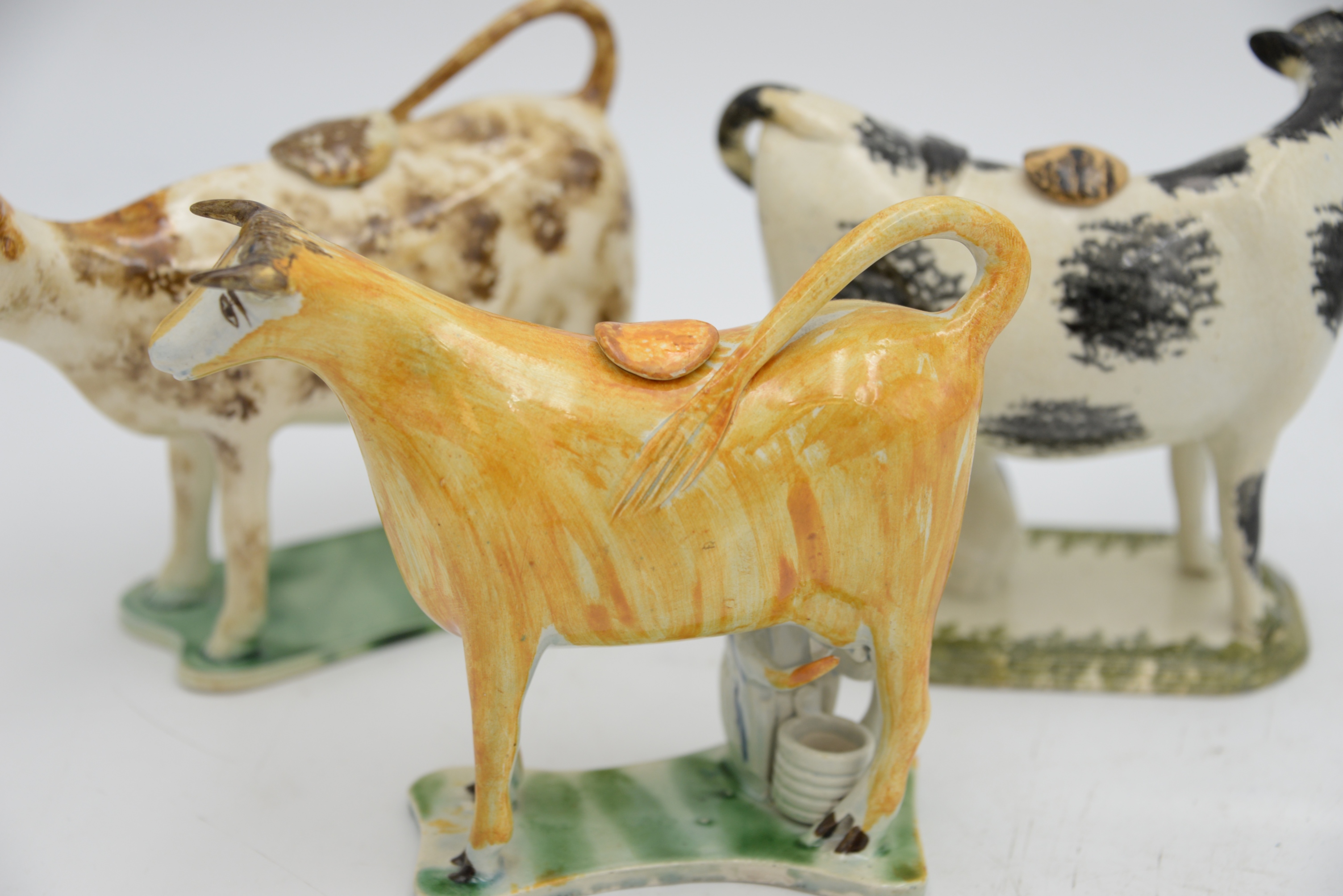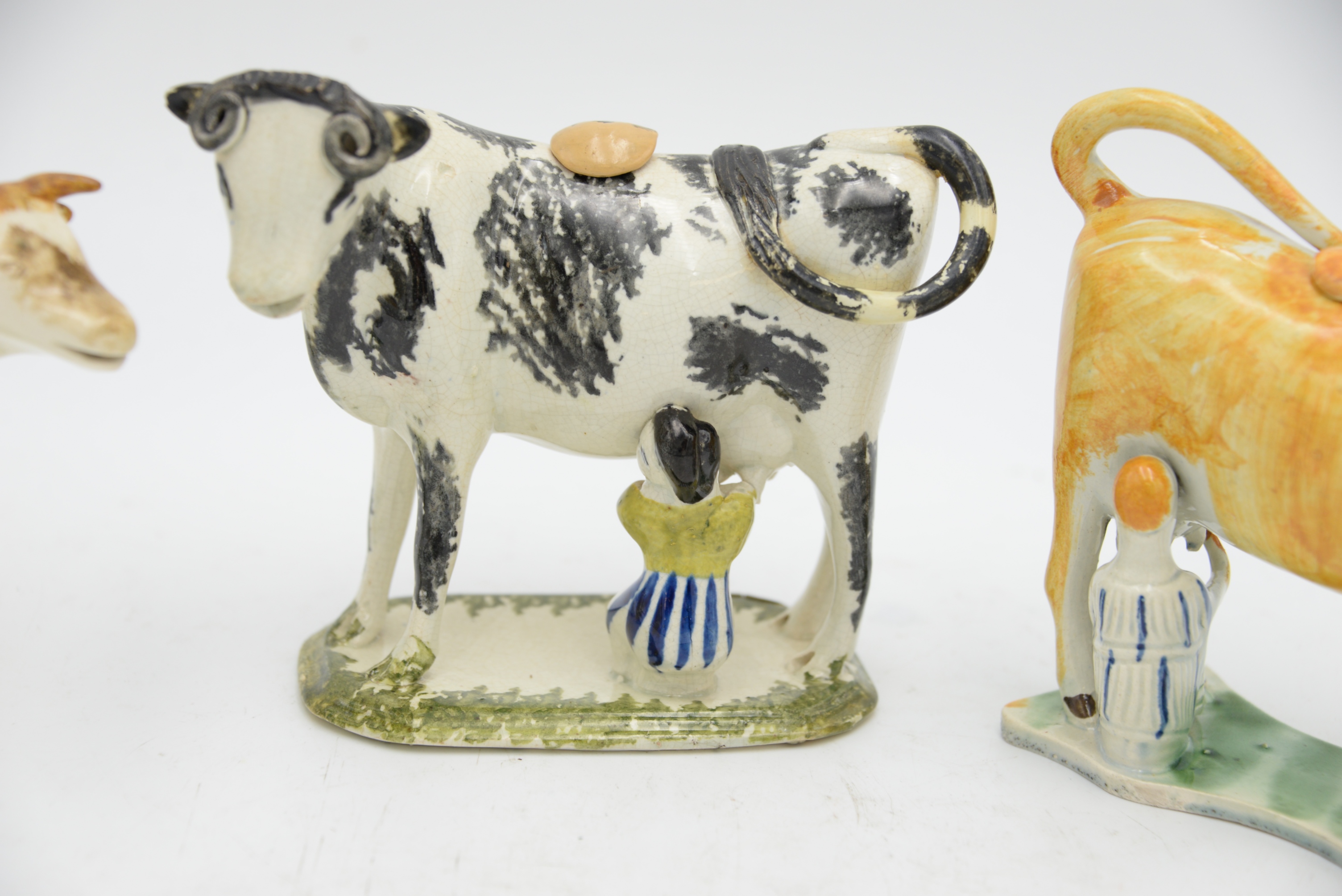 Three English Staffordshire Pearlware Cow Creamers with Lids, 19th century, to include one brown spotted cow, L5.003 A, B (repaired tail and ears), height 5 inches; one black and white spotted cow with curled horns and milkmaid L5.007 A, B, (repaired ears, tail and base), height 5 inches; along with one yellow cow having repaired horns.