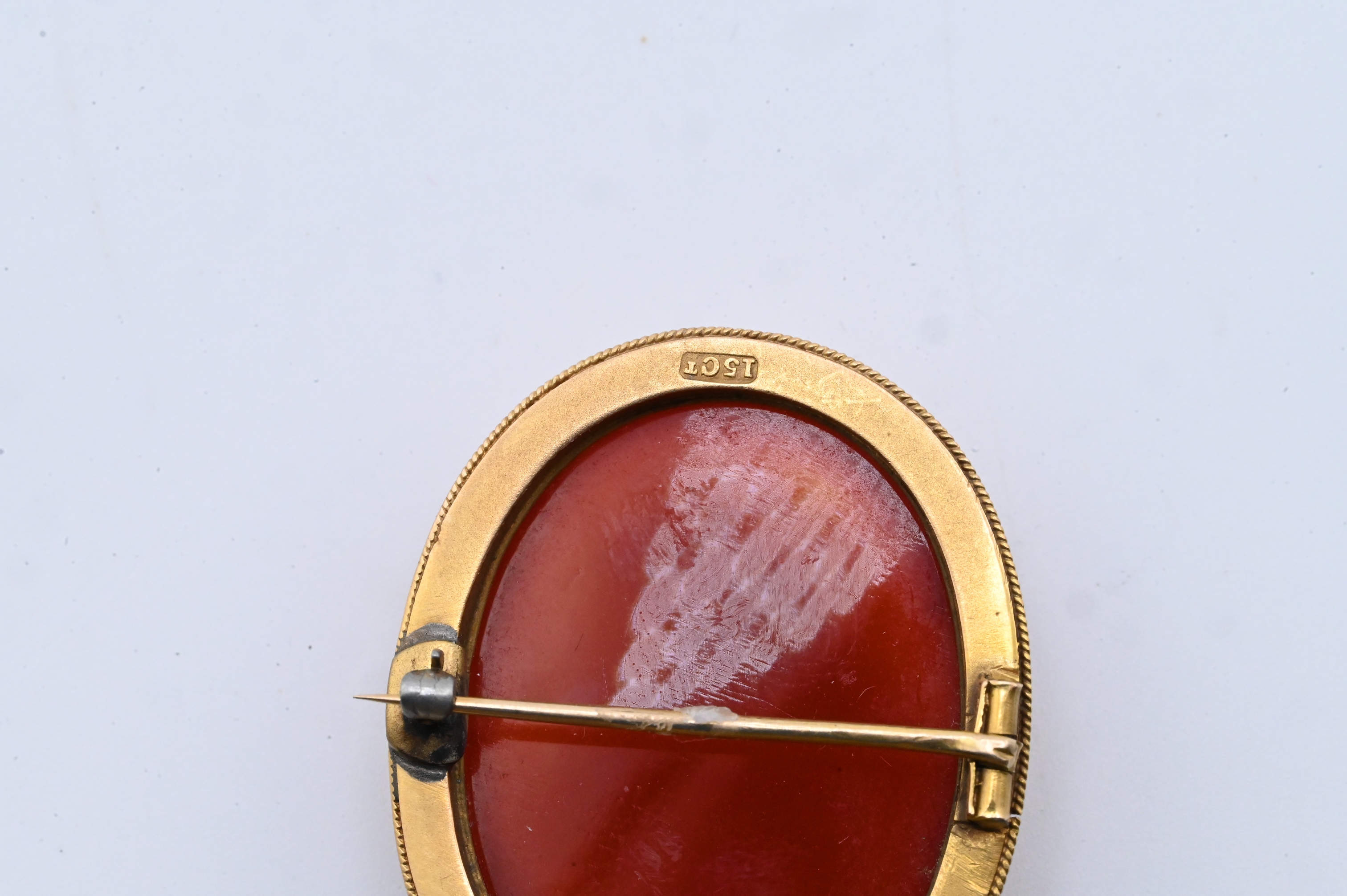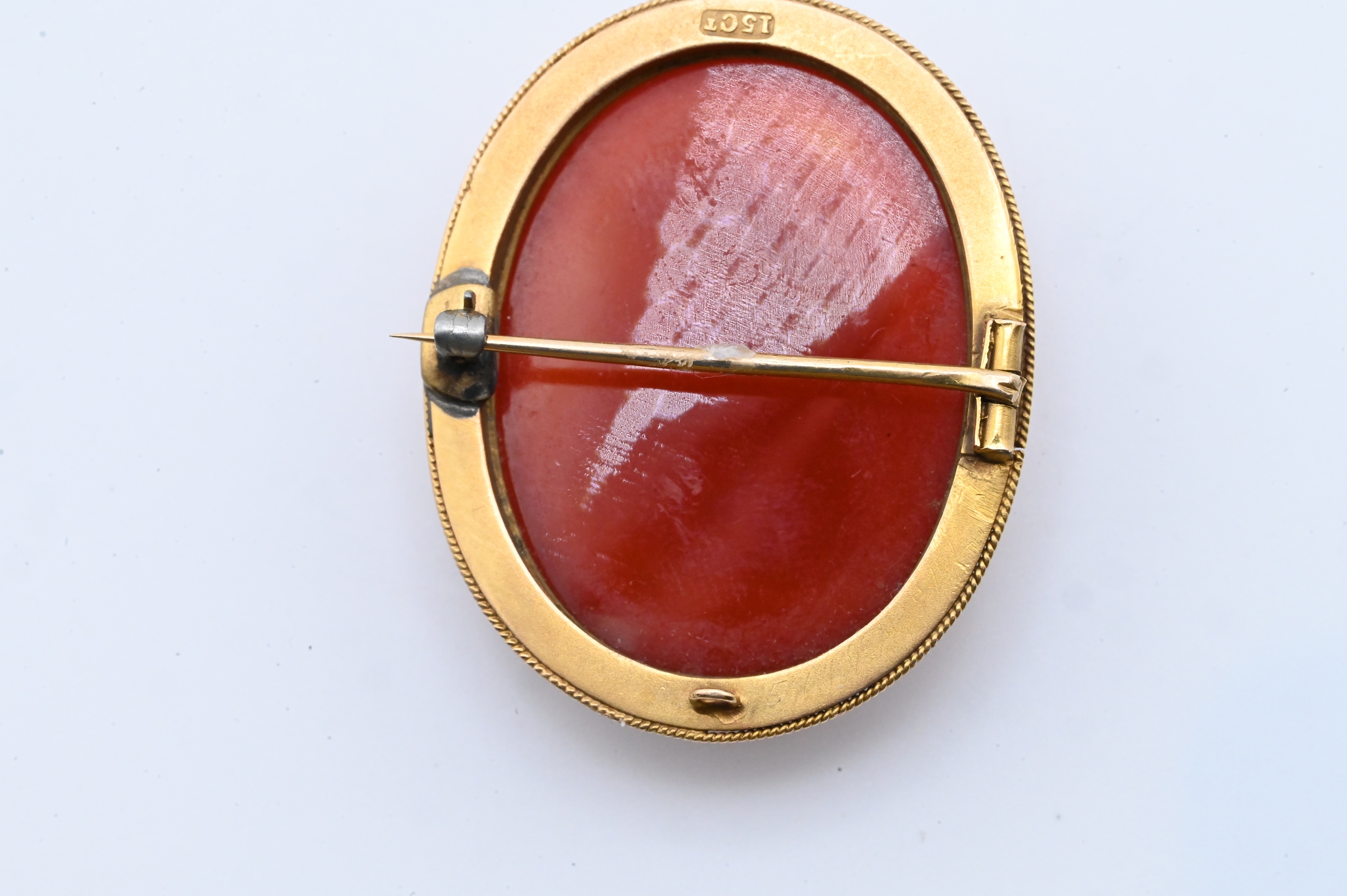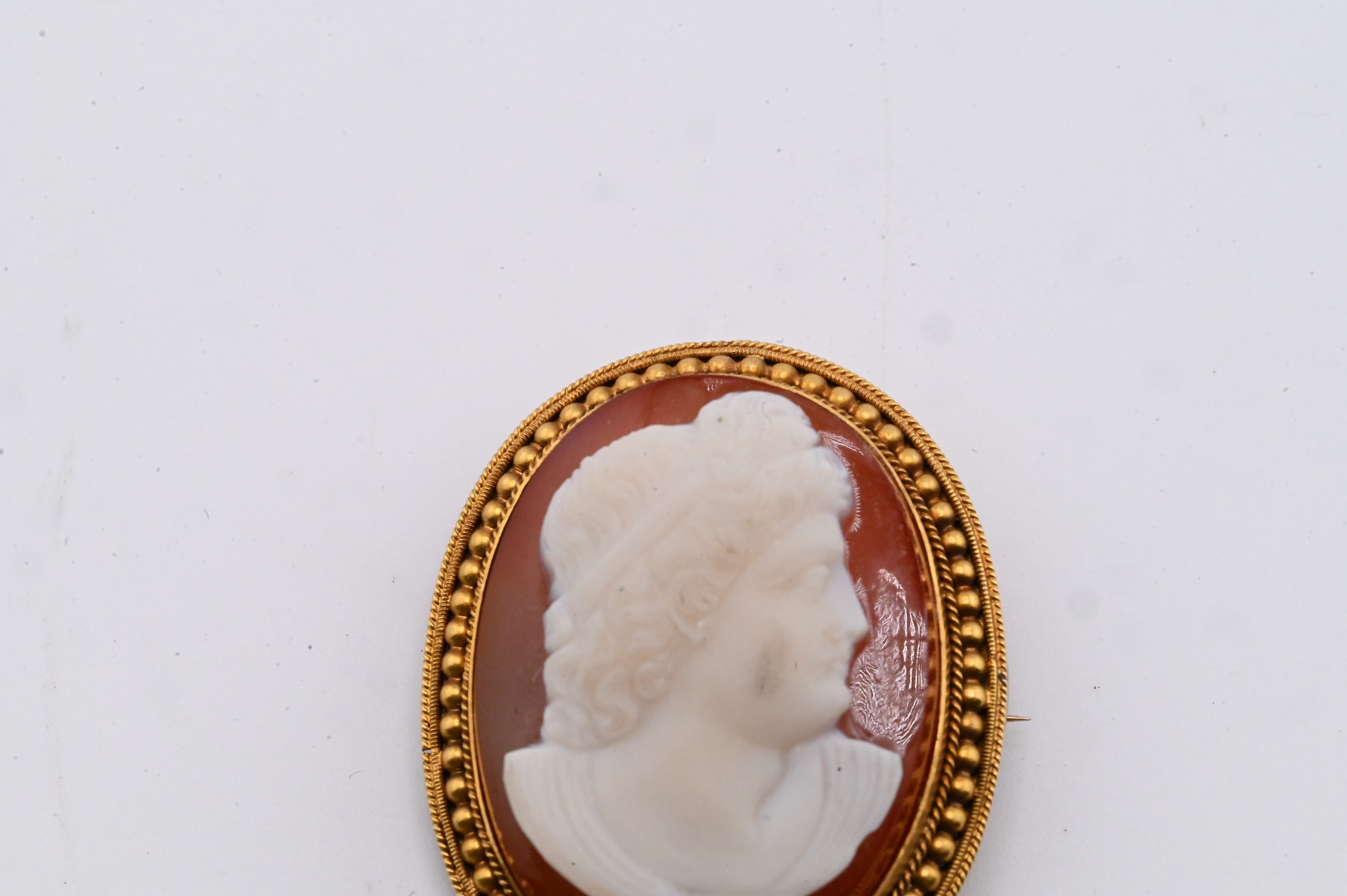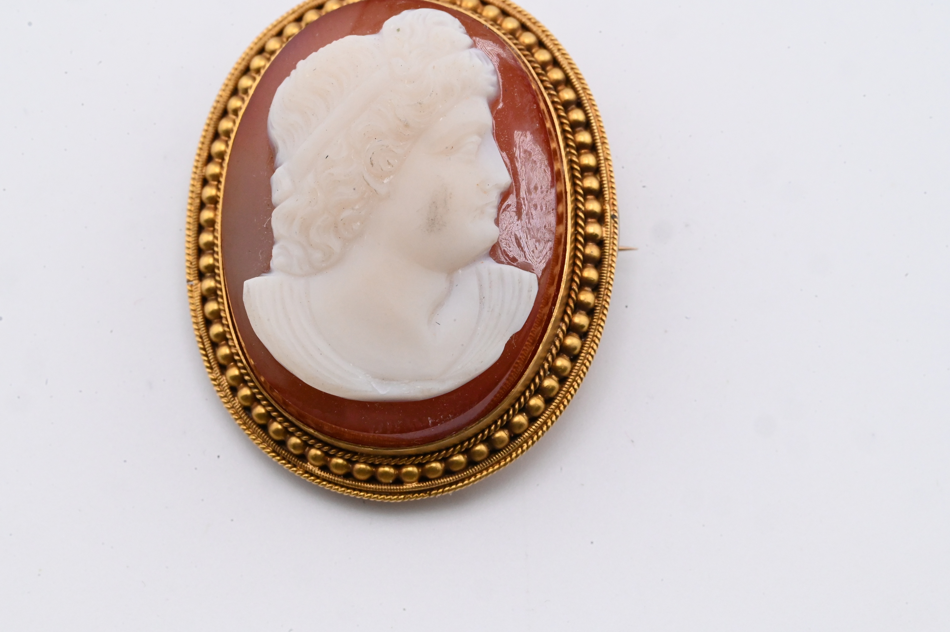 A carved sardonyx cameo depicting a classical female figure in right-facing profile, shown with curled hair bound by a band and wearing draped classical garments. Executed in white relief against a rich reddish-orange ground. Mounted in an oval 15k gold beaded frame. Height 1 3/8 inches