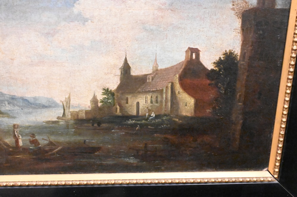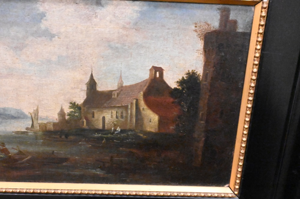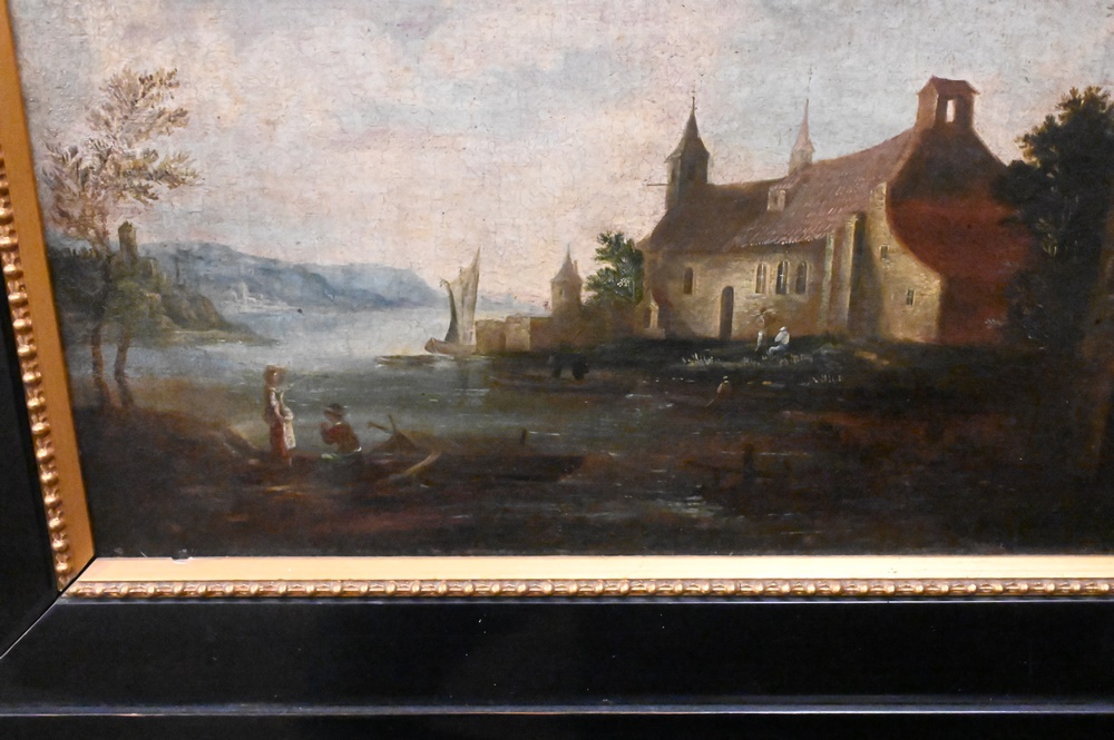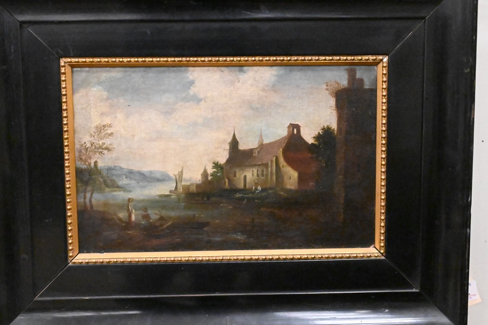 Dutch School, 19th century, peasants by a church beside a river, oil on canvas, sight size 9 3/4″ x 15 1/2″, ebonized frame 18″ x 24″, receipt on back. . Provenance: Christie’s New York Sale #8301, 11/3/99, lot 158. Property from the Estate of R. Thornton Wilson.