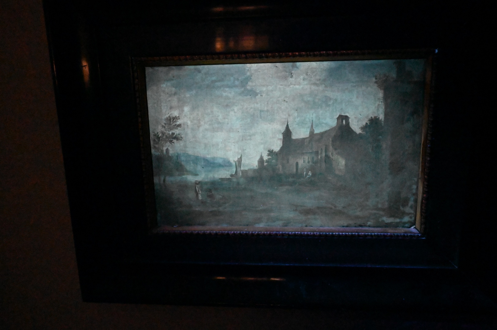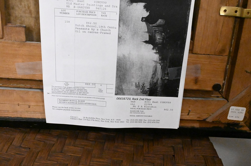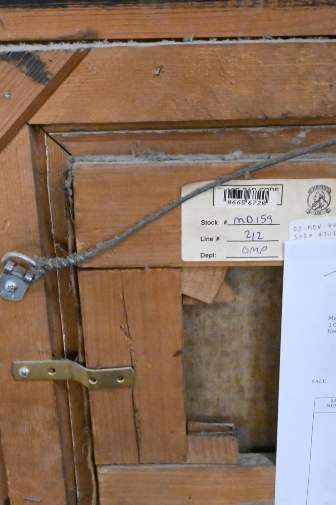 Lot 586: Dutch School, 19th century, peasants by a church beside a river, oil on canvas, sight size 9 3/4″ x 15 1/2″, ebonized frame 18″ x 24″, receipt on back. . Provenance: Christie’s New York Sale #8301, 11/3/99, lot 158. Property from the Estate of R. Thornton Wilson.