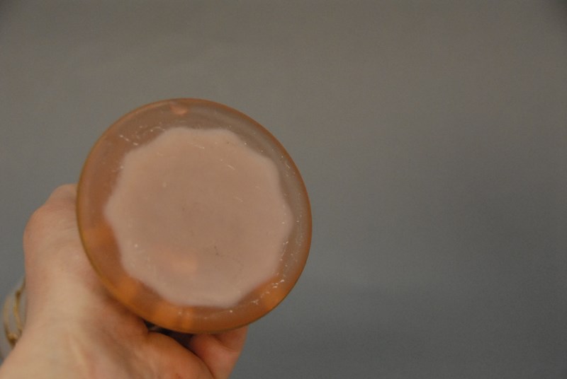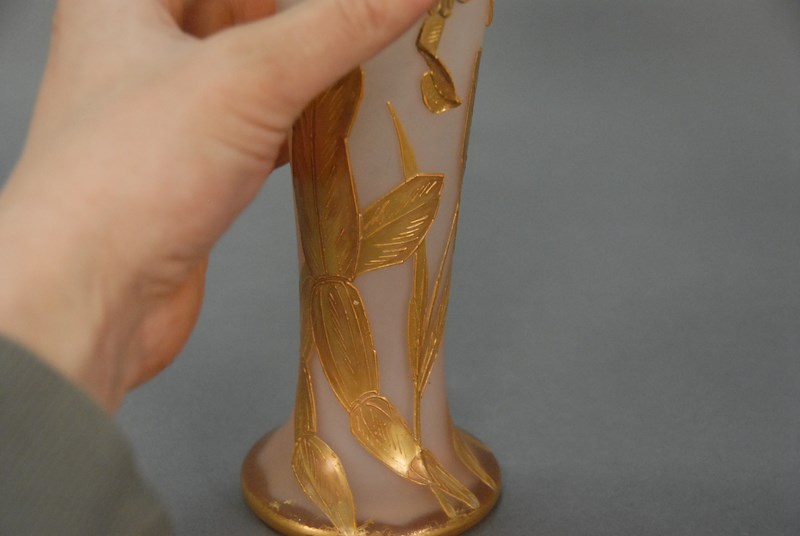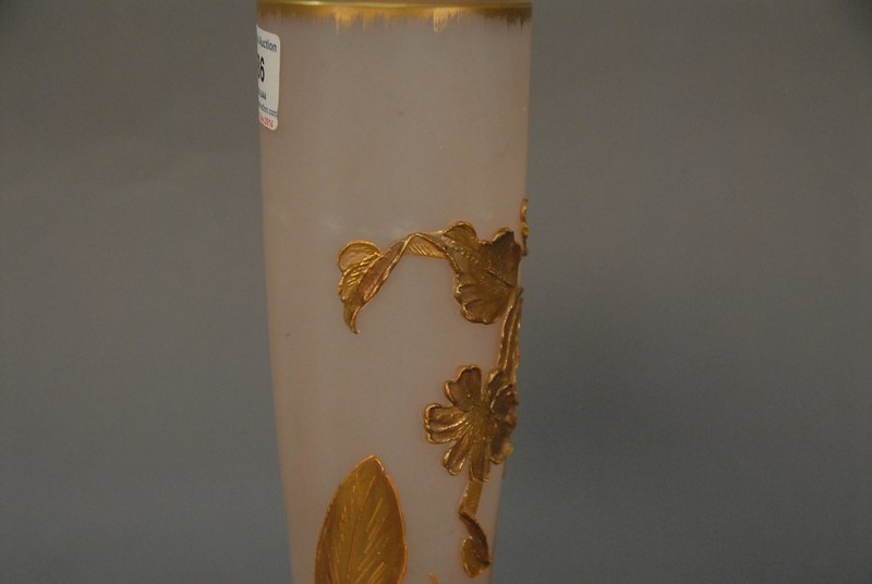 French art glass vase, pink with hi relief gold flowers. ht. 12in.