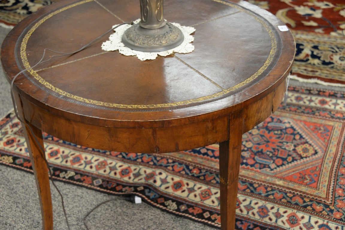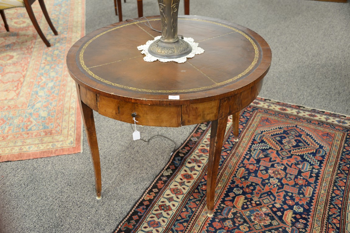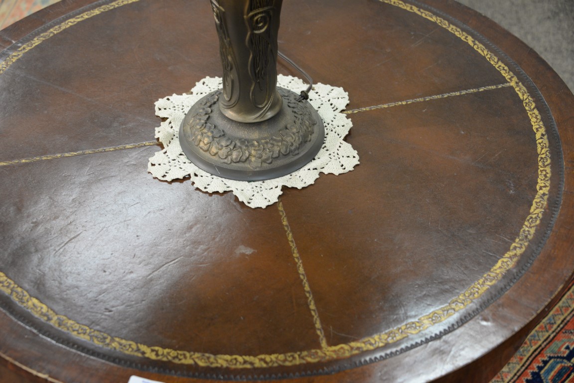 Lot 586: George III mahogany center table with leather top and one drawer, early 19th century. ht. 28in., dia. 25 1/2in.