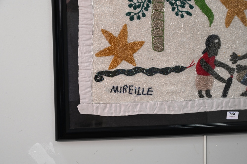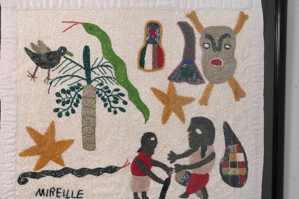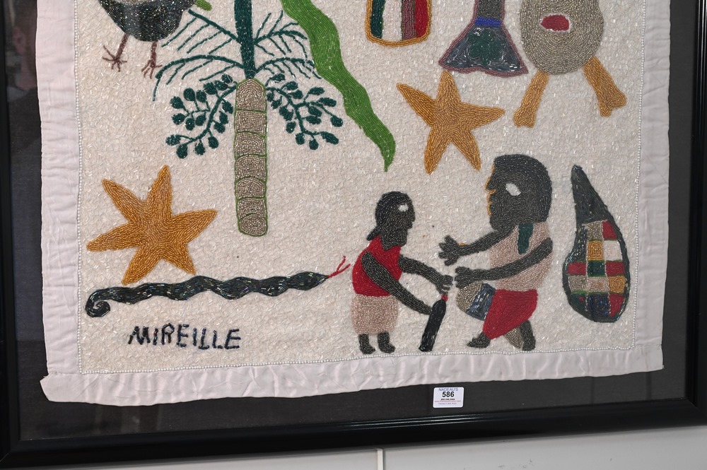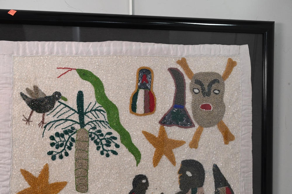 Lot 586: Haitian Beaded Voodoo, Drapeaus having figures mireille with silk border, 30″ x 30″.