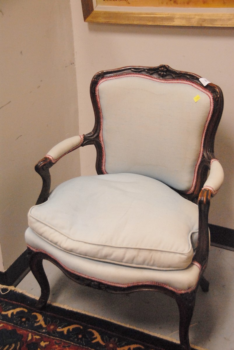 Louis XV walnut armchair with floral crest padded back, arms and seat and carved cabriole legs. Provenance: Property from The Estate of Margaret Reventlow of Litchfield, CT