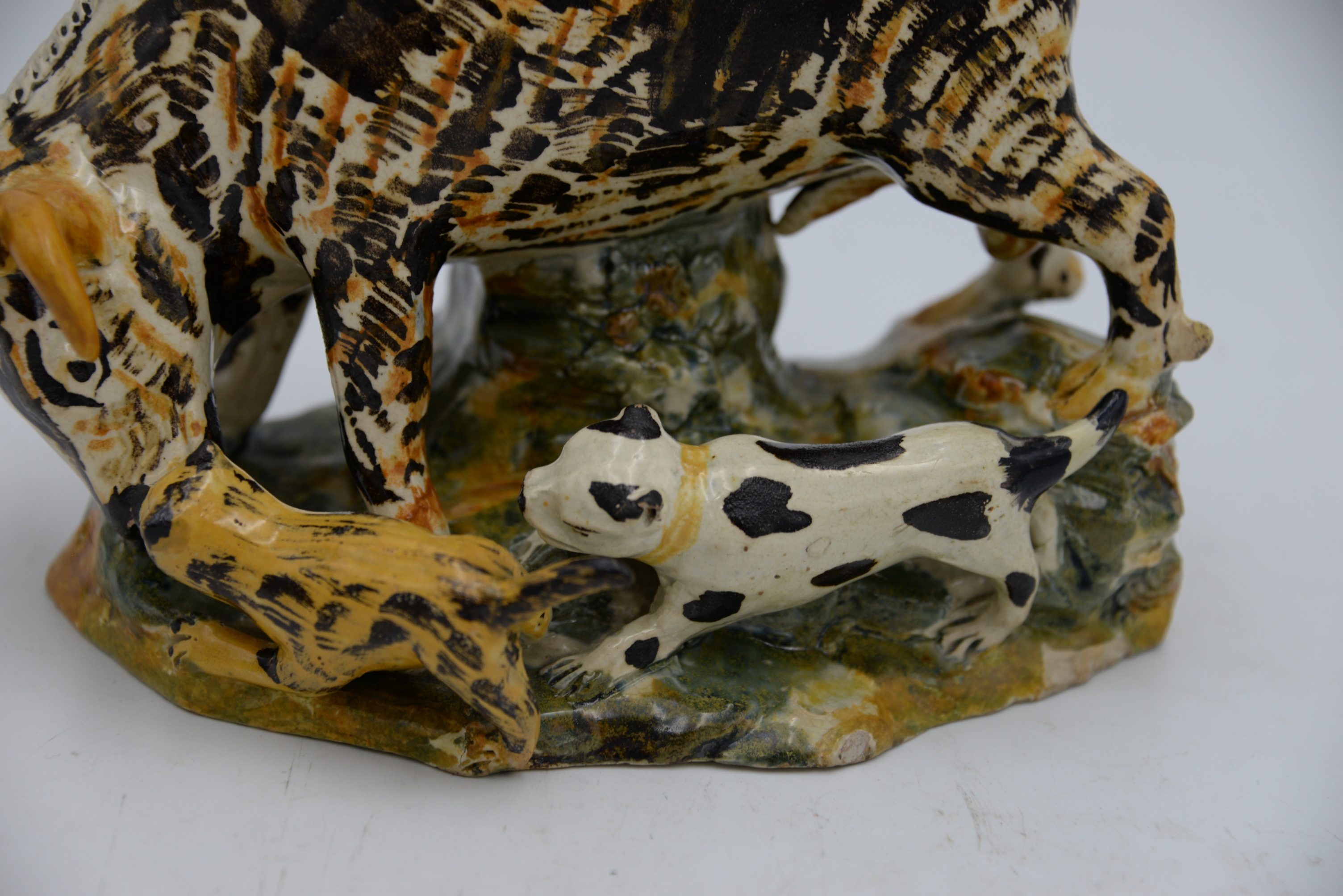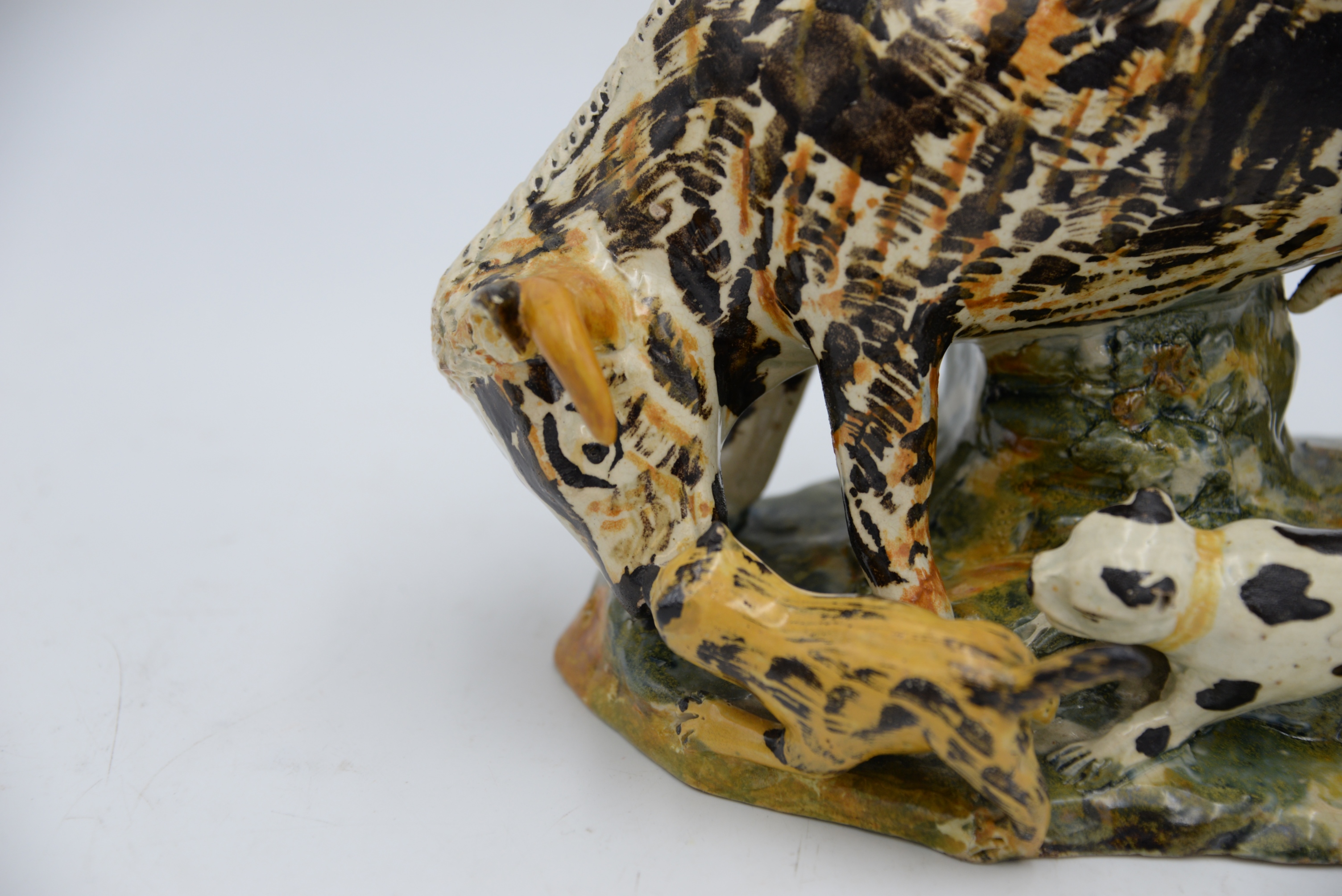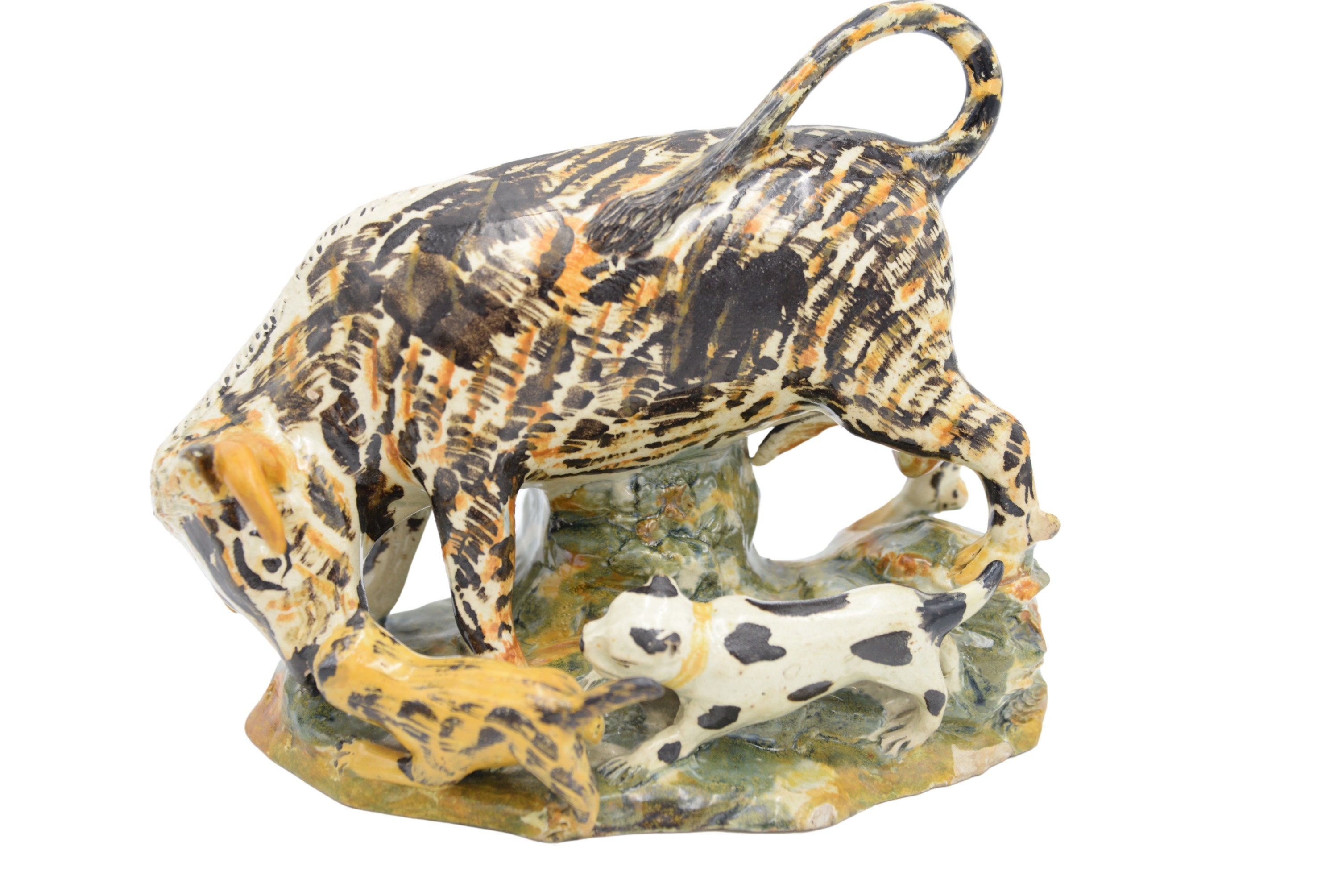 Rare English Staffordshire Bull Baiting Figurines, having two dogs, striped orange and brown colors (repairs to tails, ears and horn), DM & P Manheim label on reverse, early 19th century, height 6 3/4 inches.