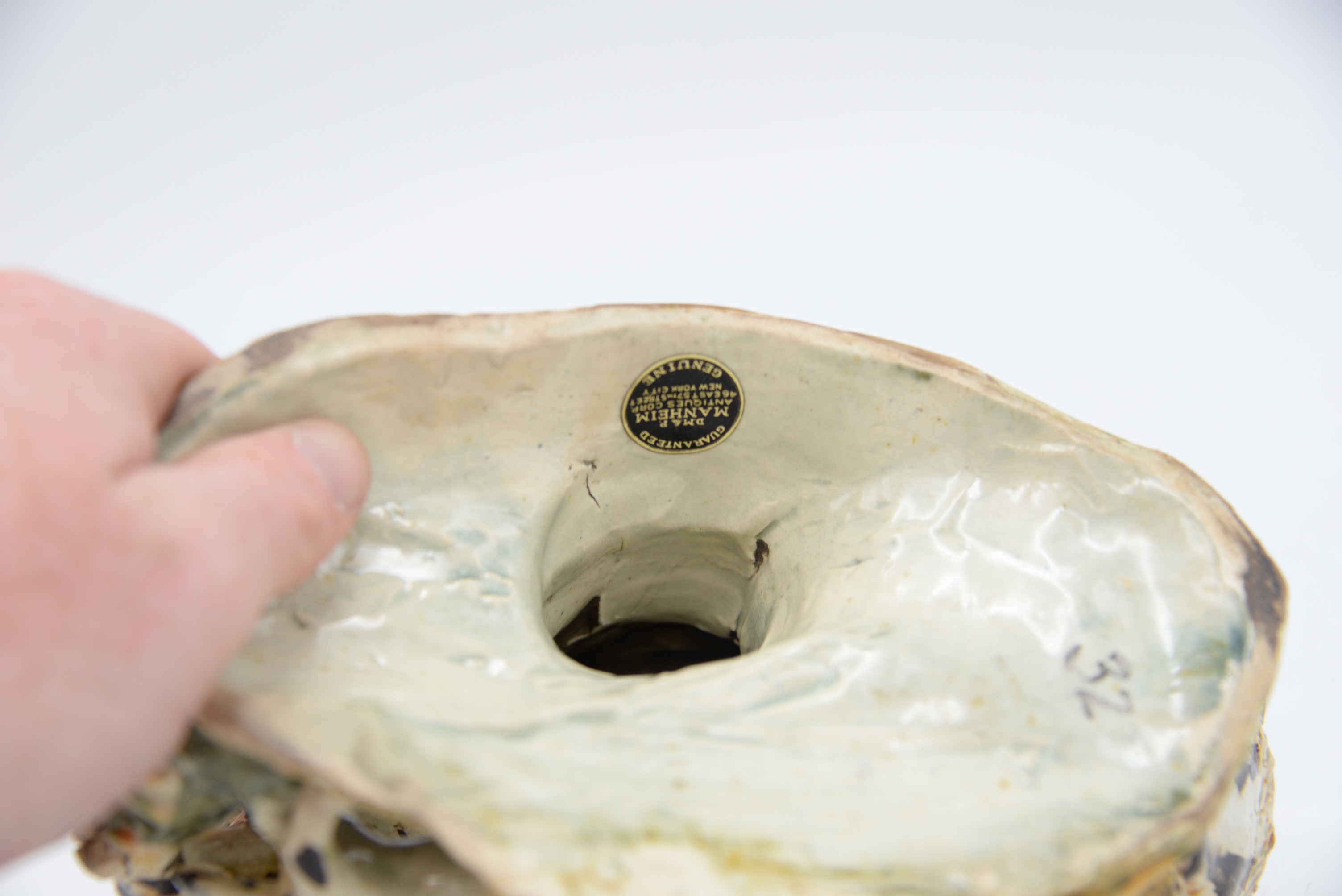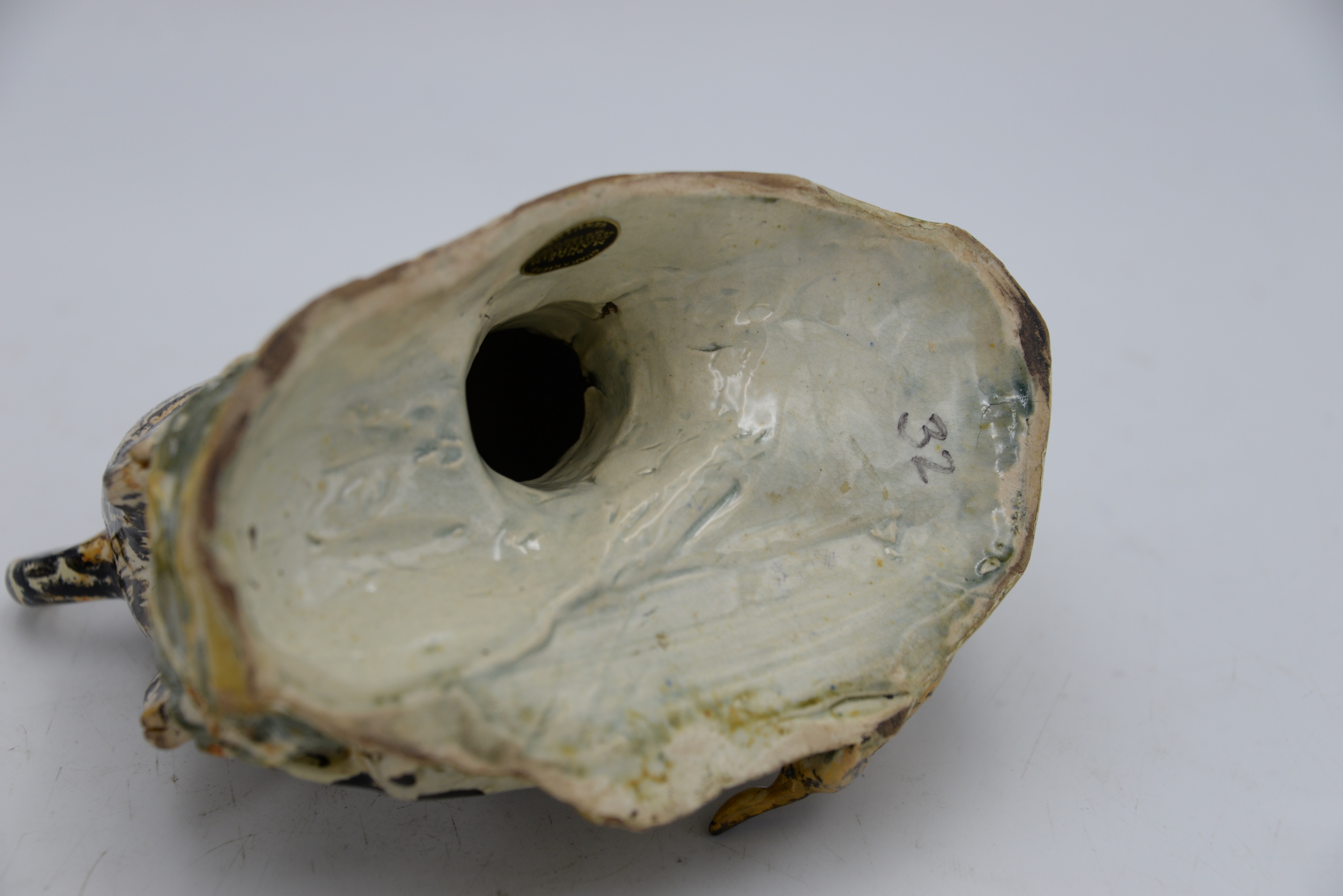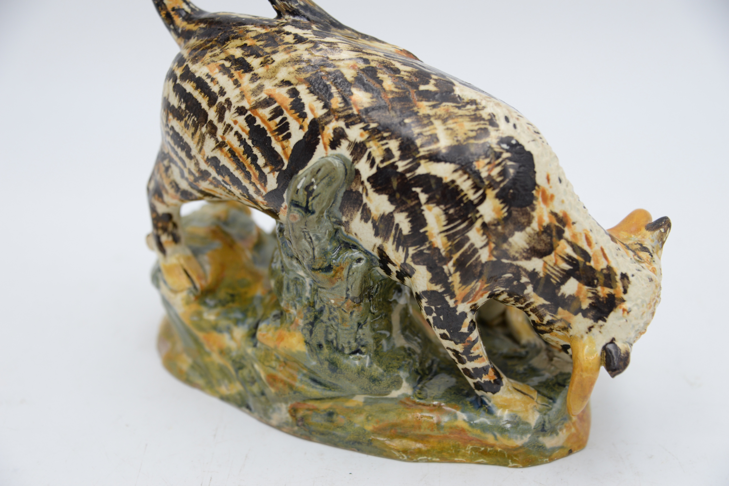 Rare English Staffordshire Bull Baiting Figurines, having two dogs, striped orange and brown colors (repairs to tails, ears and horn), DM & P Manheim label on reverse, early 19th century, height 6 3/4 inches.