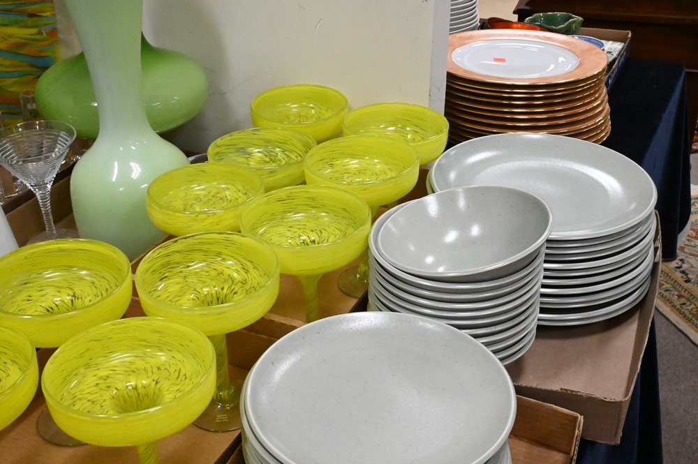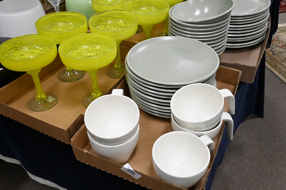 Lot 586: The Khaki Collection Dinnerware Set, to include bowls, plates, cups, along with a set of 10 margarita glasses.