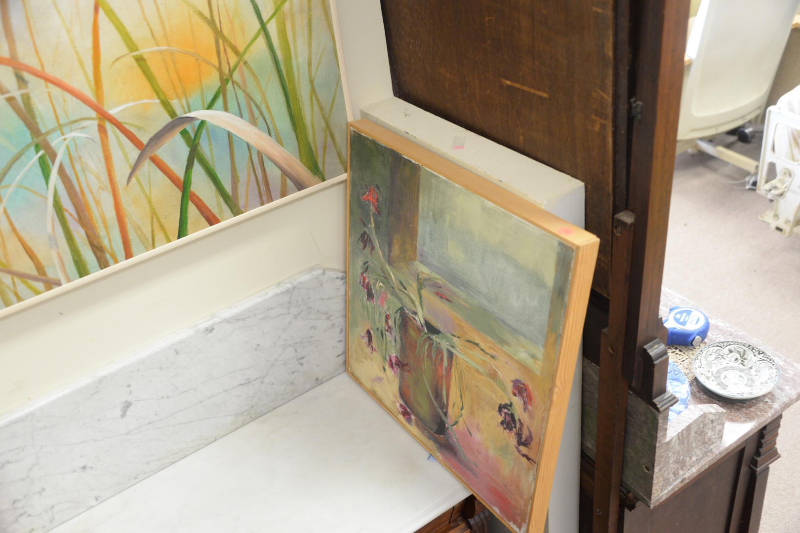 Lot 586: Three Framed Paintings to include B.V. Brook, oil on canvas, farm landscape with cornstalks, signed B.V. Brook, 1923 Barbara M. Mar…