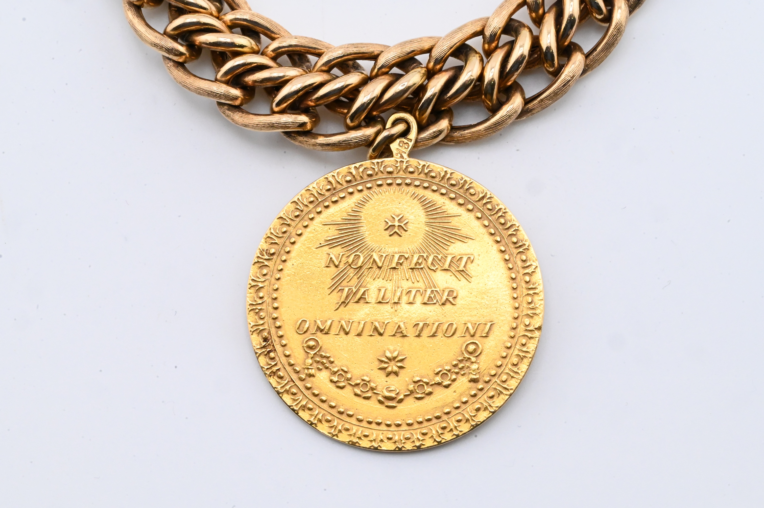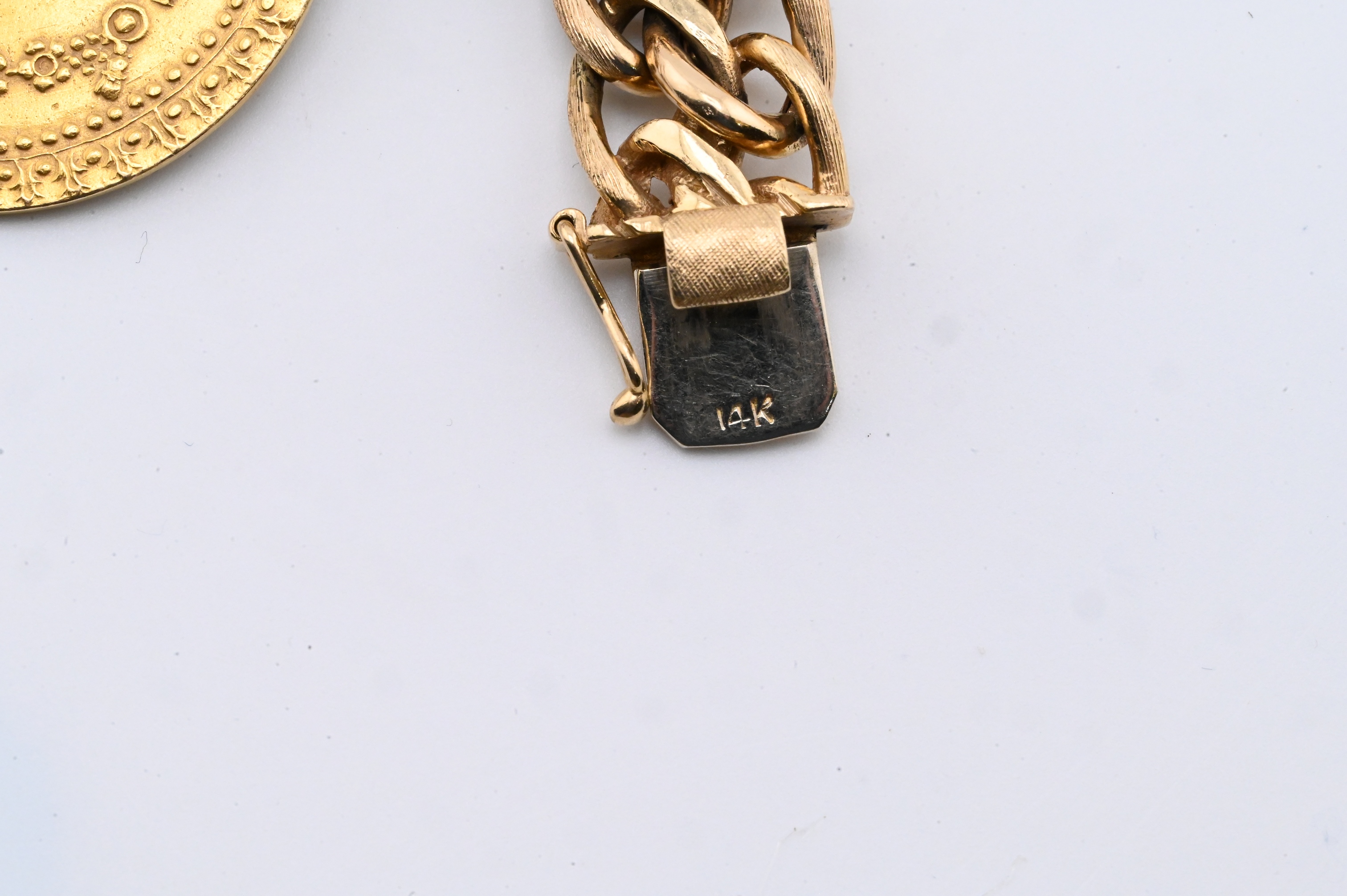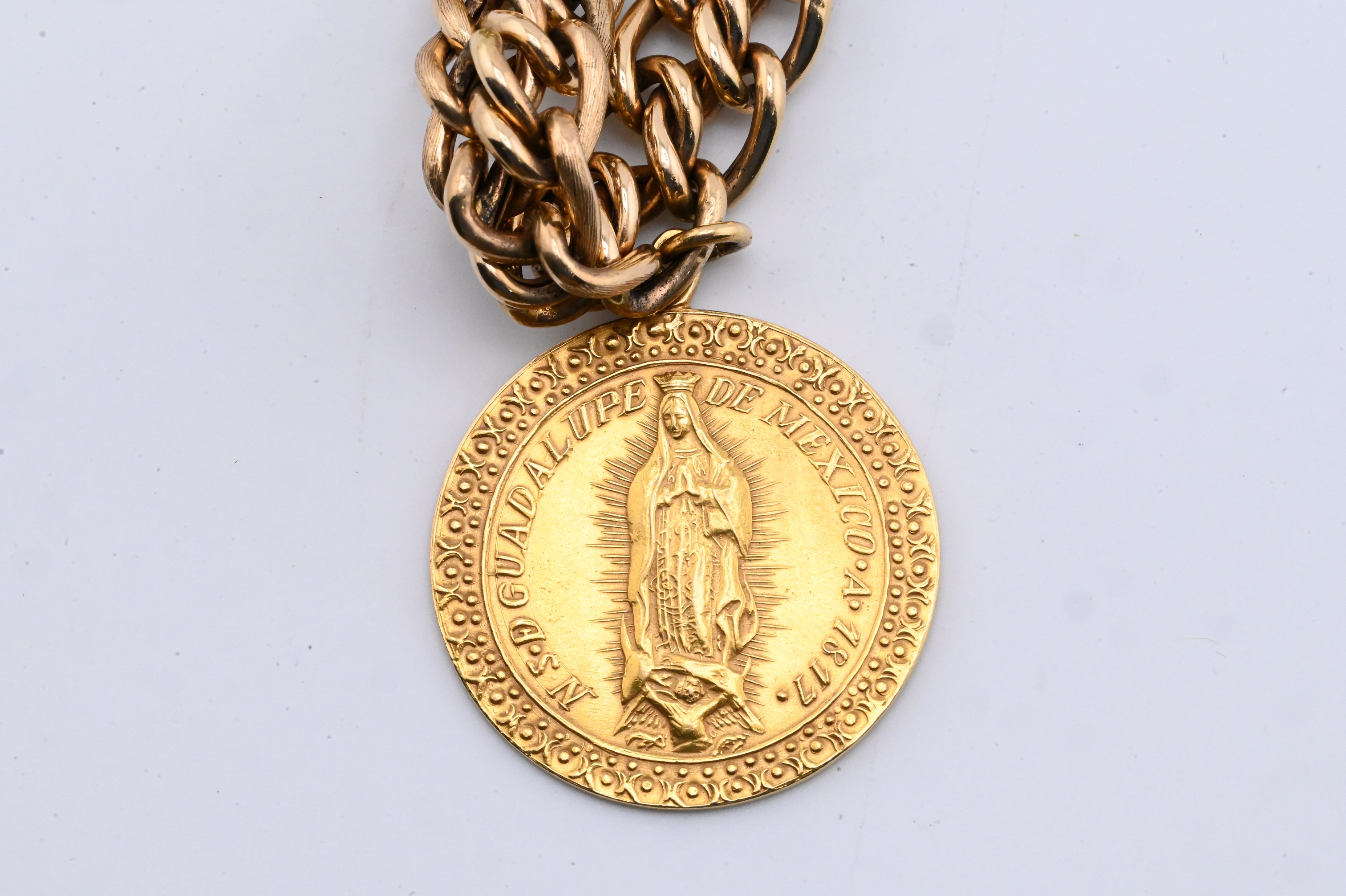 having 18K Lady of Guadalupe medallion, suspended from a heavy 14K gold link bracelet