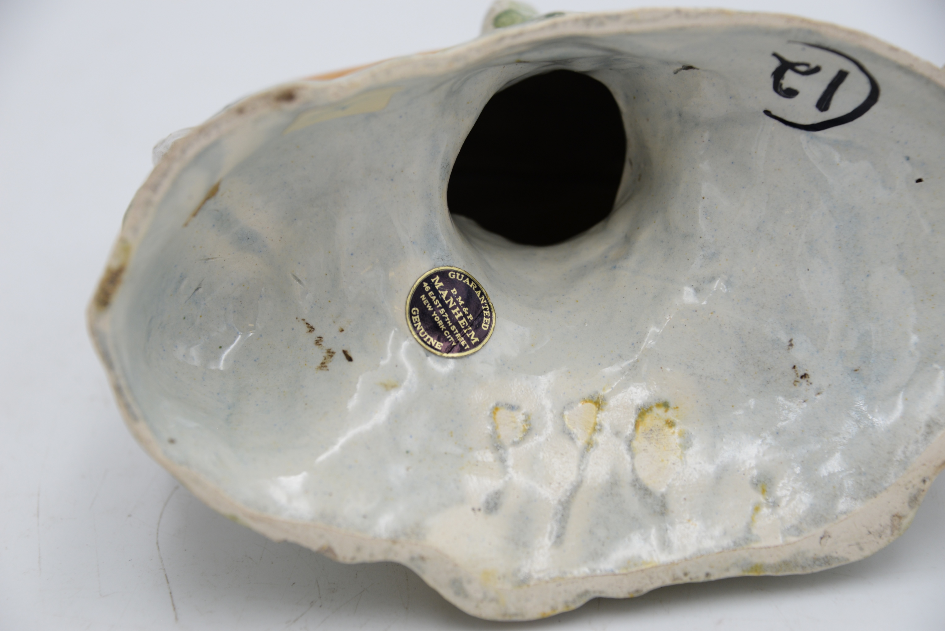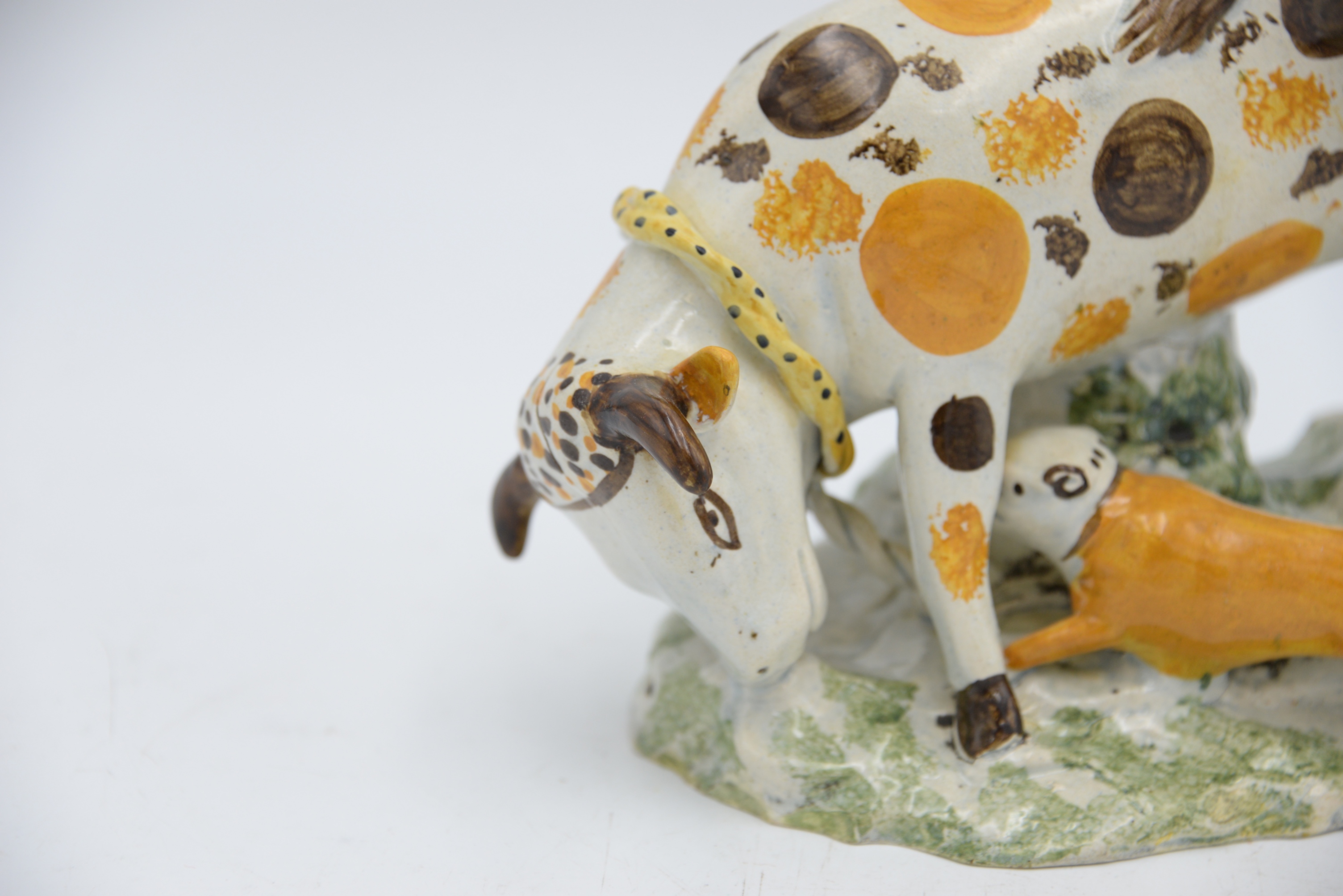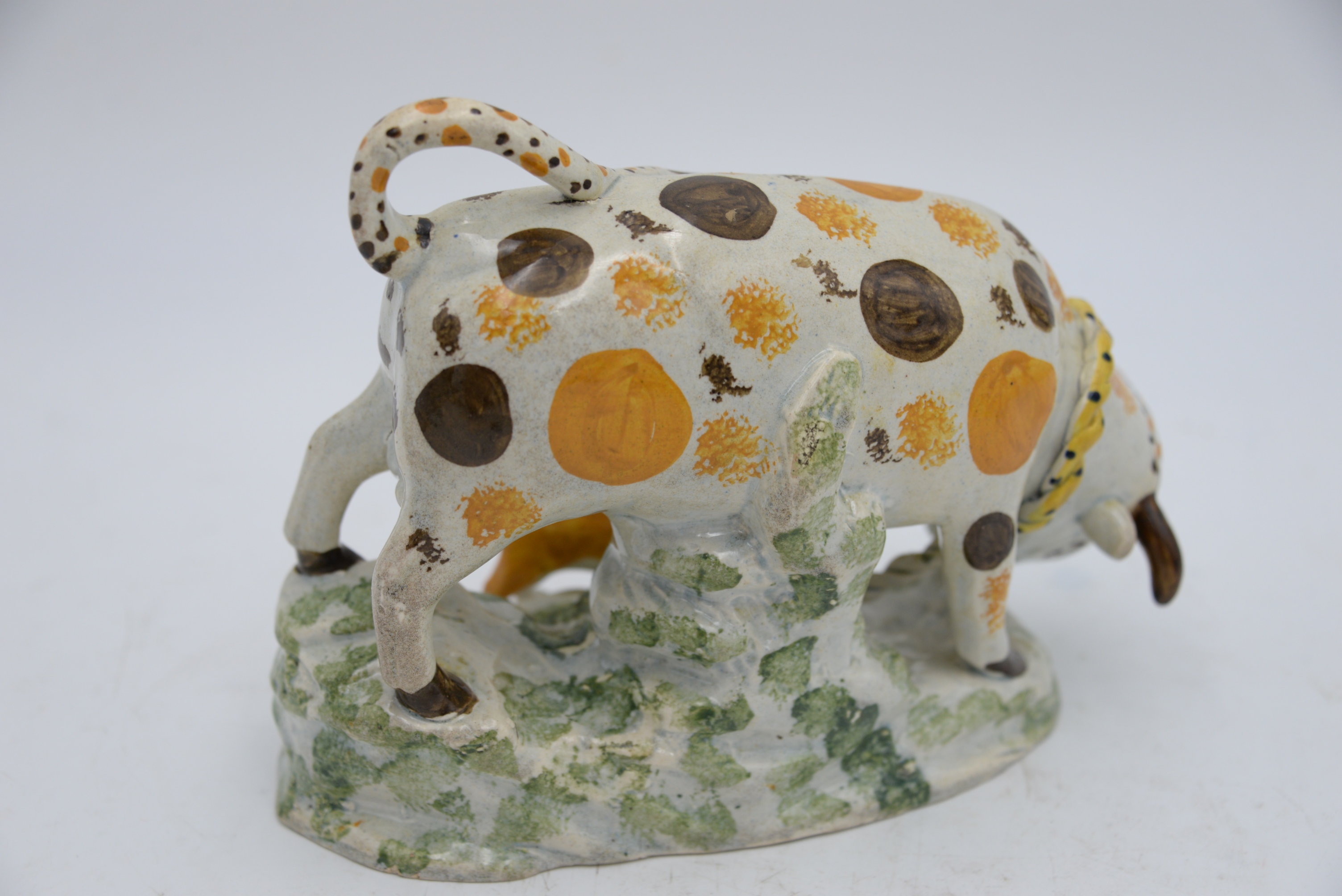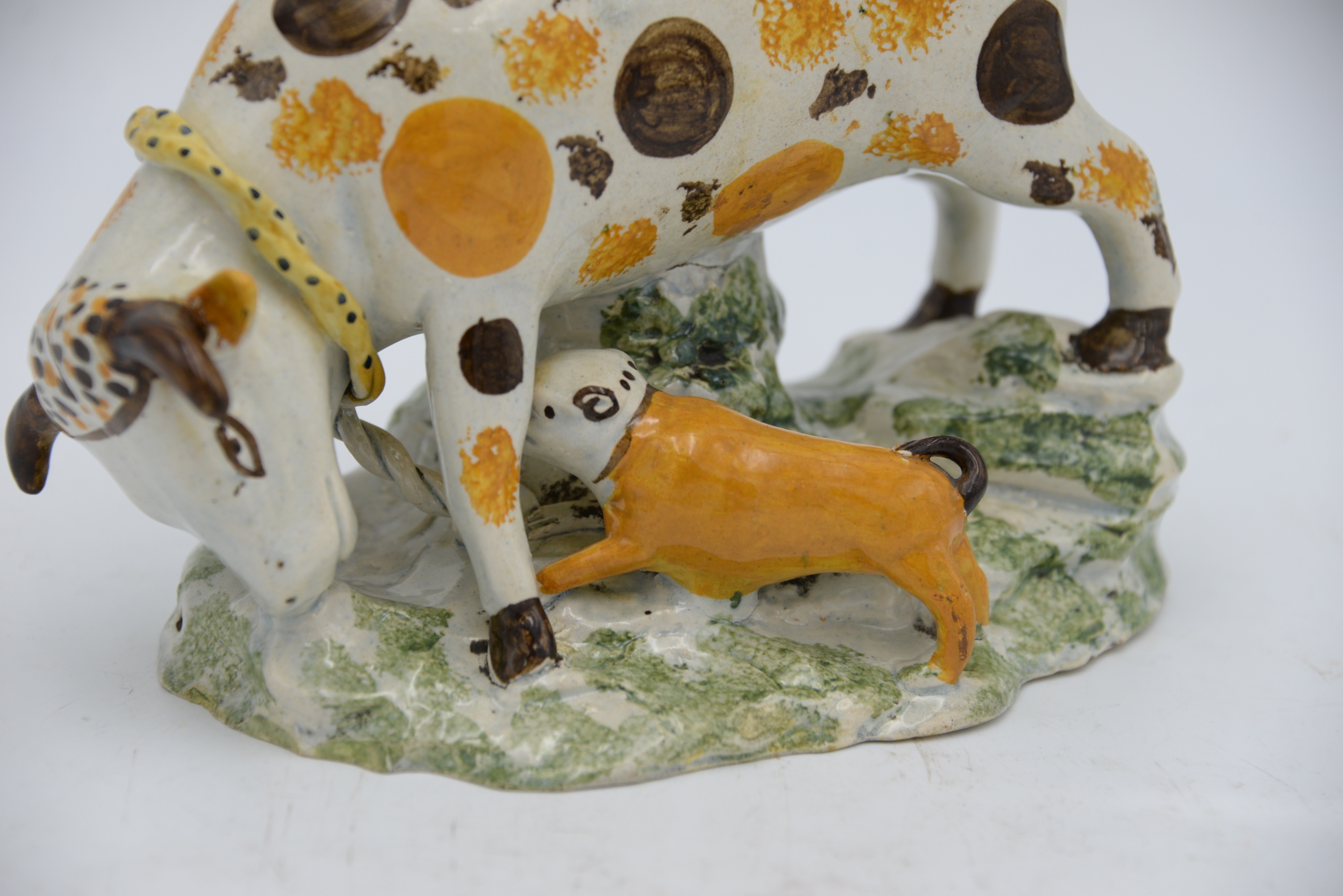 English Staffordshire Bull Baiting Figural Group, pearl glazed, 19th century, painted brown and yellow, (repairs to ears, tails, rope and base), DM & P Monheim’s label on reverse, height 6 1/4 inches.