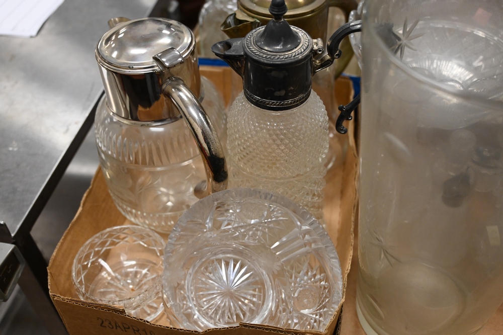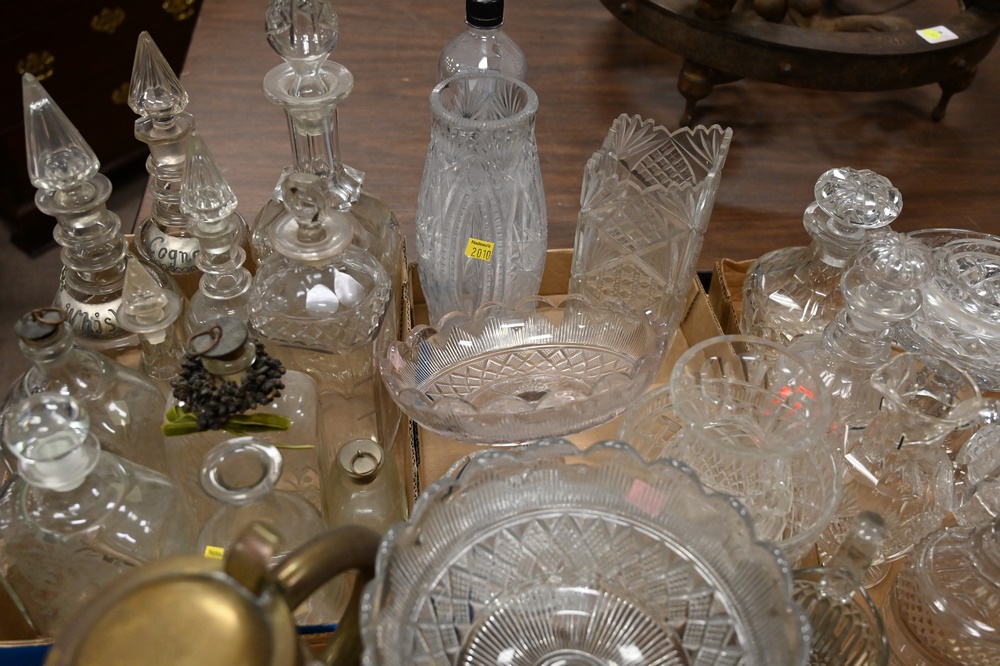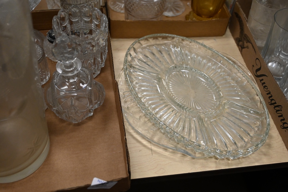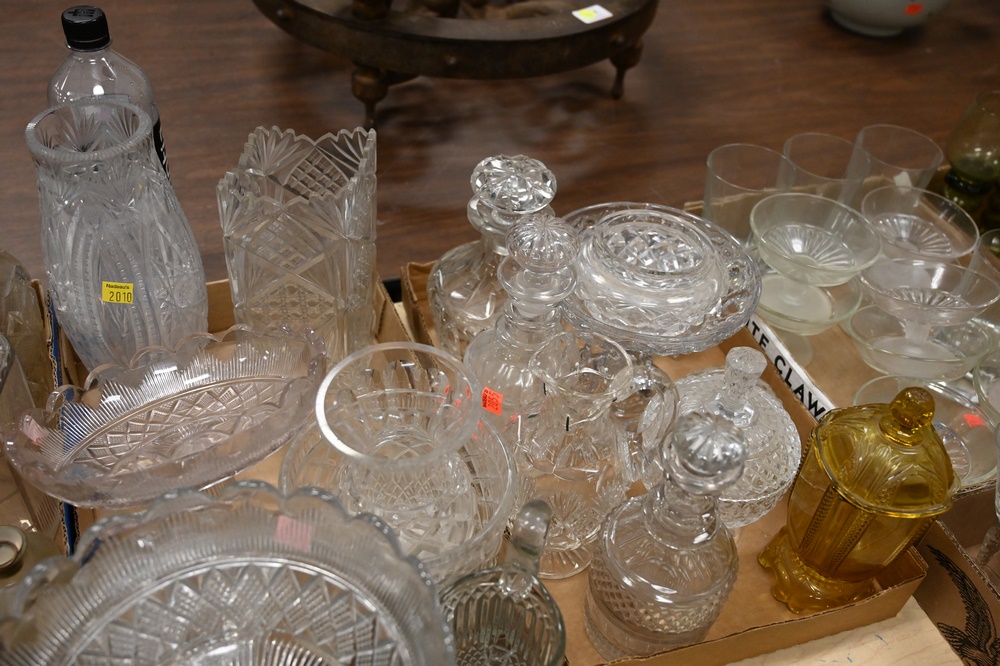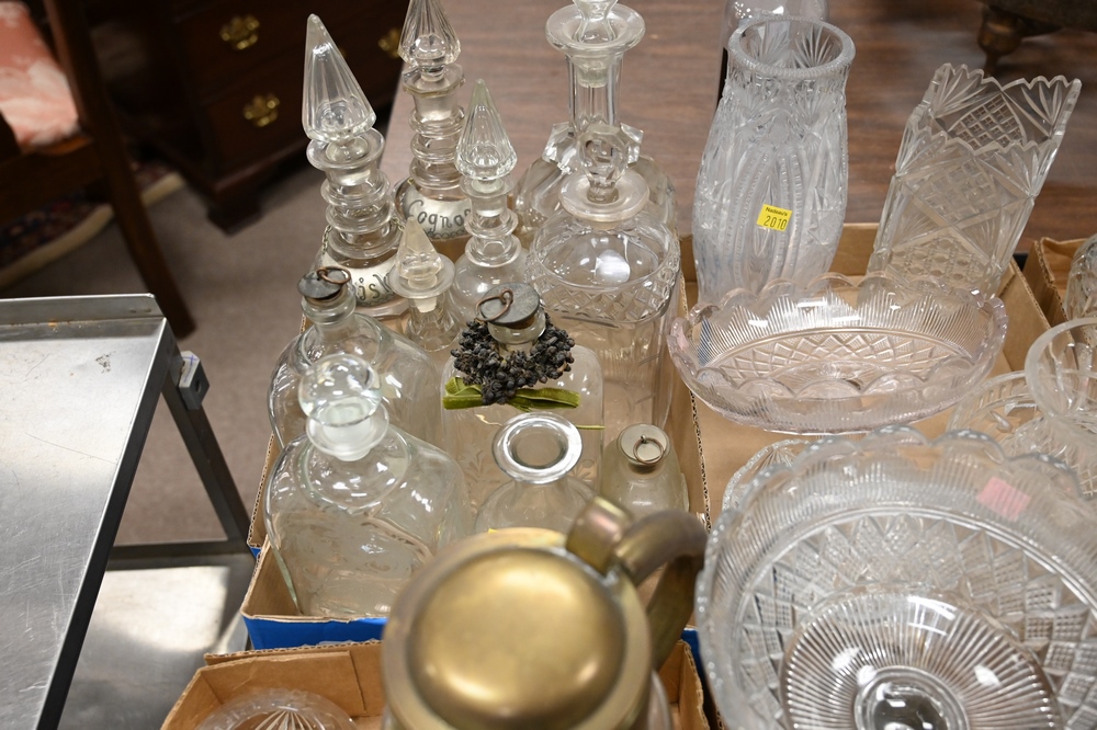 Lot 587: Group of Five Box Lots of Glass, cut glass, pressed glass, to include decanters, pitchers, vases, bowls, and compotes.