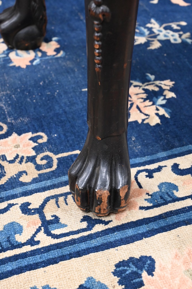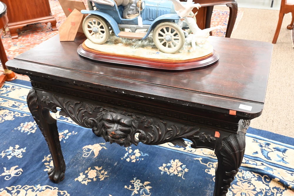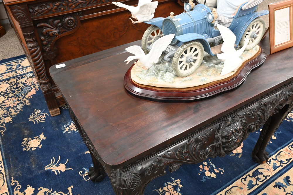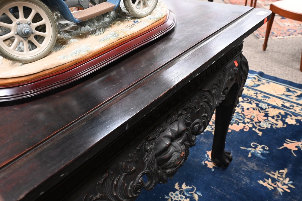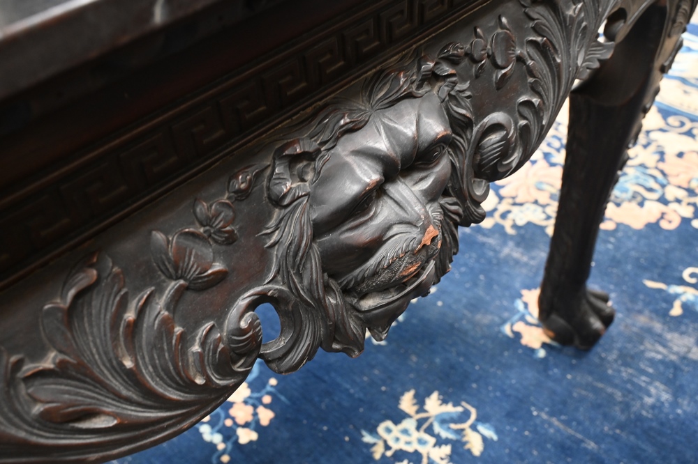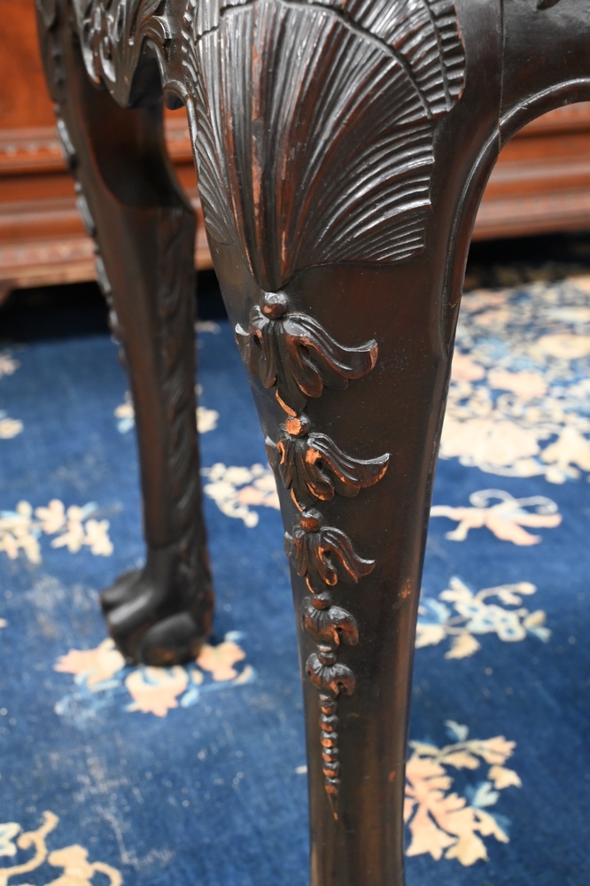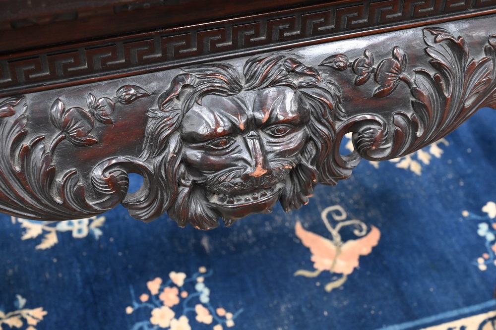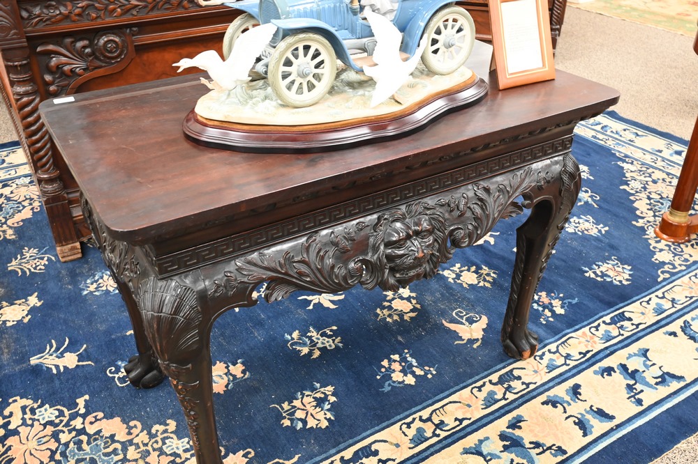 Lot 587: Mahogany Chippendale Style Server, rectangular top over carved and Greek key frieze over scroll and lion face carving, all set on sh…