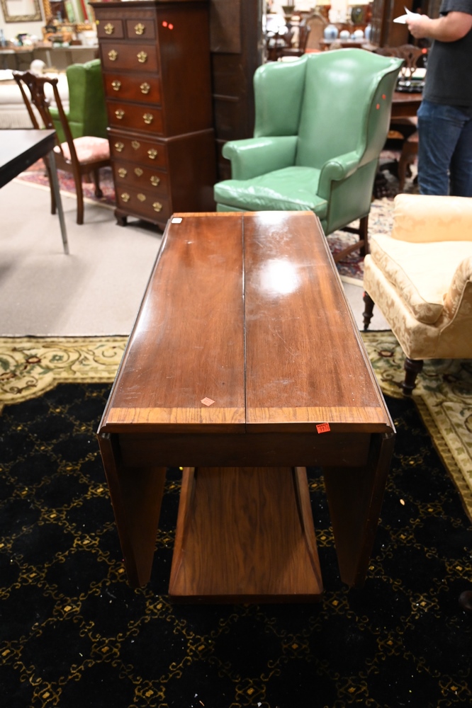 Lot 588: Art Nouveau Style Mahogany Inlaid Dining Table, having banded inlaid drop leaves on pedestal base, height 29 1/2 inches, opens to 45 x 55 inches, closed 19 x 45 inches.