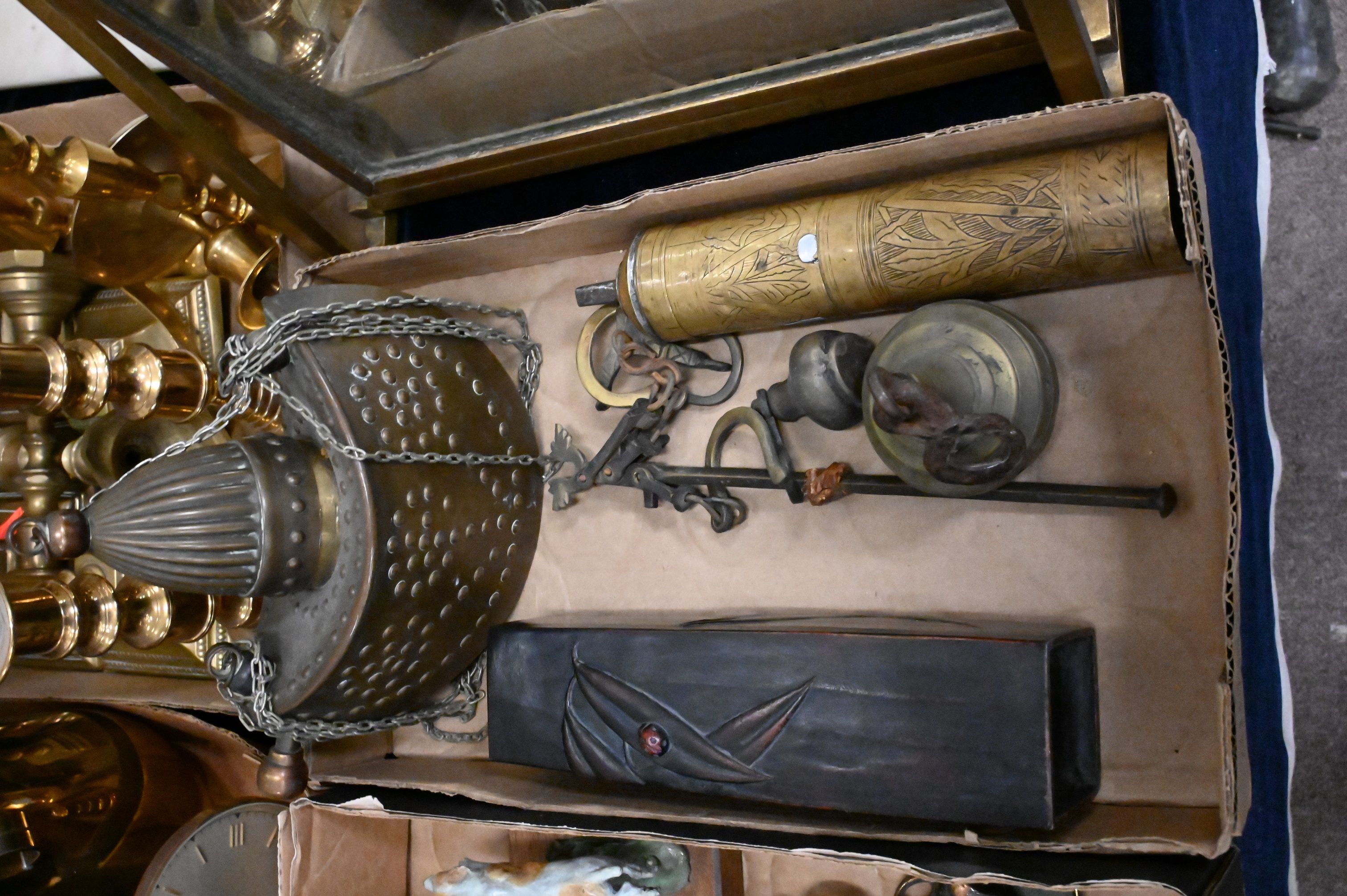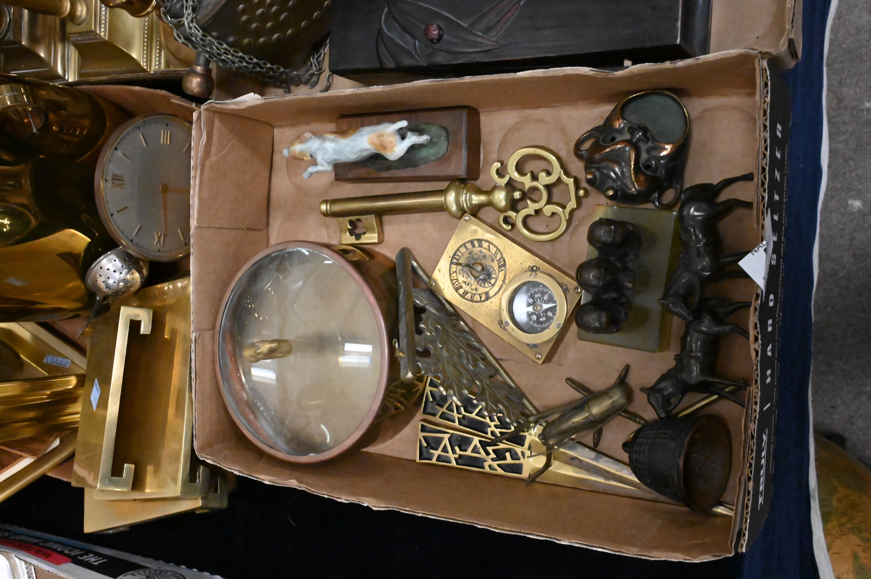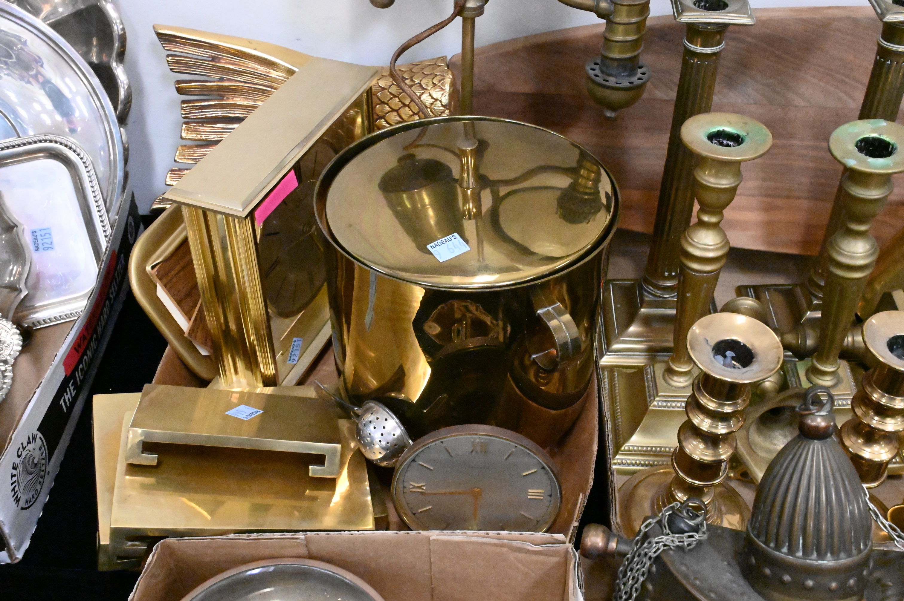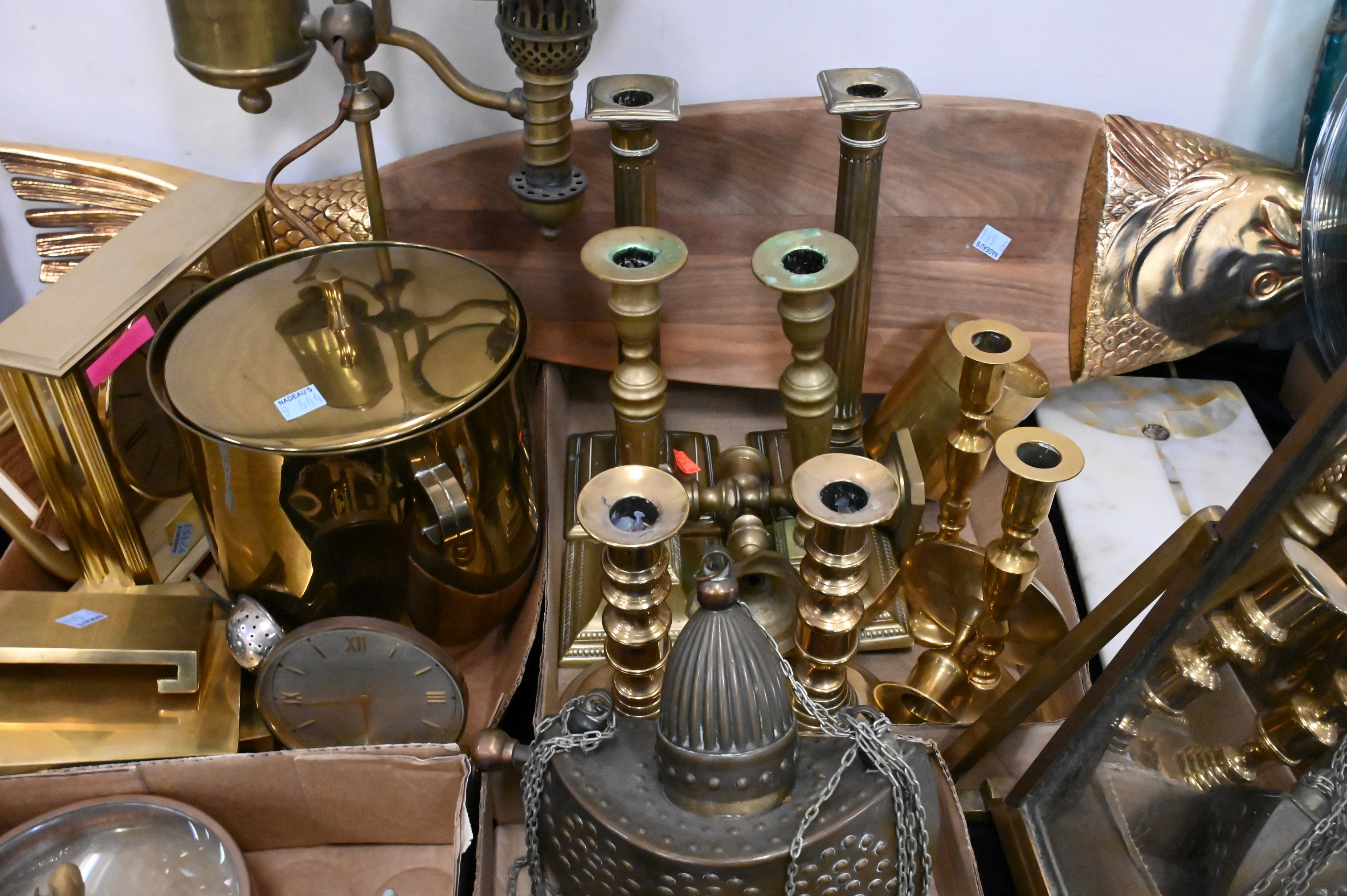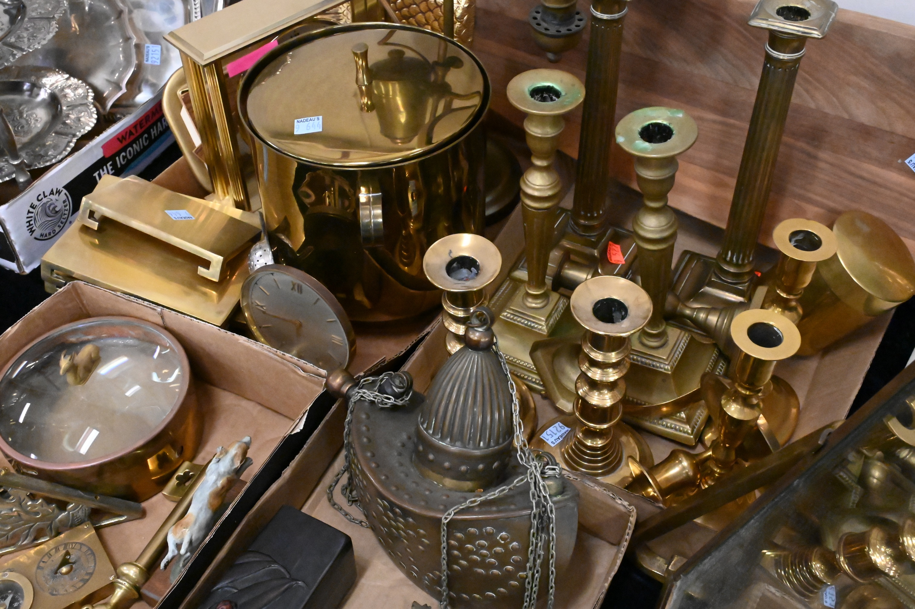 to include square vanity mirror, candlesticks, ice bucket, Bulova Quartz desk clock, Ottoman Islamic weight/scale, sundial and compass, large fish platter etc..