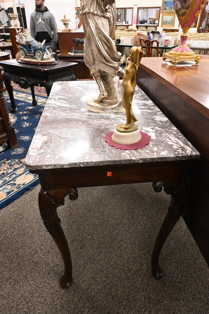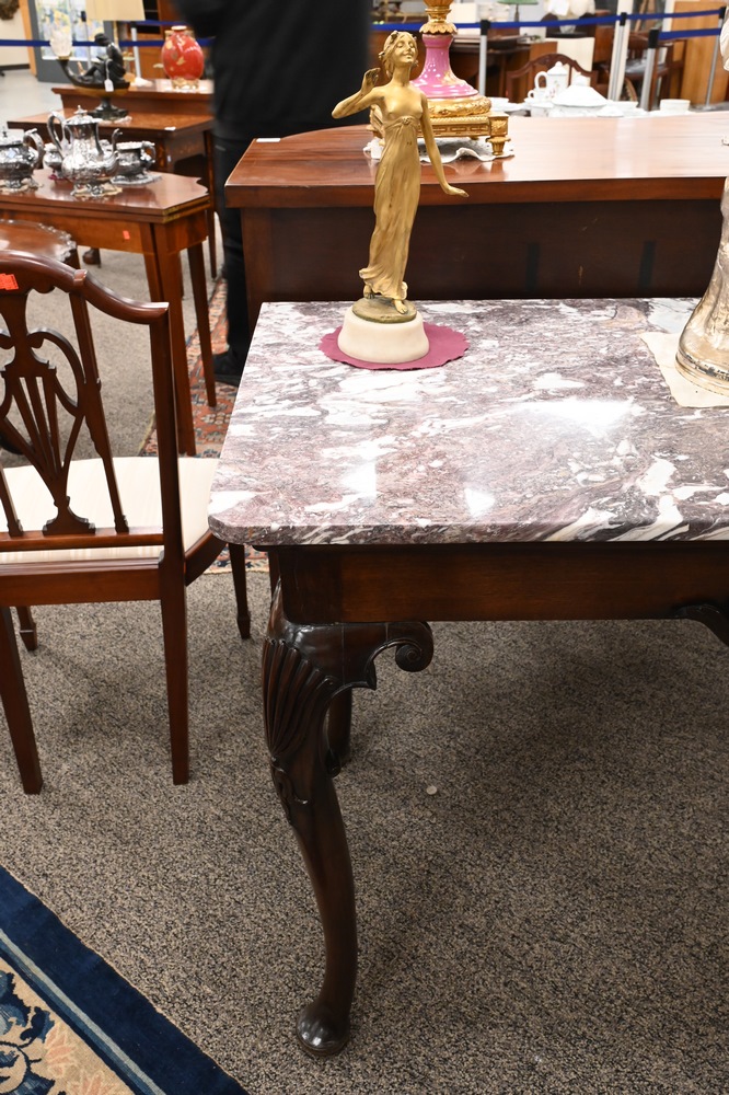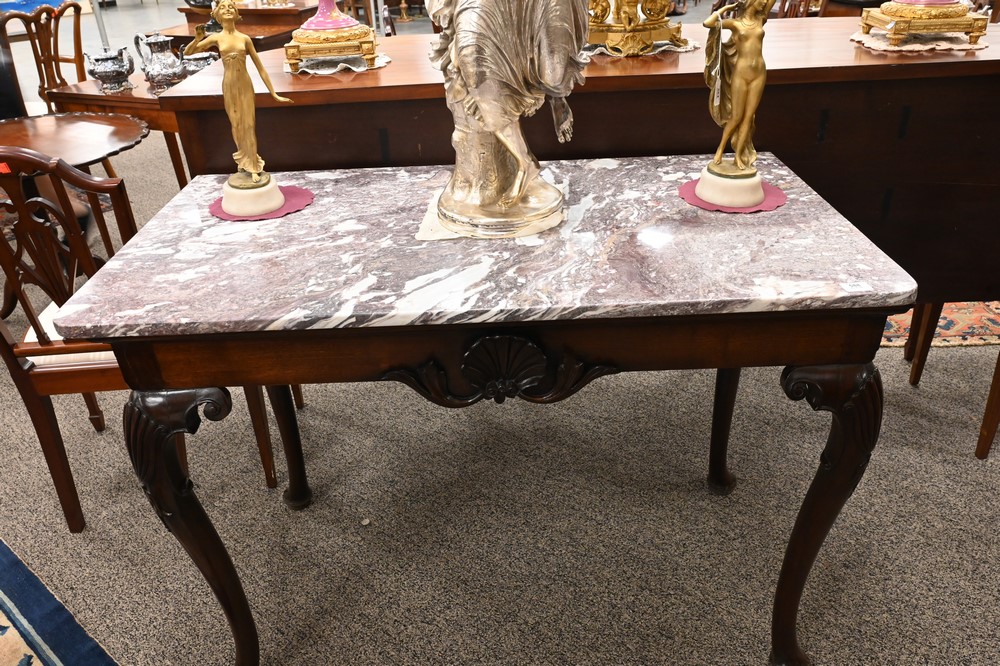 Lot 588: George II Mahogany Pier Table, having marble top over center shell carving, set on four shell carved cabriole legs ending in pad fee…