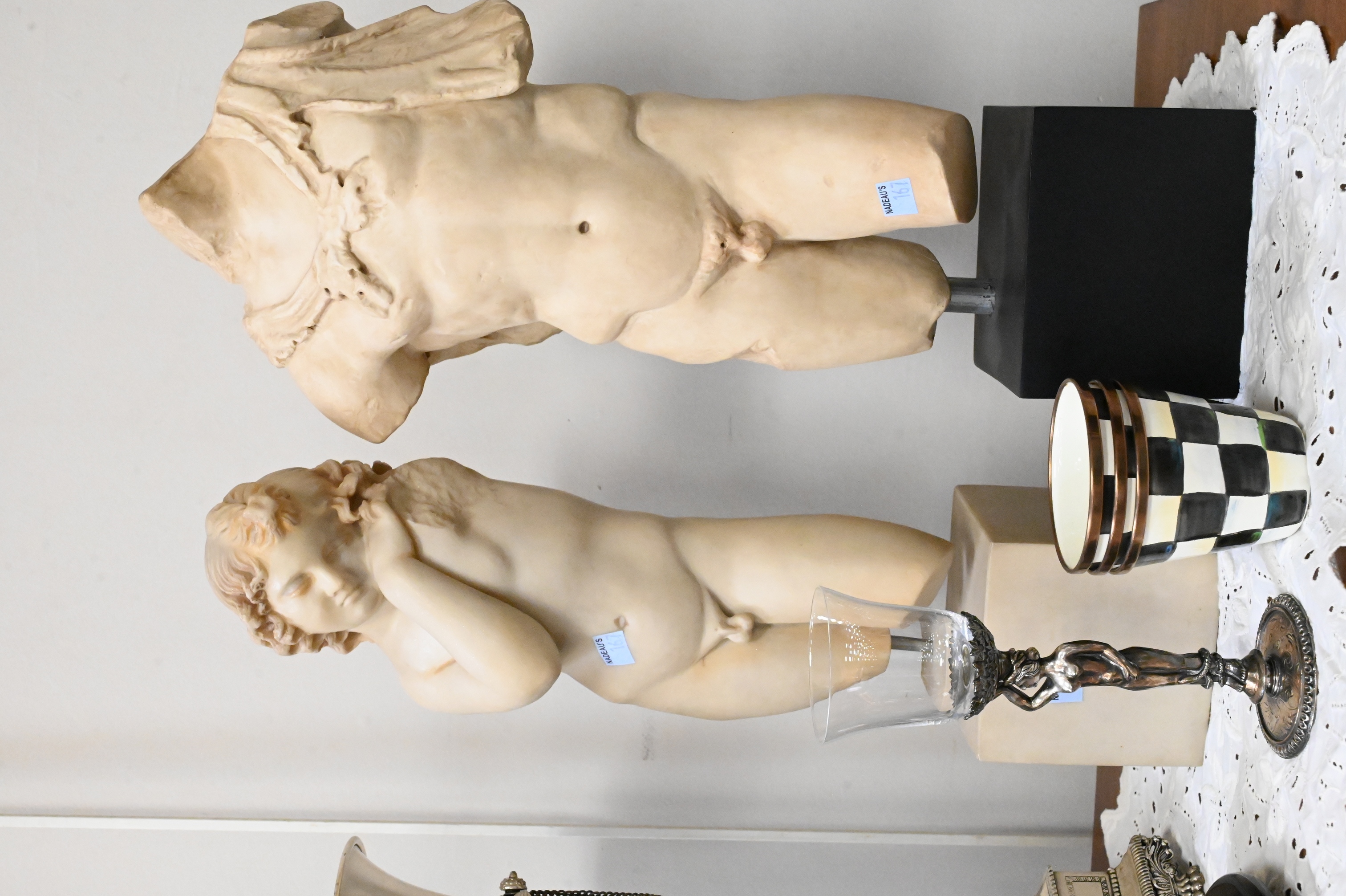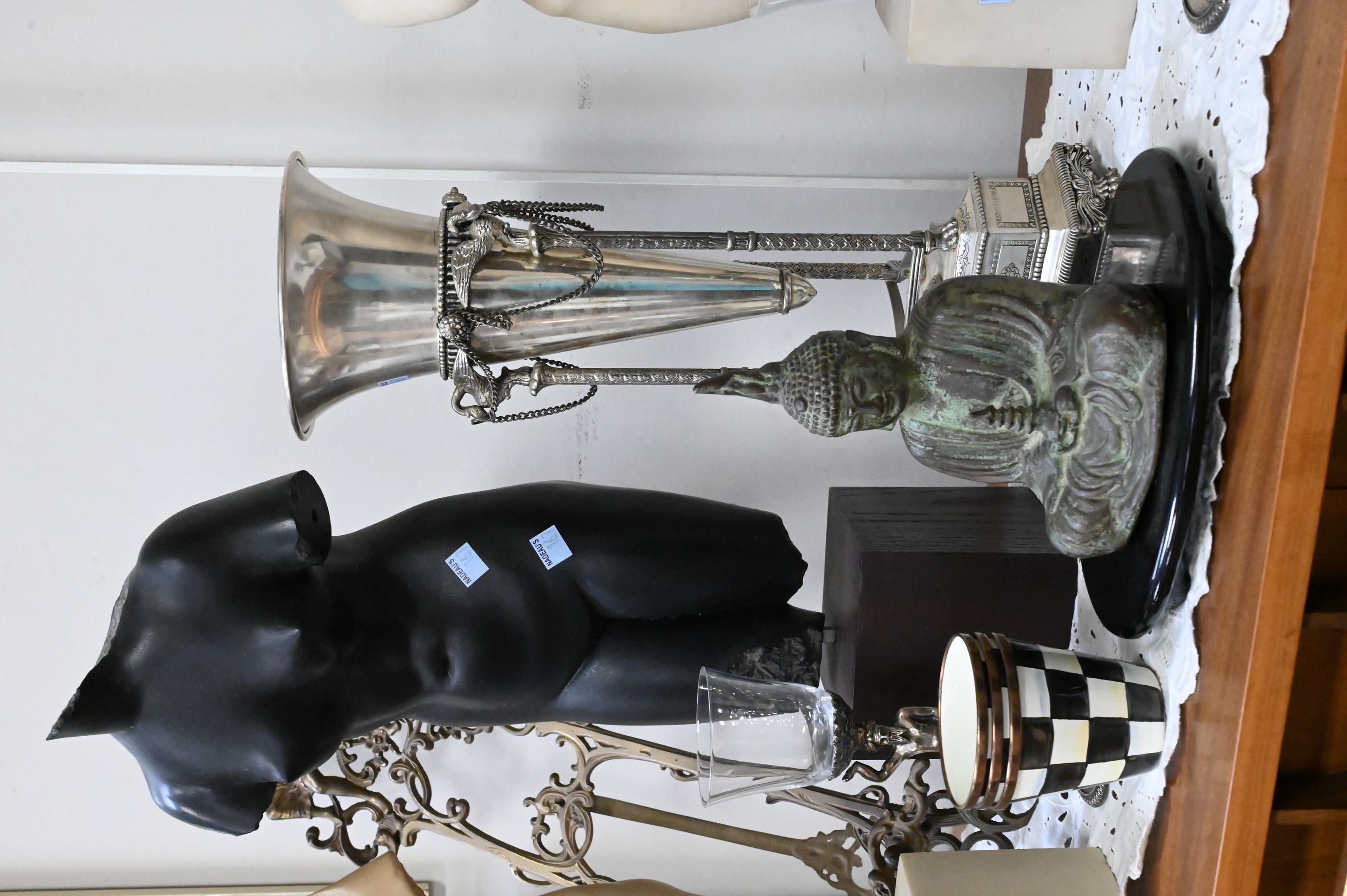 to include Bombay silver plated hurricane montte vase, pair of Phillipe Chapin silver plated Adam and Eve figural stems, brass desk easel, four classical nude figures, bronze Buddha figure along with a set of six MacKenzies child caps