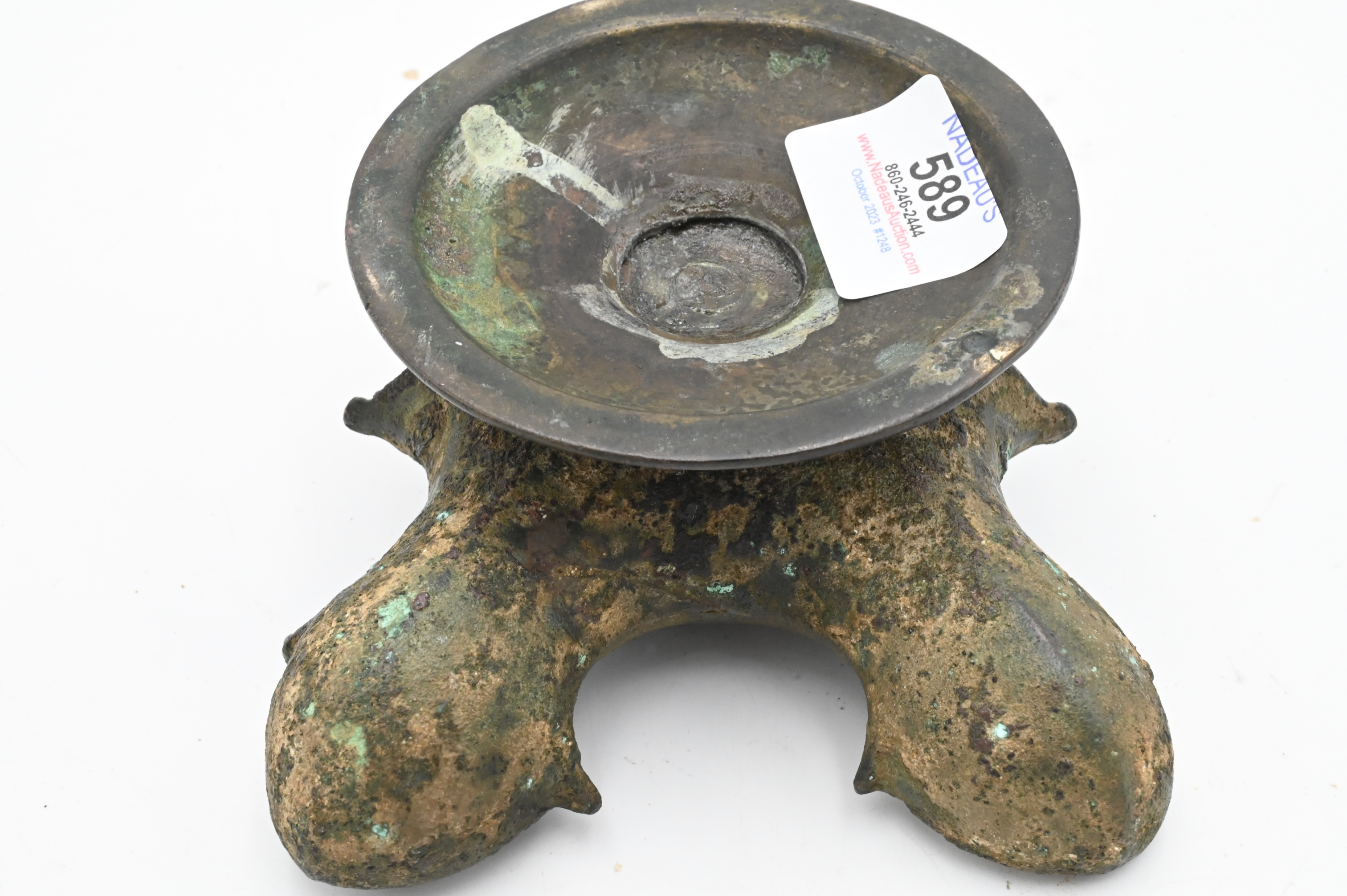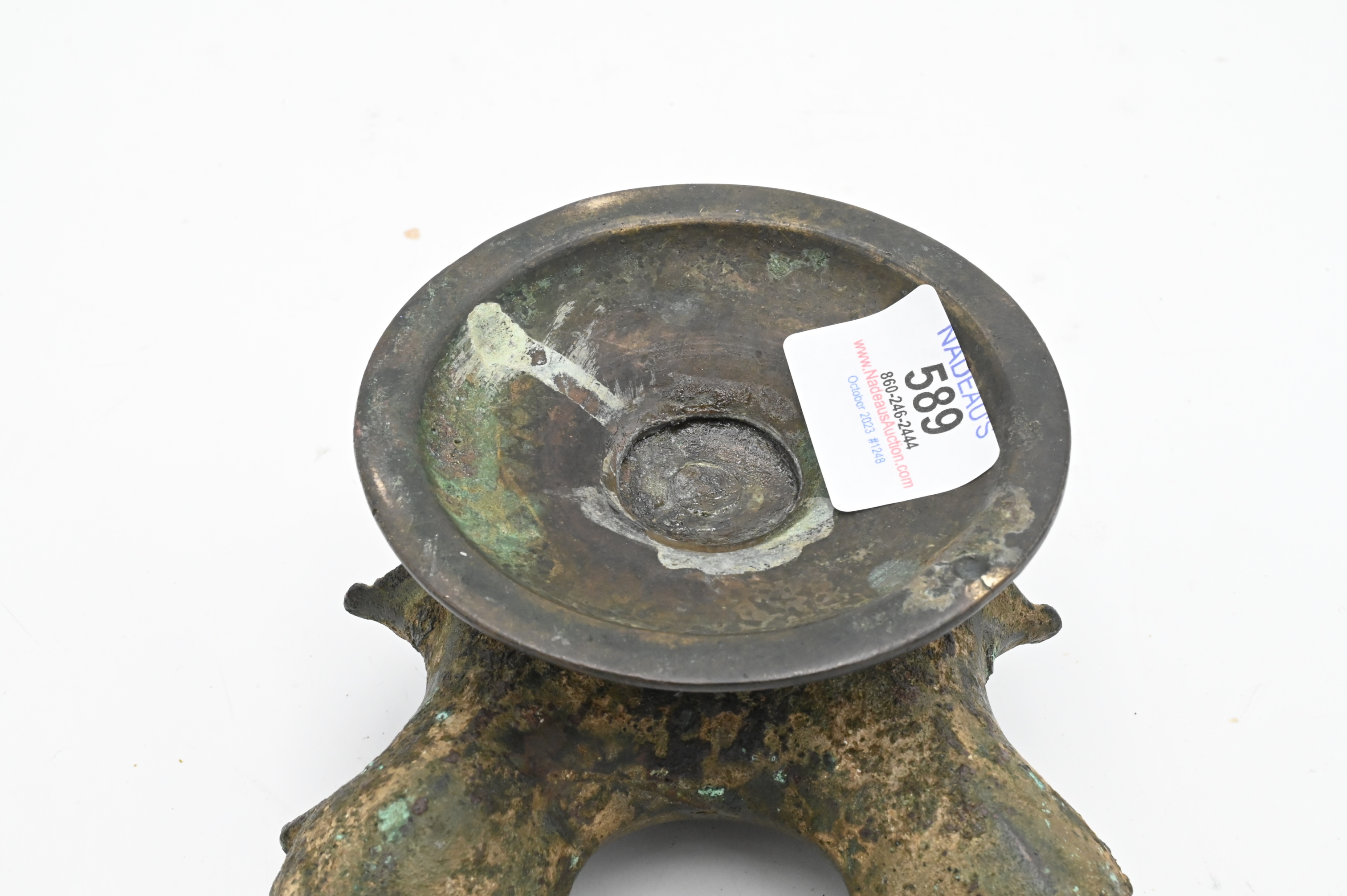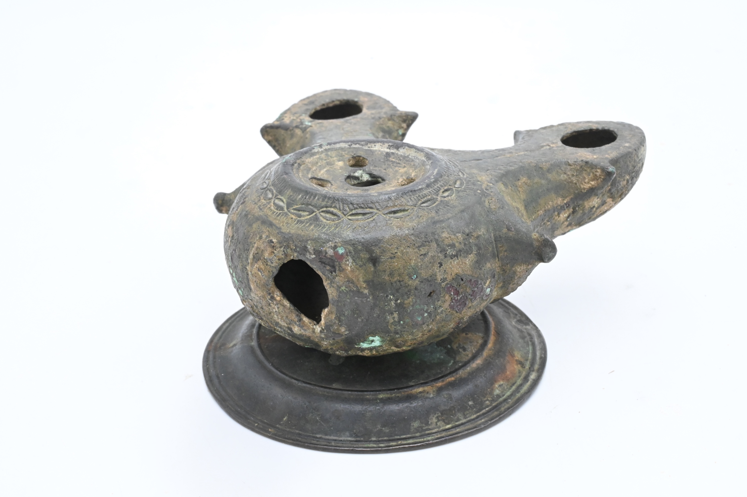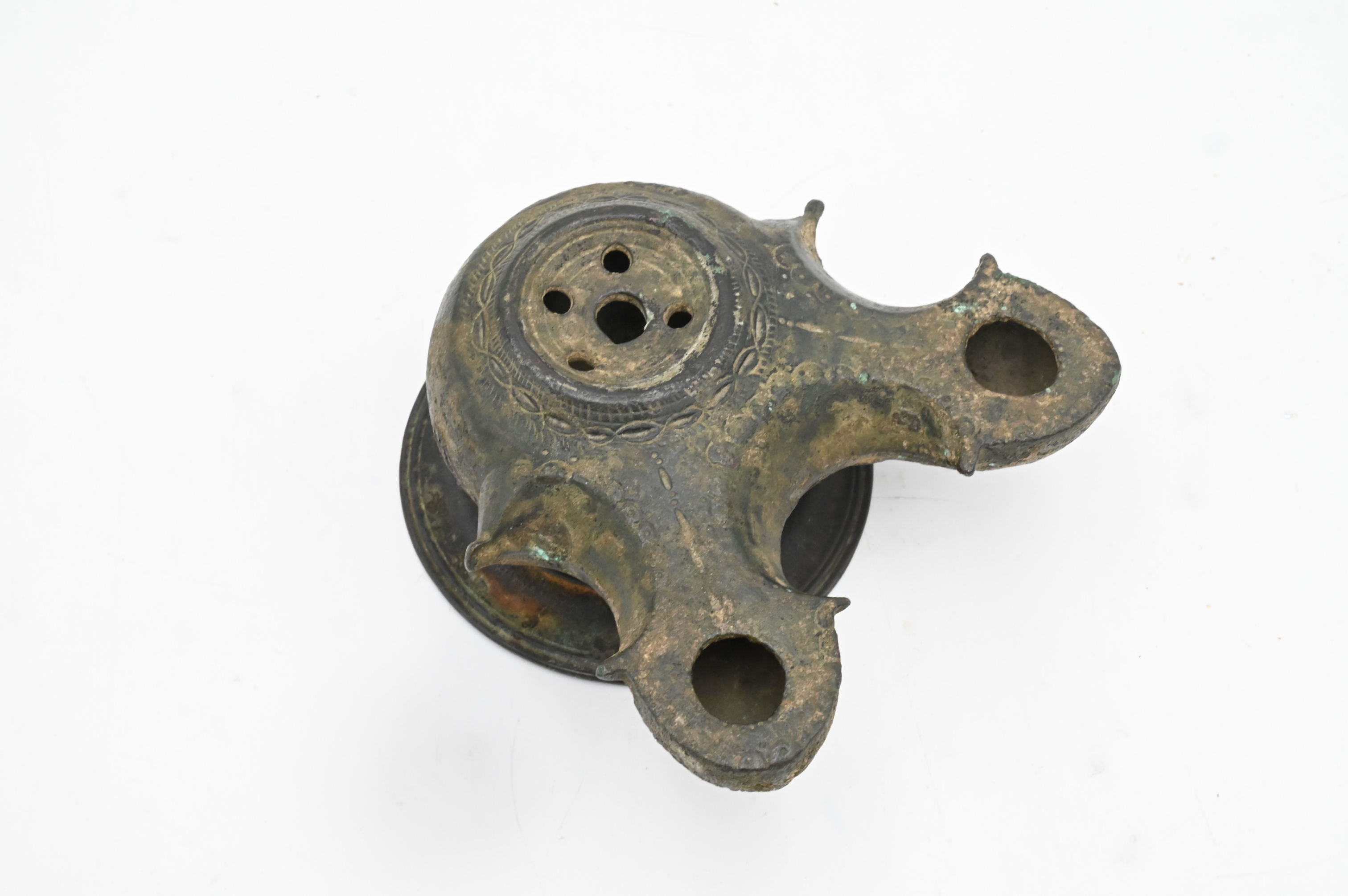 Lot 589: Byzantine Bronze Two-Spouted Oil Lamp