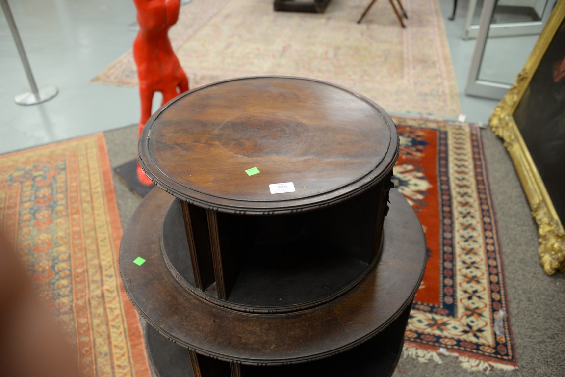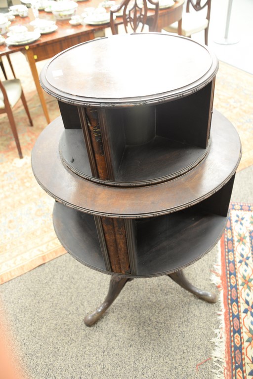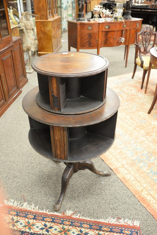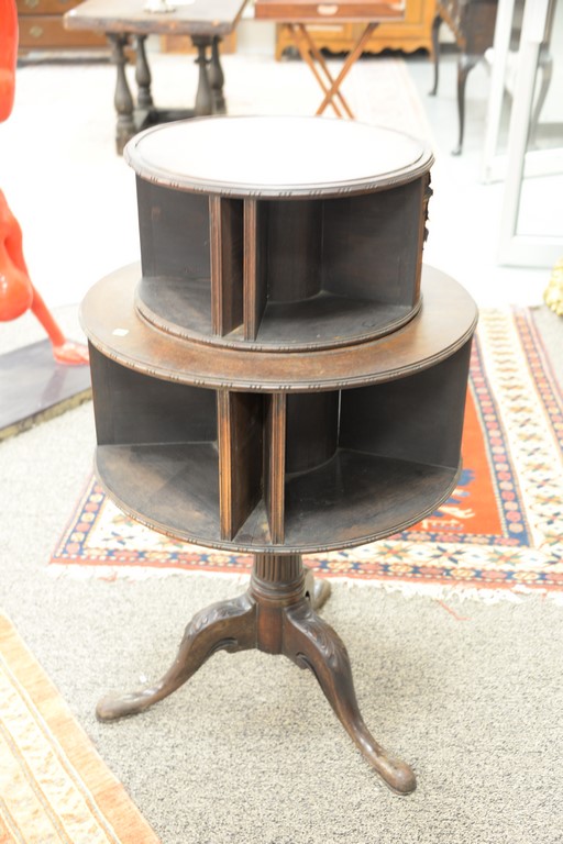 Lot 589: George IV mahogany two tier revolving book stand, each revolving tier with faux books, all set on fluted column on tripod base, Engl…