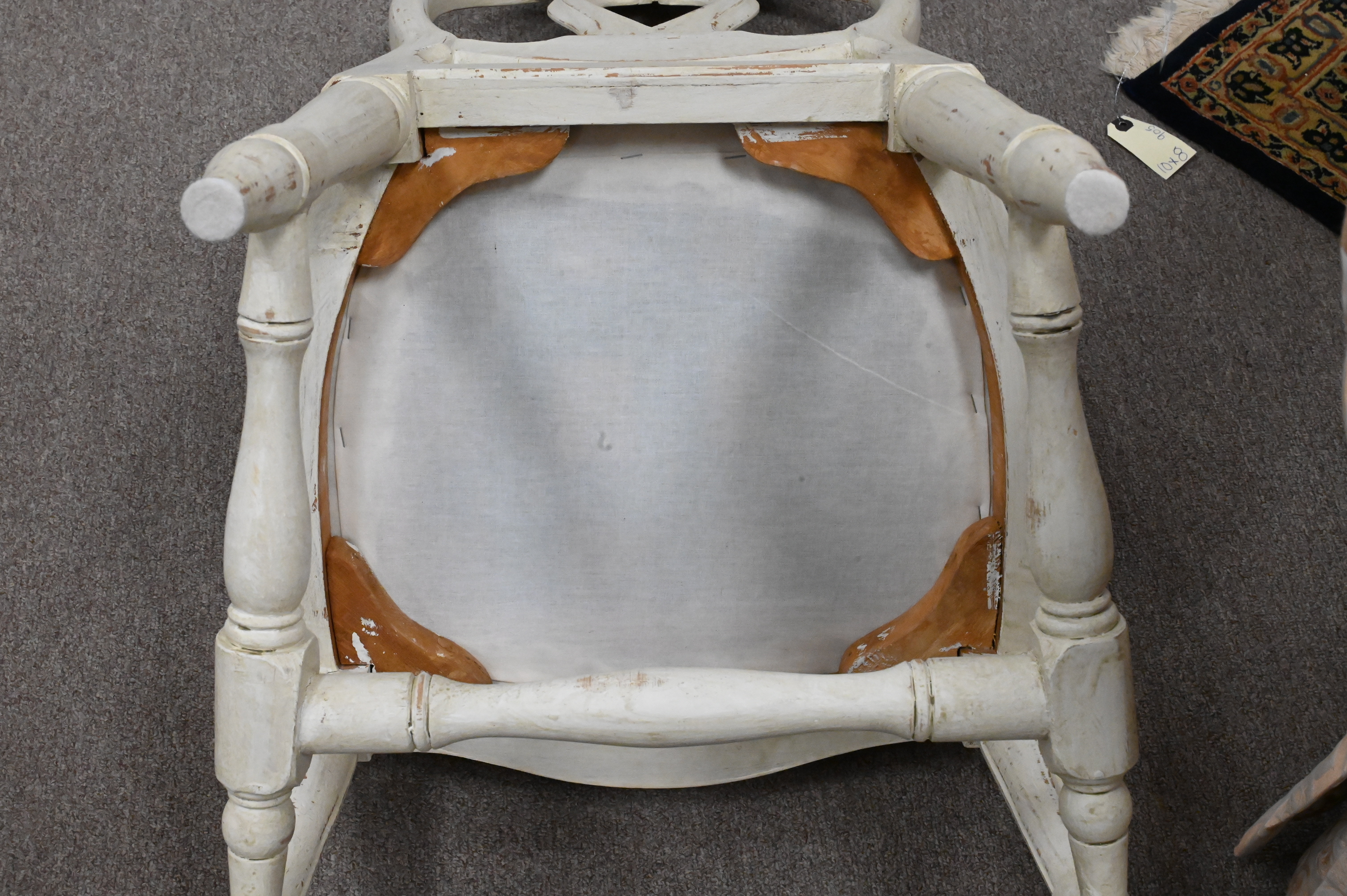 carved and painted frame having open urn form oval back, custom upholstered cushion set on H stretcher cross bar and turned legs