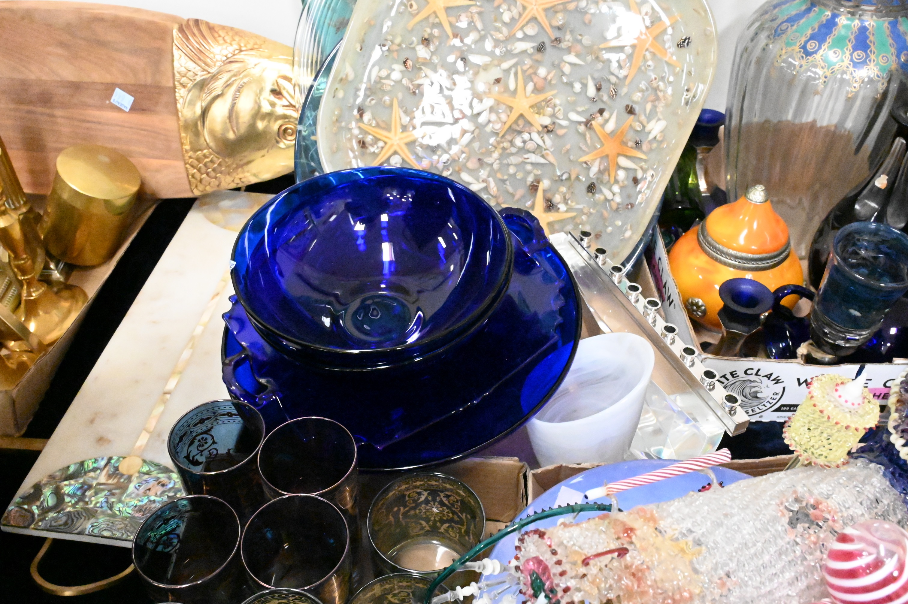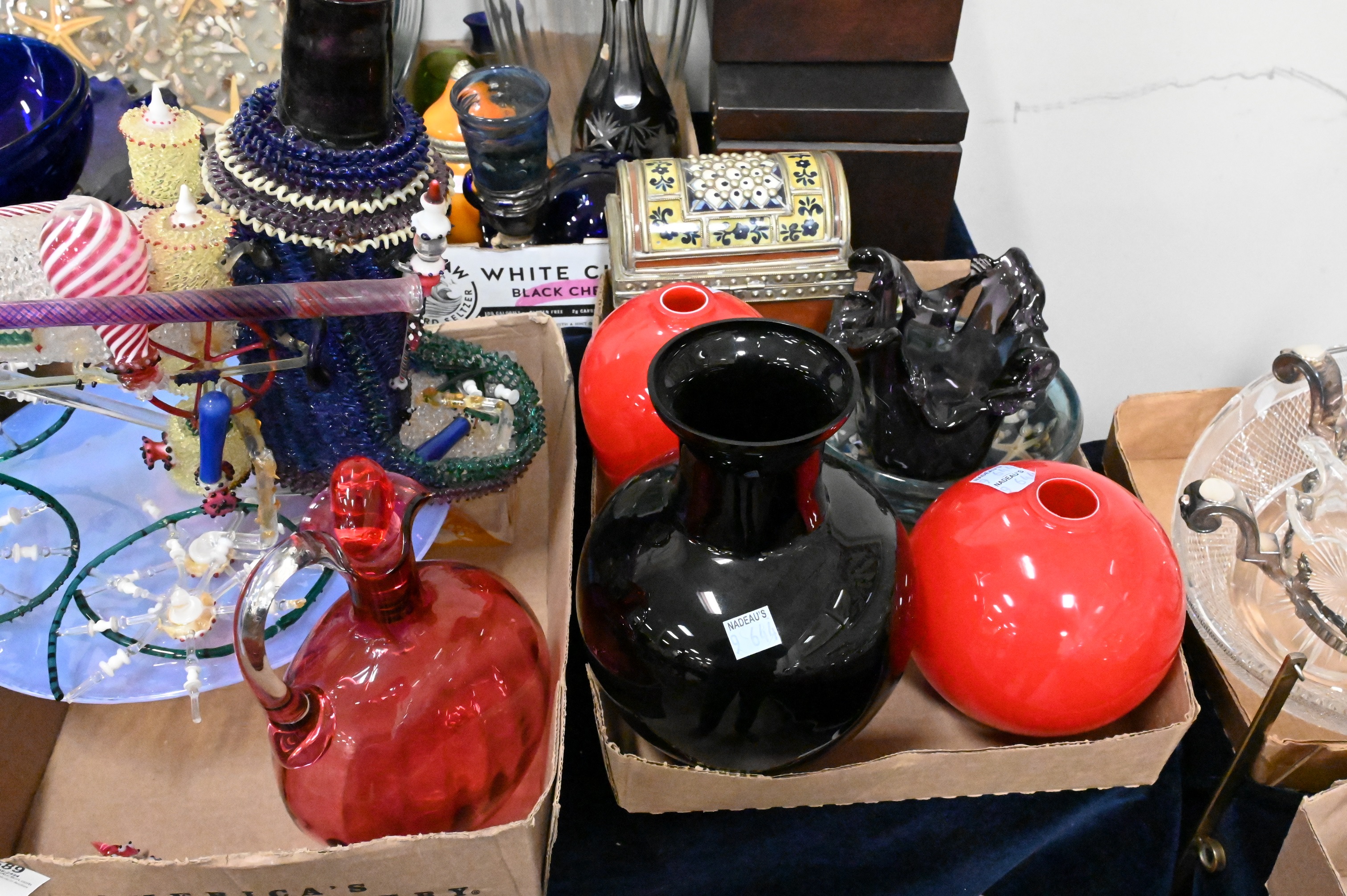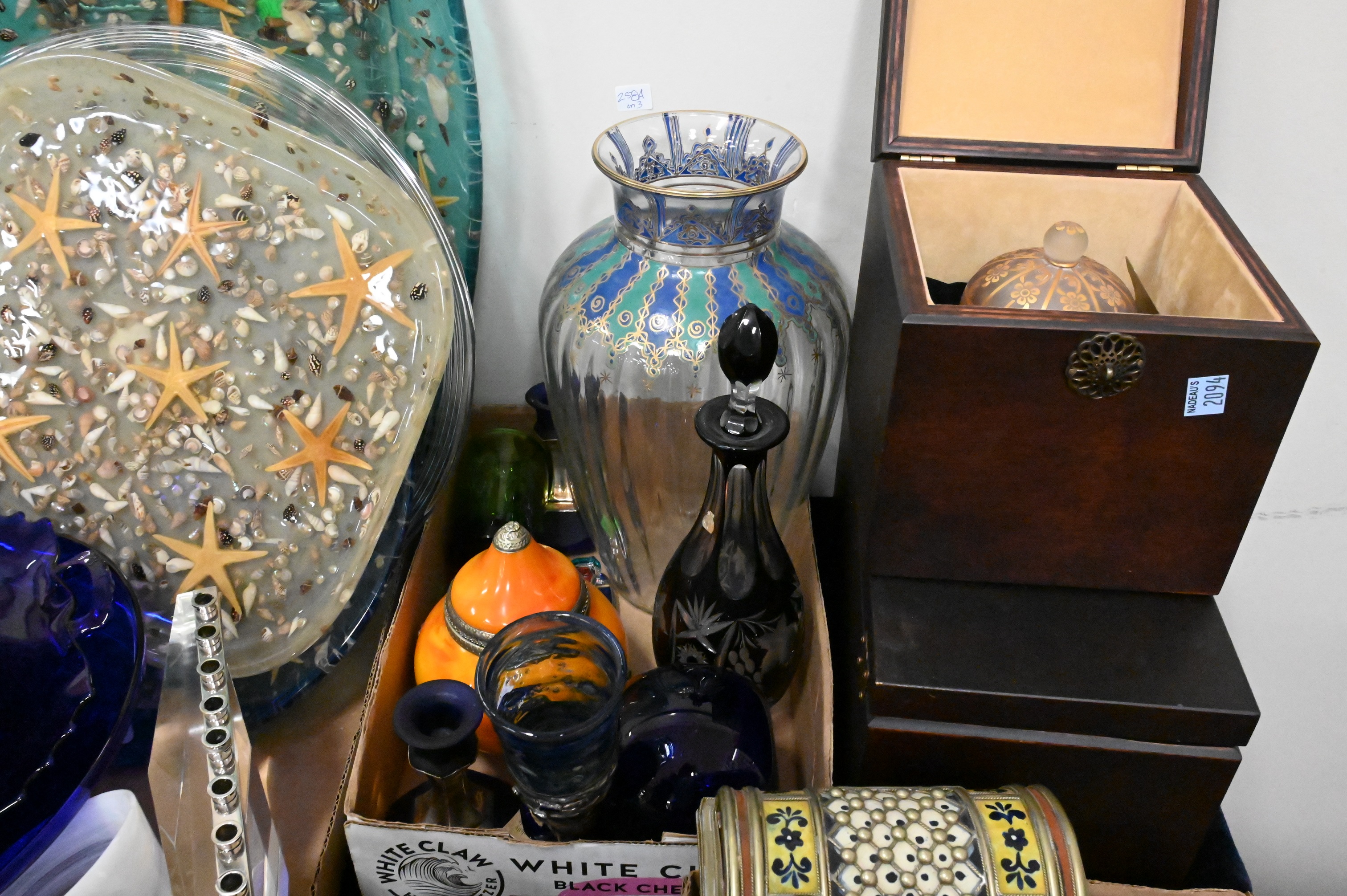 to include Turkish vases in wooden boxes, Venetian vase with gilt accents, moser style glasses, cobalt dishes, decanter, Laslo for Mikasa vases, Tuscan Square seashell platters etc…