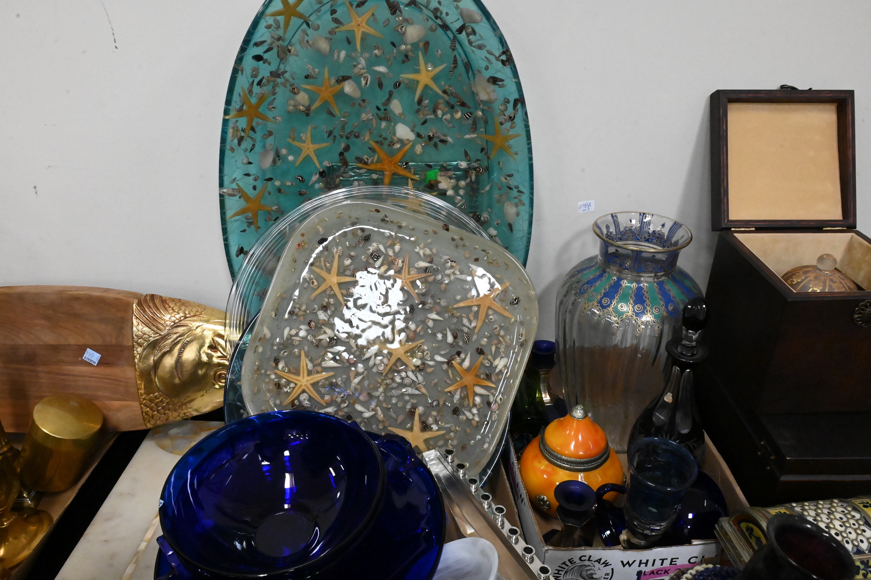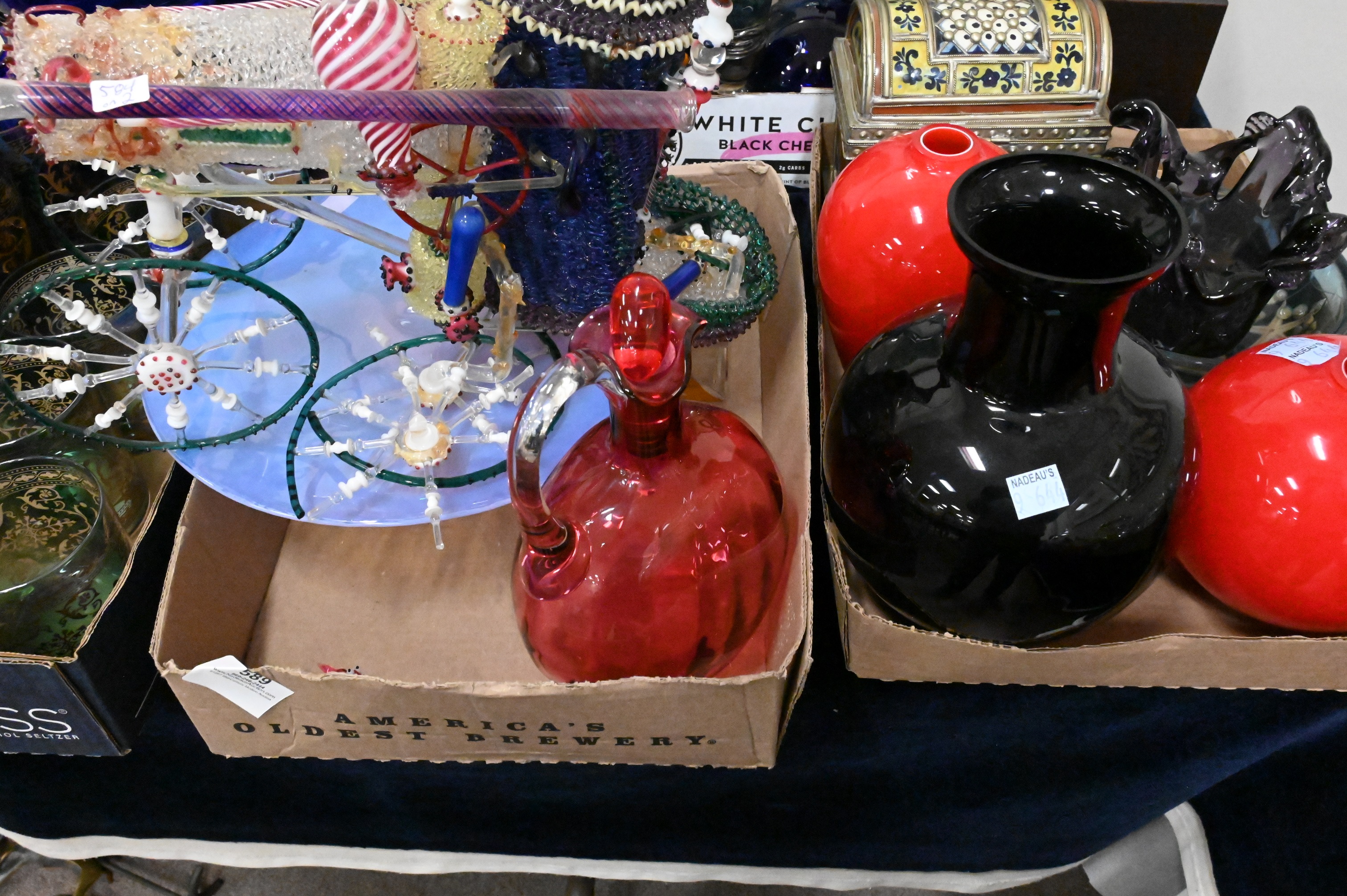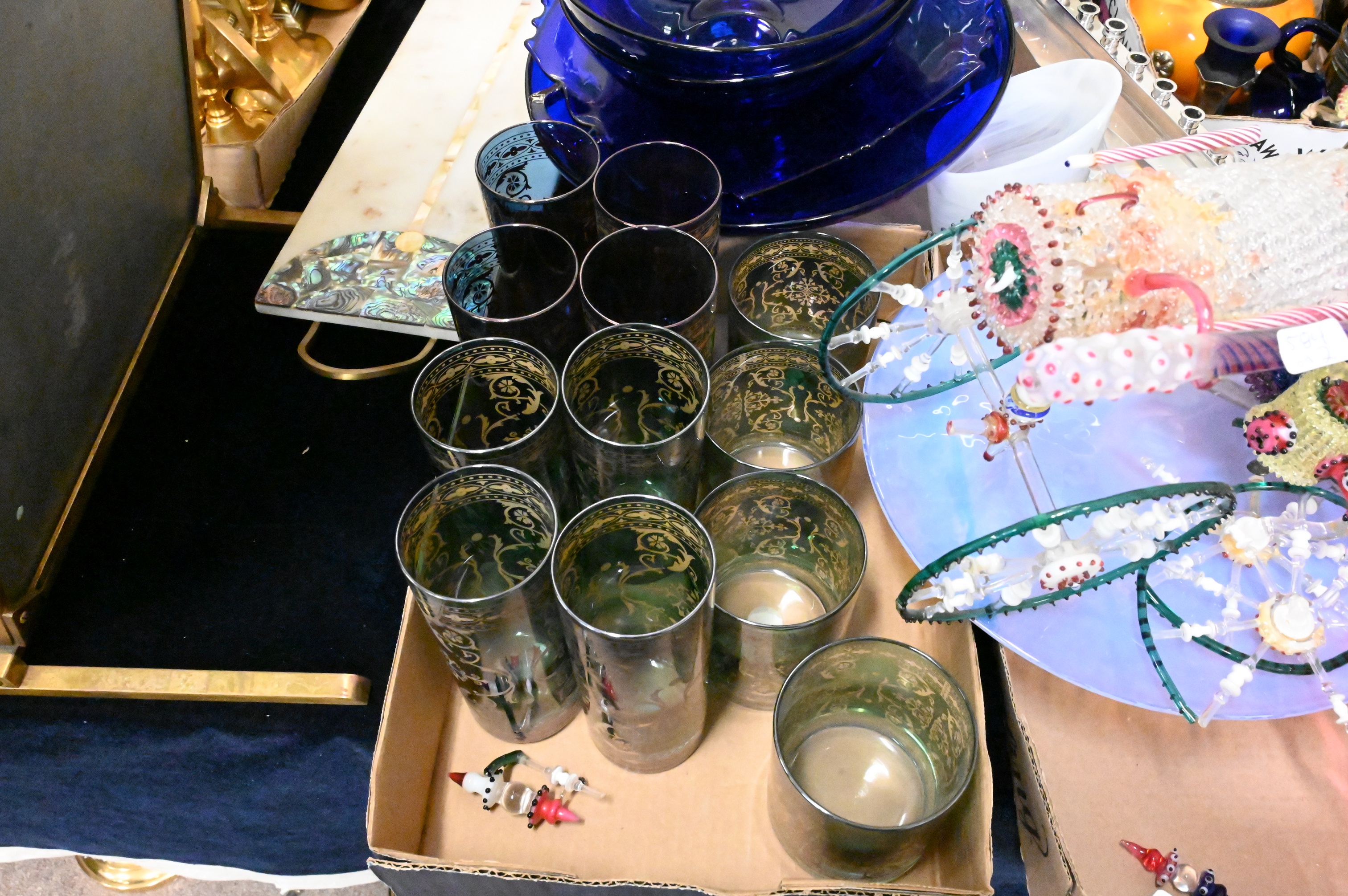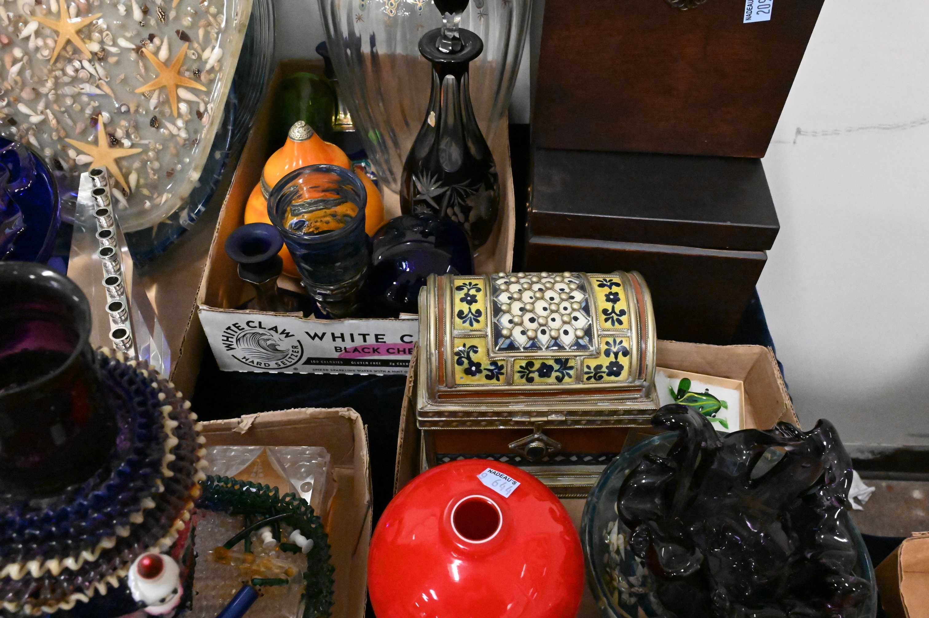 to include Turkish vases in wooden boxes, Venetian vase with gilt accents, moser style glasses, cobalt dishes, decanter, Laslo for Mikasa vases, Tuscan Square seashell platters etc…