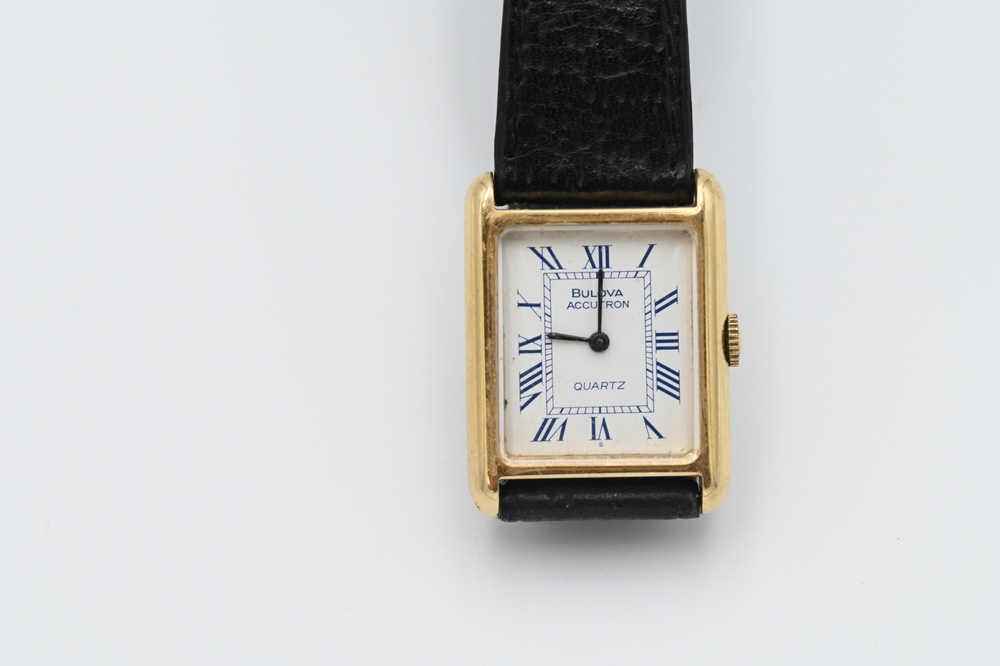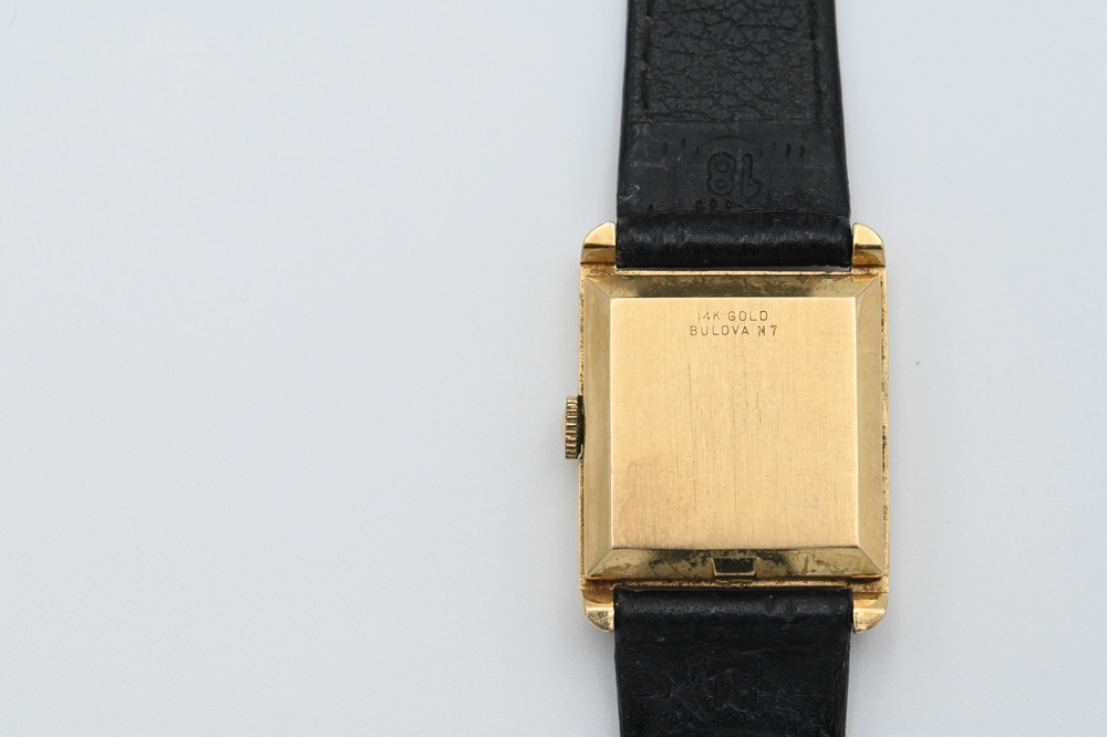 Lot 59: 14 Karat Gold Bulova Accutron Square Mens Wristwatch, 23 millimeters.
