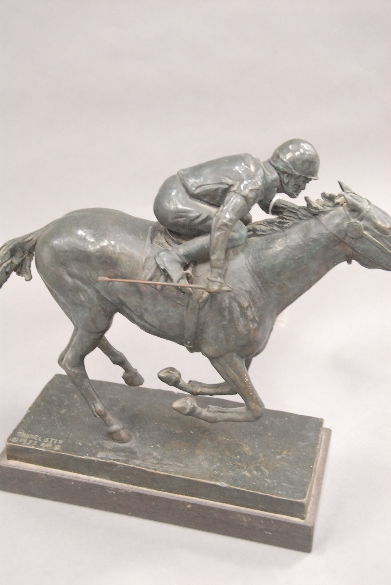 Bronze on a marble base of a horse and jockey in a race, signed Daniel Stixs 1983 artists proof.
