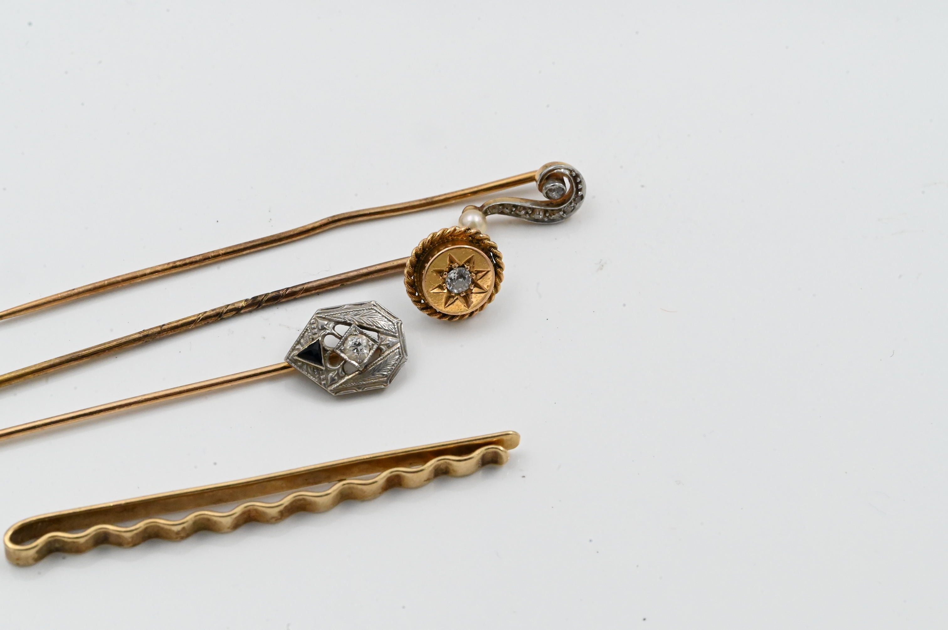 to include three stick pins all with small diamonds along with one Tiffany and Company 14K hair pin